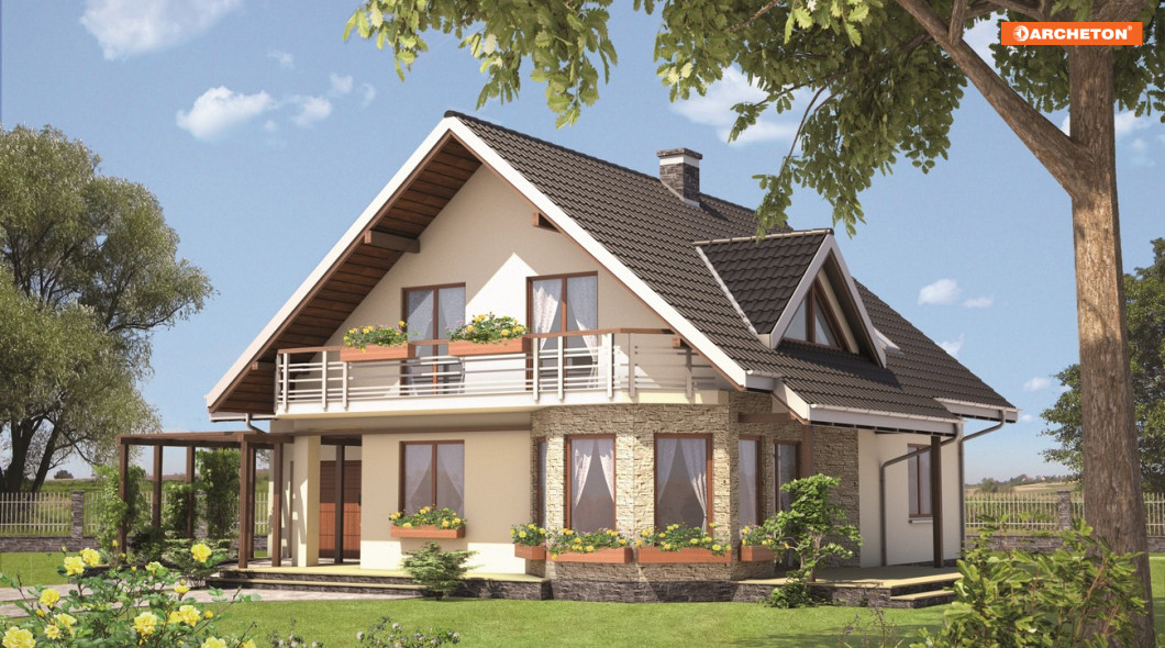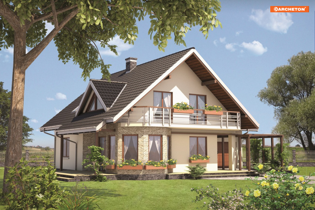 Projekt domu Filipinka jest rozwiązaniem, które spośród innych parterowych propozycji z użytkowym poddaszem średniej wielkości wyróżnia kilka elementów. Są nimi głównie: schemat planu w kształcie litery T i jadalnia w ośmiokątnym, narożnym ryzalicie. Przenikające się dwuspadowe dachy nad częścią mieszkalną i garażową urozmaica tylko jedna mała trójkątna lukarna nad podcieniem tarasu ogrodowego w ścianie bocznej. Budynek zwraca się do wjazdu szczytem korpusu mieszkalnego. Niższa część garażowa ustawiona jest ku frontowi kalenicą. Sylwetka ta przypomina koncepcje mniejszej Mai Tytan i zbliżonych rozmiarem: Tezeusza czy Ametysta – projektów, które także mają dodatkowy pokój na parterze. Żaden z nich nie oferuje jednak kuchni bezpośrednio oświetlonej oknami z dwóch stron świata, z wglądem na drzwi wejściowe Jest to możliwe za sprawą ulokowania garażu głębiej na działce i uformowania podcienia w bryle mieszkalnej. Strefa dzienna w projekcie domu Filipinka pozostaje otwarta ale ma wyraźnie oddzielony salon. Część nocną stanowią cztery pokoje poddasza, w tym główna sypialnia z prywatną garderobą. Balkony urozmaicają wszystkie trzy ściany szczytowe.