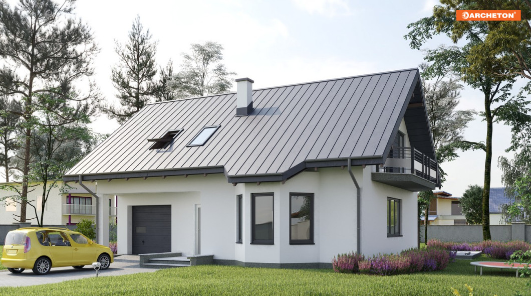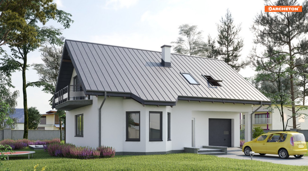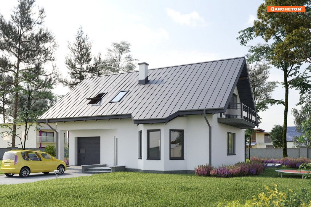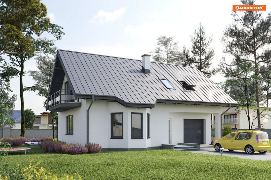 Niezbyt stromy dach i niewysoka, horyzontalna bryła wyróżnia projekt domu Spinka w grupie domów parterowych z użytkowym poddaszem i wbudowanym garażem o powierzchni ok. 95m2. Jest to też jedyna propozycja w tej grupie z ryzalitem w elewacji frontowej, przypominająca mniejsze rozwiązania z Rodziny Calineczki. W Spince dwuspadowy dach z kalenicą równoległą do drogi dojazdowej jest dłuższy i przekrywa także część garażową umożliwiając wykorzystanie dodatkowej powierzchni poddasza. Wejściowa, narożna wnęka obejmuje swoją szerokością wjazd do garażu i trakt z sienią oraz z wc i kotłownią dostępnymi z holu. Pełną rozpiętość dwuspadowego dachu wykorzystuje druga część parteru, którą zajmuje strefa dzienna z zabiegowymi, częściowo otwartymi schodami na poddasze. Oparcie konstrukcji na na centralnie usytuowanym słupie stworzyło niebanalny układ kuchni z oktagonalną jadalnią przekrytą przedłużonym okapem dachu oraz z barkiem, który integruje otwarty hol z salonem. Poddasze w projekcie domu Spinka zajmują cztery sypialnie i łazienka. Pokoje doświetlono bez użycia lukarn, głównie tradycyjnymi oknami i otwarto na długie balkony w ścianach szczytowych.