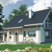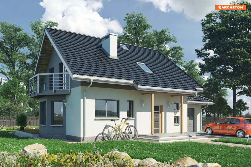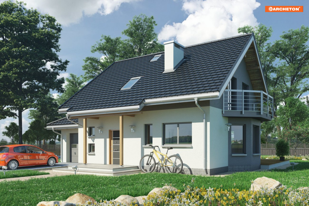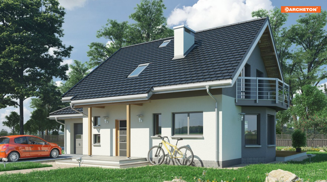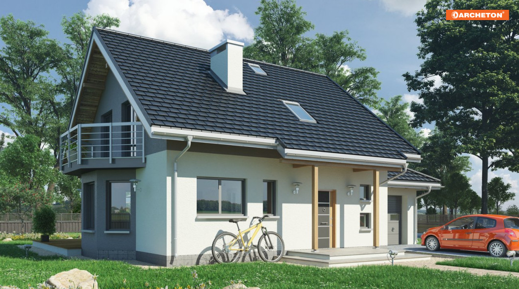 Tylko w Rodzinie Chabra znaleźć można projekty domów z użytkowym poddaszem o powierzchni ok.100-145m2, z dobudowanym garażem, z dodatkowym pokojem na parterze, a przy tym z częściowym lub pełnym podpiwniczeniem. Projekt domu Chaber 2 to średnia wielkością wersja, jedna z kilku z ryzalitem w ścianie bocznej. We wszystkich, środkiem zwartego rzutu części mieszkalnej biegnie ściana nośna tworząc na parterze strefy: wejściową ze schodami i z otwartą kuchnią oraz ogrodową z dwoma pokojami. Taka konstrukcja dzieli również piwnice z dużą kotłownią na dwie części, ułatwiając indywidualne ustalenie zasięgu kondygnacji podziemnej. Podobnie na poddaszu: ścianka pod kalenicą dwuspadowego dachu zamyka na połowach planu dwie większe sypialnie oraz komunikację z dużą łazienką i małym pokojem. Garaż, wymagając głębszego traktu znalazł się w dobudowanej części przyziemia, przy ścianie bocznej i przekryty został (jak w wariancie Rex) wielospadowym daszkiem. Projekt domu Chaber 2 ma prostą sylwetkę; urozmaica ją od frontu podcień na słupach, a od ogrodu - taras z szerokim wyjściem z salonu.