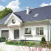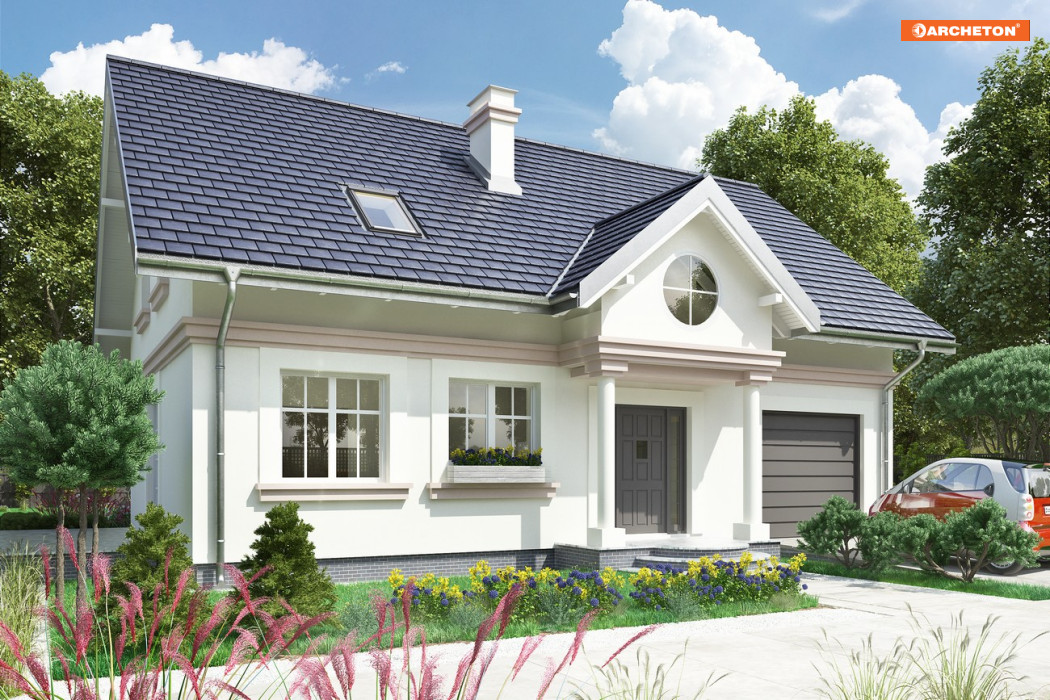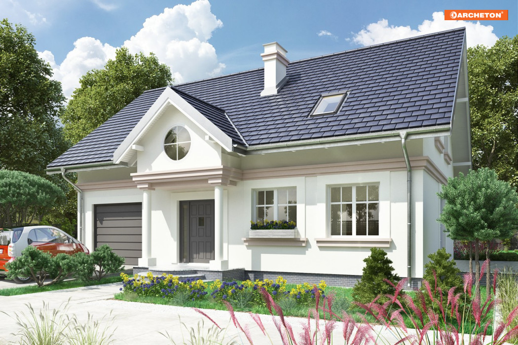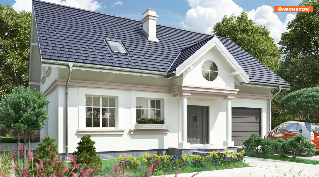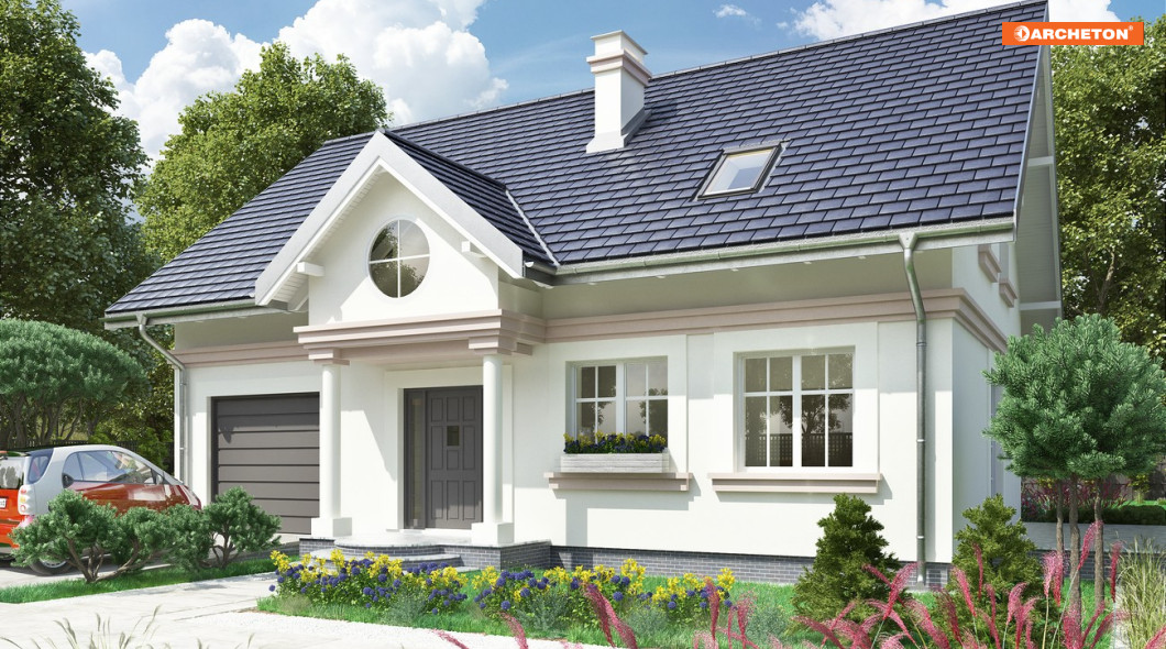 Dla zwolenników oszczędnych, ale przy tym tradycyjnych i eleganckich rozwiązań dobrą propozycją jest projekt domu Nowy Dworek. Prosta zwarta bryła na energooszczędnym, prostokątnym planie o ładnych proporcjach, bez balkonów, przekryta została dachem dwuspadowym z kalenicą równoległą do drogi dojazdowej. Mieści mieszkanie dla pięciu osób i część gospodarczą, rozdzielone od frontu wejściowym portykiem kolumnowym. Dom wyróżnia się dużą, oddzielną kuchnią z miejscem na stół jadalniany i salonem odseparowanym od wygodnego holu z małą łazienką, ze schodami i przejściem do sporej kotłowni. Znajduje się ona na tyłach wyjątkowo szerokiego garażu łączącego się z mieszkaniem przez sień. Na poddaszu projekt domu Nowy Dworek oferuje miejsce na cztery sypialnie doświetlone tradycyjnymi oknami w ścianach szczytowych, pralnię i drugą łazienkę. Mała lukarna od ogrodu, przez duże okno wpuszcza sporo światła do strefy komunikacji zarówno na parterze jak i na poddaszu. Historyzujący charakter architektury podkreślono w wizualizacji gzymsem na wysokości stropu, podokiennikami i dekoracyjnymi opaskami wokół otworów dzielonych w przeszkleniu na małe kwatery.