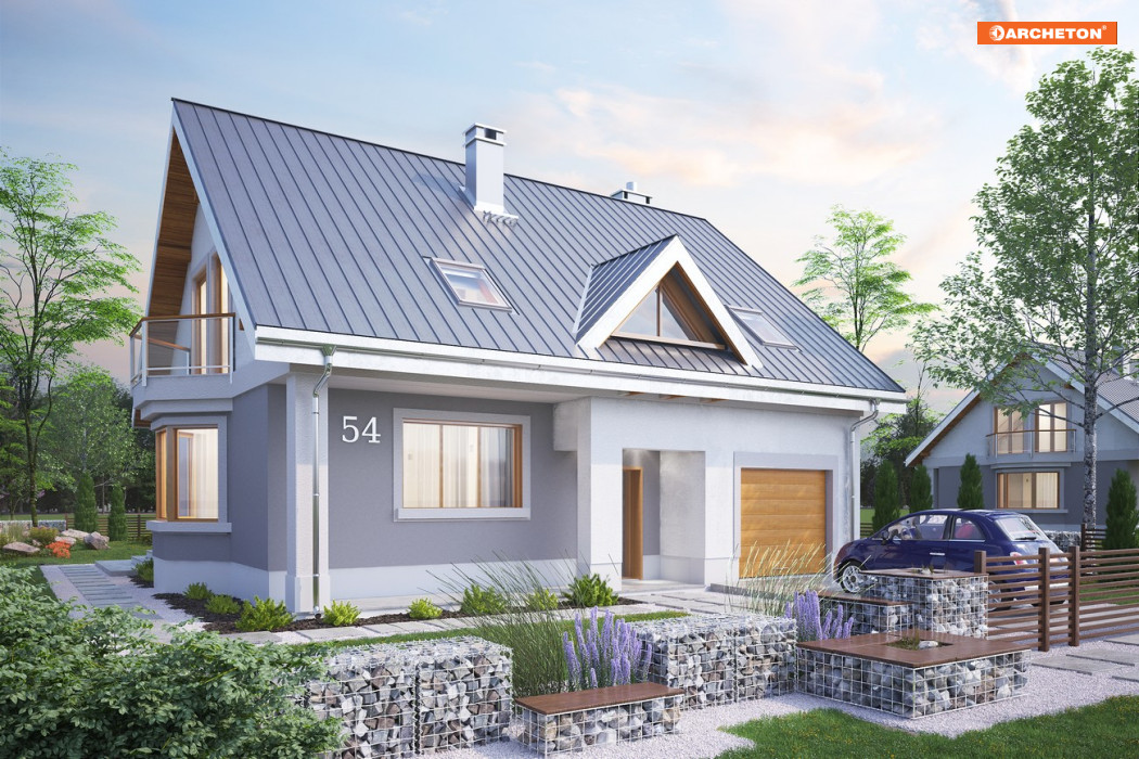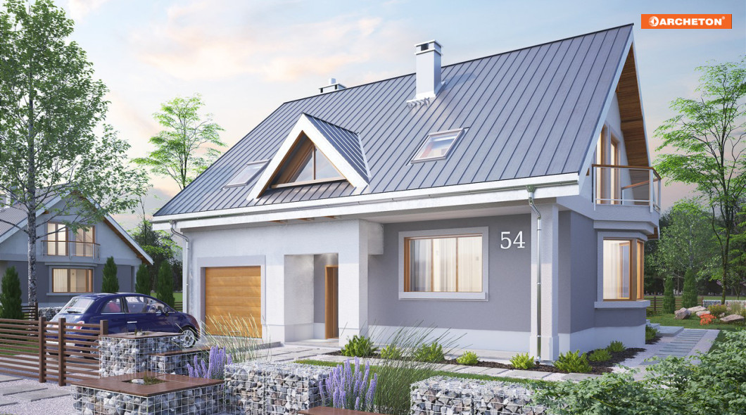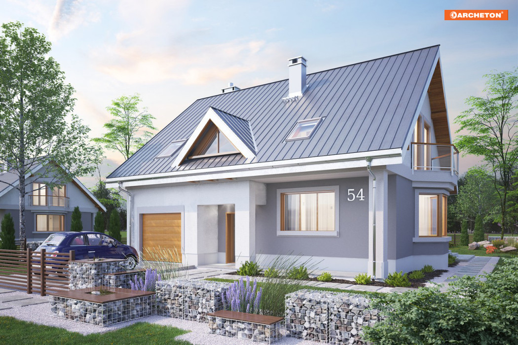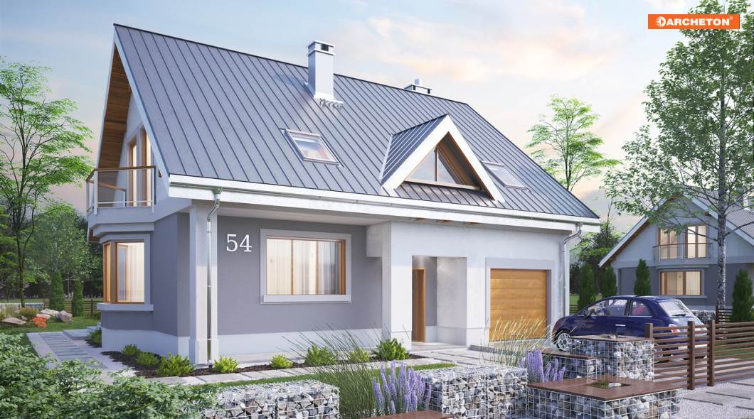 Skromniejszy wielkością niż Saba, projekt domu Saba Mała proponuje pojedynczy garaż w bryle i o 20m2 szczuplejszą powierzchnię. Poza tym sylwetka budynku i program użytkowy w obu rozwiązaniach są bardzo zbliżone. Płytkie, narożne wnęki ze słupami osłaniają wejście frontowe z dużym oknem kuchennym, a z tyłu - otwarcie jednoprzestrzennego pokoju dziennego na ogród. Razem z ryzalitem jadalni w ścianie bocznej tworzy to dość zróżnicowany obrys parteru, który wyróżniając się w tej grupie wielkości (ok.125m2) domów z dwuspadowym dachem, ma jednocześnie w jedne z najbardziej zbliżonych do kwadratu wymiarów. Konkuruje w tym względzie z Oberkiem ale Sabę wybiorą te osoby, które chciałyby mieć ponadto dodatkowy pokój na parterze lub planowały powiększyć jego kosztem kotłownię (czy zamienić ją np. na warsztat przy garażu), bo to właśnie umożliwia układ ścian nośnych w projekcie domu Saba. Dwie symetryczne względem kalenicy, niewielkie lukarny doświetlają wygodne schody oraz łazienkę po drugiej stronie strefy komunikacji poddasza. Cztery sypialnie są niewiele mniejsze iż w Sabie, a zamiast loggii nad garażem przewidziano drugi balkon w ścianie szczytowej.