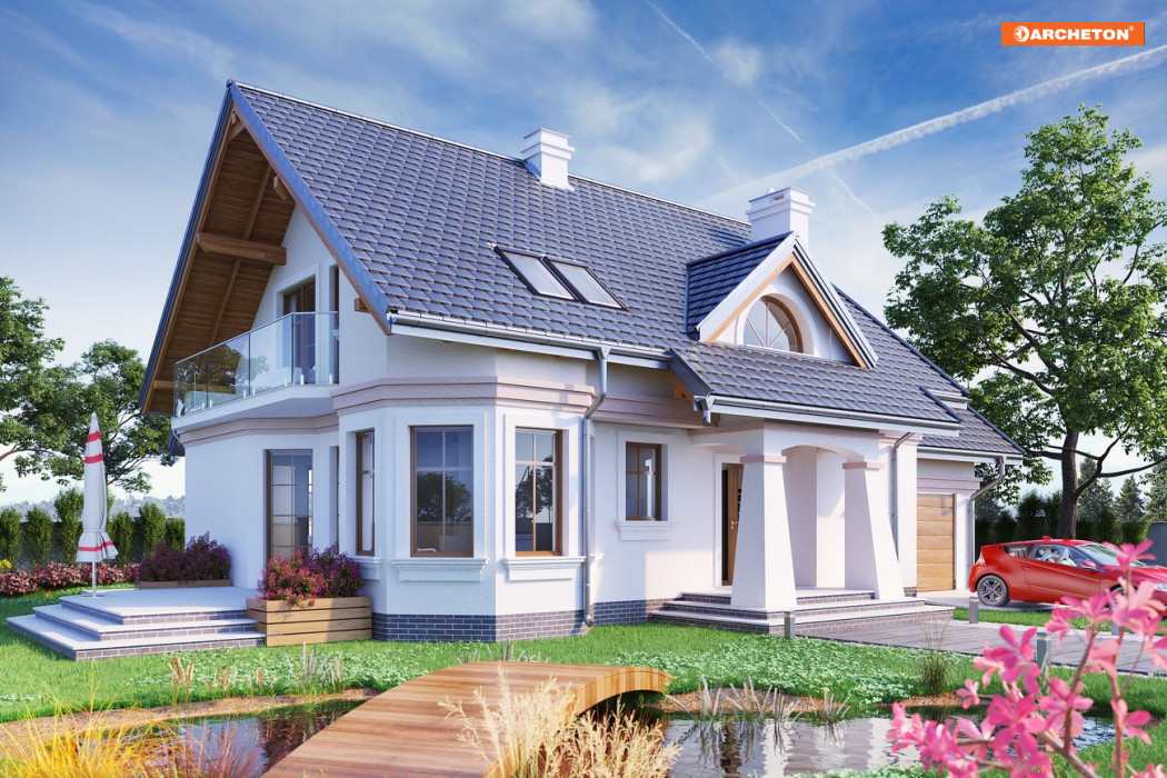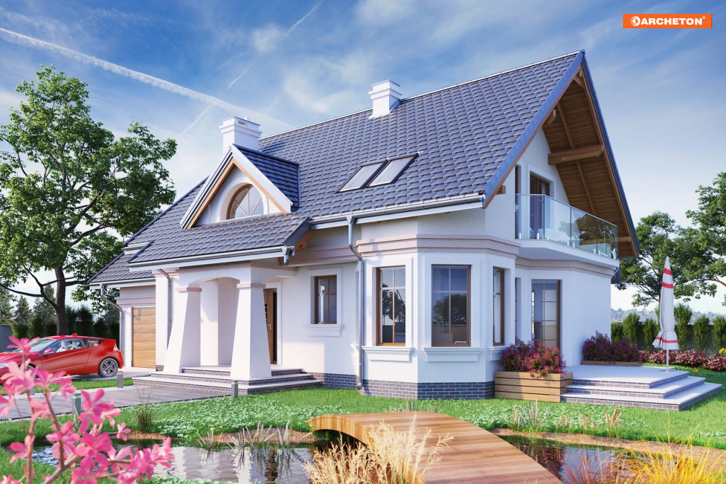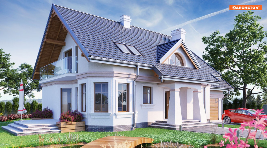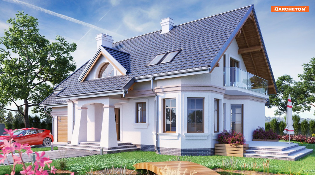 Projekt domu Maja Lux ma średnią wielkość w rodzinie, którą, wśród niedużych domów z dobudowanym garażem, wyróżnia fantazyjna sylwetka z narożnym ryzalitem na planie ośmioboku oraz trójkątna lukarna od frontu. Przełamanie geometrii kąta prostego kształtuje także taras przy ścianie bocznej i ocieniający go balkon. Rozkład wnętrza przypomina pozostałe koncepcje, które budowane są na takim samym obrysie przy zmieniających się wymiarach. Pokój dzienny urozmaica ośmiokątna jadalnia przy kuchni, a salon, choć otwarty, jest wydzielony od holu. Dwubiegowe schody ze schowkiem pod spocznikiem ulokowano w środku planu rozdzielając nimi: od frontu – kotłownię z przejściem do garażu, a od ogrodu – niewielki pokój i łazienkę. Strefa nocna na poddaszu pozwala na indywidualną aranżację czterech pokoi o zróżnicowanym kształcie i sposobie doświetlenia. Projekt domu Maja Lux, jak większość w rodzinie, ma osobne dwuspadowe dachy nad częścią mieszkalną i garażową. Wyróżnia go efektowny detal przypór niosących arkady nad tarasem frontowym i ogrodowym. Przeciwną – prostą stylistykę, przy identycznych gabarytach, powierzchni i programie użytkowym pokazuje Maja Neo.