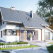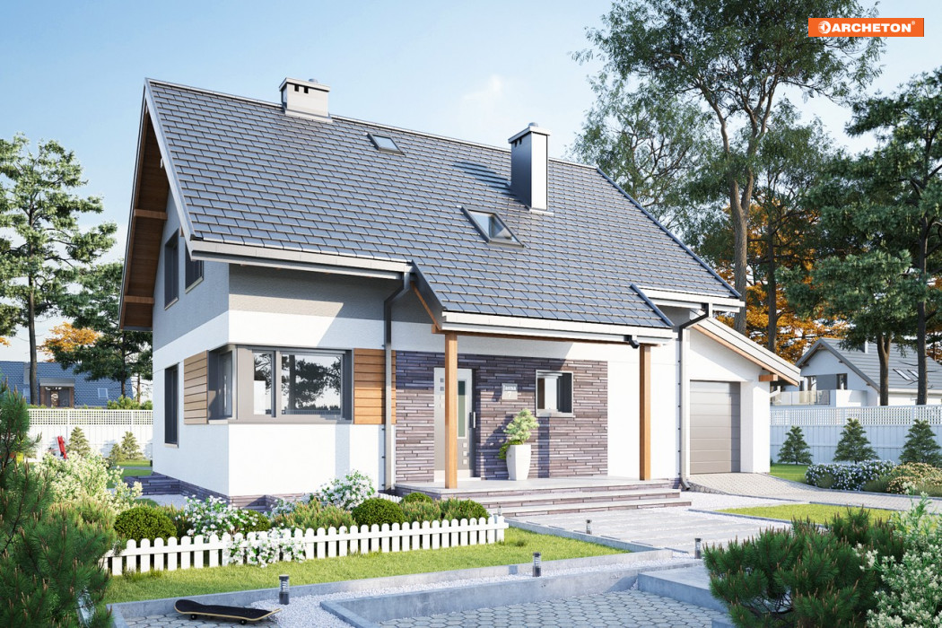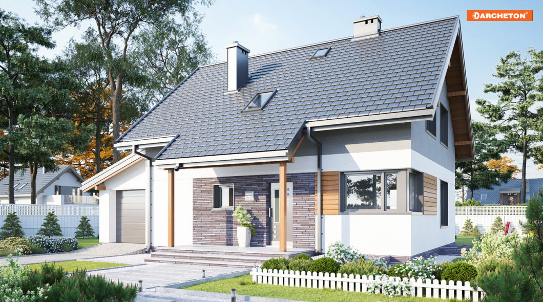 Wejście przez sień z podcienia wejściowego do holu, z którego dostępne są: łazienka, kuchnia, pokój dzienny i pokój. Klatka schodowa łączy parter z piwnicą, gdzie są pomieszczenia gospodarcze i kotłownia oraz z poddaszem, gdzie zlokalizowano pokoje sypialne, łazienkę i garderobę. Zwarta bryła domu na rzucie prostokąta z dostawionym garażem. Od frontu podcień wejściowy, od tyłu - ogrodowy. Dom nakryty dachem dwuspadowym z przedłużeniem połaci nad podcieniami. Garaż nakryty dachem pulpitowym.