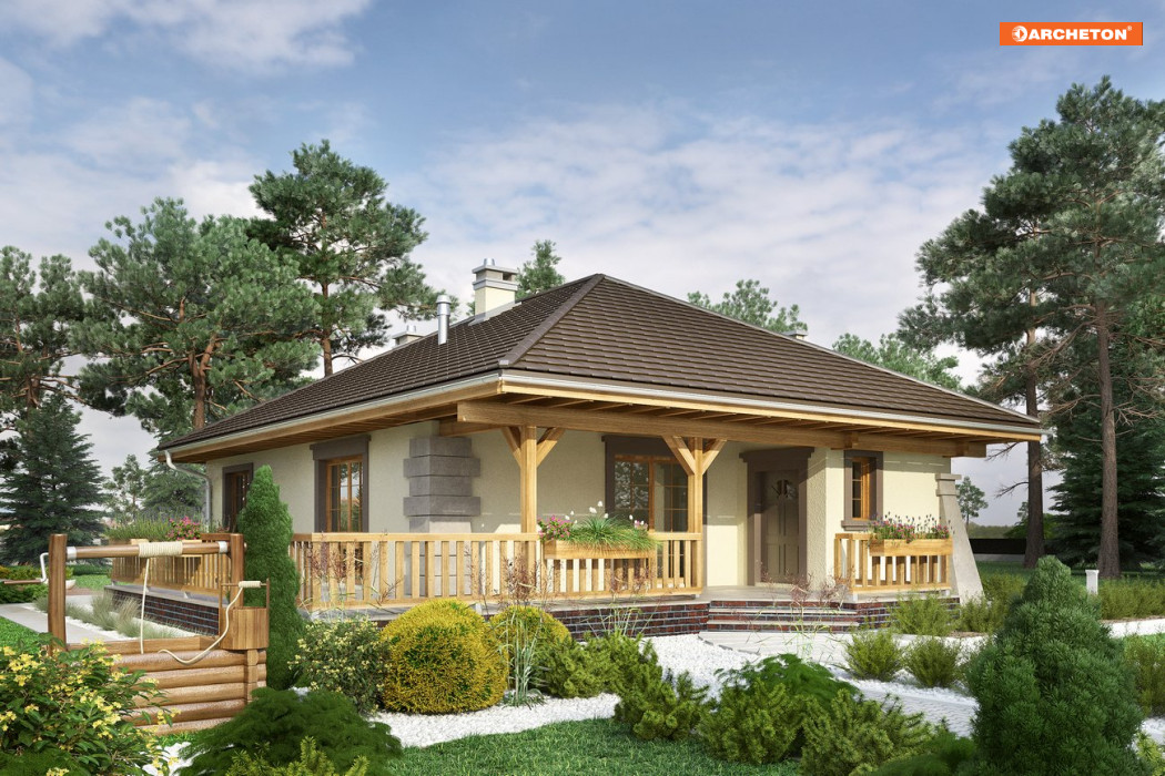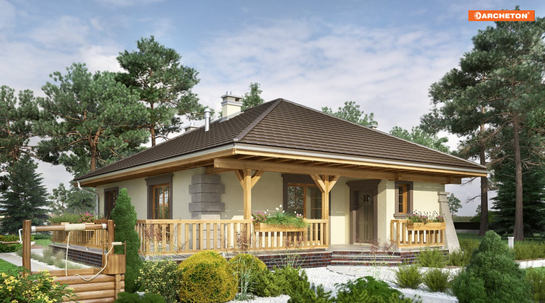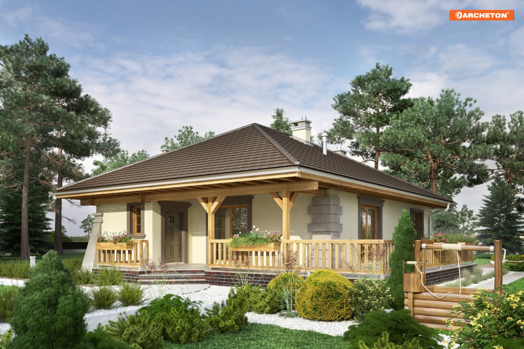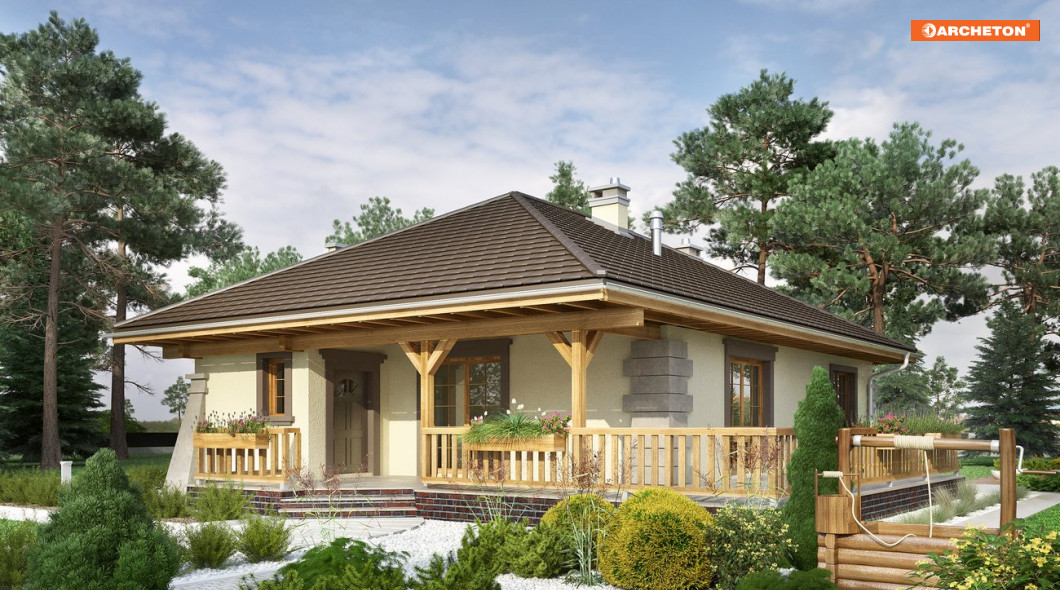 Parterowy dom bez garażu i z pokojem dziennym ulokowanym od frontu to wyjątkowe rozwiązanie. Zastosowano je w projekcie domu Julia, który wśród innych parterowych propozycji o powierzchni użytkowej ok. 80m2 wyróżnia także czterospadowy dach z kalenicą prostopadłą do drogi dojazdowej. Na prostokątnym rzucie z wejściową wnęką w podcieniu powstało mieszkanie dla 4 osób. Otwarty, przechodni salon z kuchnią zamyka przedpokój prowadzący do części prywatnej z trzema sypialniami i dużą łazienką. Oryginalny układ podkreśla dodatkowo obszerny, narożny taras powiększający wejściową werandę. Nadaje to architekturze charakter domu rekreacyjnego i sprawia, że projekt domu Julia najlepiej sprawdzi się na dużych działkach w luźnej, podmiejskiej zabudowie.