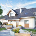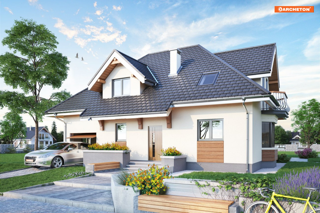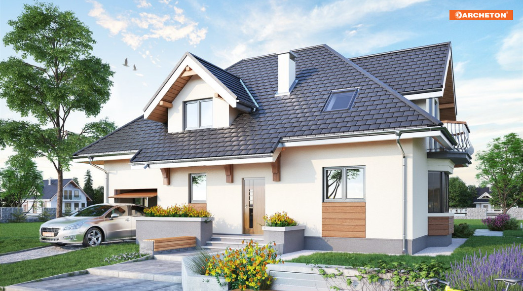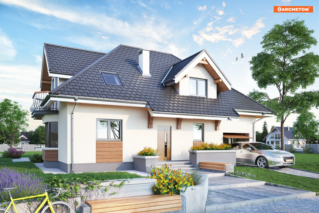 Parterowe domy z użytkowym poddaszem i dobudowaną częścią gospodarczą to ekonomiczne rozwiązania dla indywidualnego budownictwa mieszkaniowego. Jednym z nich jest projekt domu Zoja Karo oraz zbliżone koncepcje: Zofia i Helena, z balkonem na ryzalicie ściany bocznej. Wykorzystują miejsce pod dachem (z kalenica równoległą do drogi dojazdowej) nad całym budynkiem, proponując różne wielkości. Prostokątny obrys jest zwarty i energooszczędny. Na parterze, oprócz otwartego salonu, kuchni i dużej łazienki, znajduje się dodatkowy pokój – w sumie: wygodne mieszkanie, oraz przejście pod schodami do garażu i kotłowni. Projekt domu Zoja Karo, średniej wielkości w Rodzinie Zoi, ma 4 kolejne pokoje z łazienką na poddaszu i spiżarnię przy kuchni. Tak, jak we wszystkich wariantach z pojedynczym garażem, część gospodarcza i mieszkalna mają wspólny dach. W tej wersji jest on wyjątkowy – czterospadowy, z lukarną w każdej połaci. Bogatą bryłę uzupełniają z trzech stron niewielkie balkony. Niesymetryczny układ małej lukarny z obniżonym daszkiem od frontu i położenie kominka odróżnia Zoje od Zofii. Mają one na parterze jasną łazienkę i bardziej zamkniętą kuchnię od Heleny.