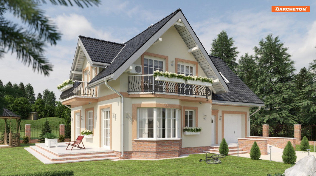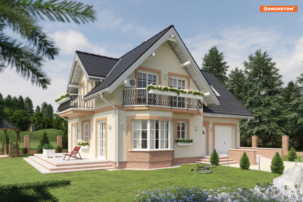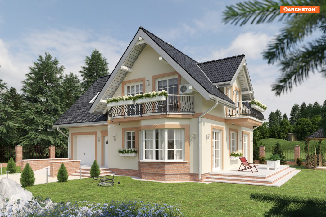 Projekty z Rodziny Jelonka powstały głównie z przeznaczeniem na działki skierowane wjazdem na zachód lub południe. Małe i średnie parterowe domy z użytkowym poddaszem i z garażem, na planie litery T przekryto dwoma dwuspadowymi przenikającymi się dachami. Skrzydło mieszkalne każdego wariantu, w tym mniejszego w rodzinie projektu domu Jelonek As, zorientowane jest do drogi dojazdowej ścianą szczytową. Akcentuje ją ryzalit z niesymetrycznie osadzonym balkonem, mieszczący jadalnię. Parter zajmuje część dzienna zwrócona ku frontowi, z otwartym salonem i kuchnią oraz położony na tyłach gabinet i łazienka. Wejście główne, ze sporą sienią, holem i wygodną dwubiegową klatką schodową, przewidziano w skrzydle części gospodarczej razem z garażem i kotłownią. Całe poddasze w projekcie domu Jelonek As wypełniają cztery sypialnie i duża łazienka. Złożoną bryłę wzbogaca dodatkowo duża lukarna z balkonem, który osłania taras ogrodowy dostępny z salonu i gabinetu. Lukarnę umieszczono na osi kalenicy części garażowej podkreślając przemyślany, elegancki i dekoracyjny charakter sylwetki.