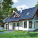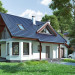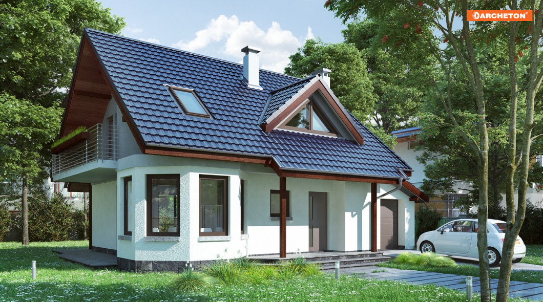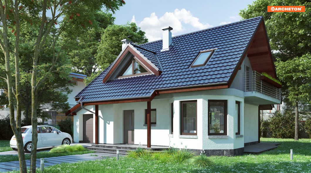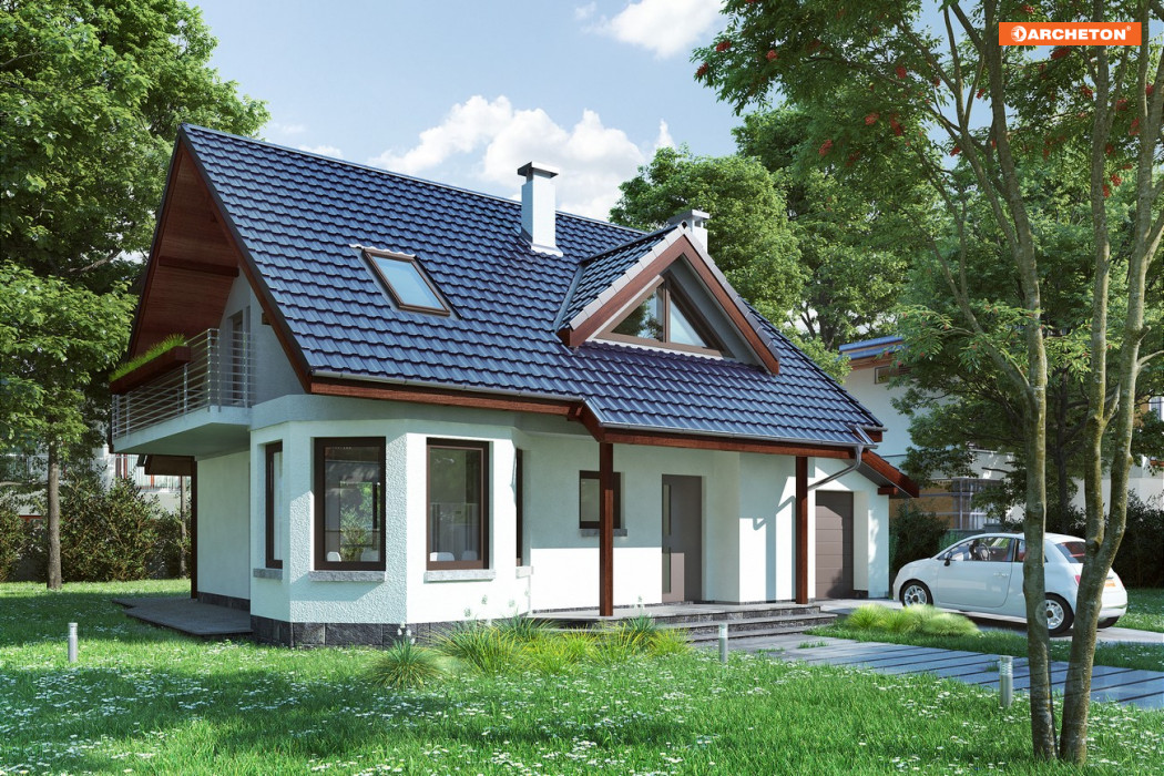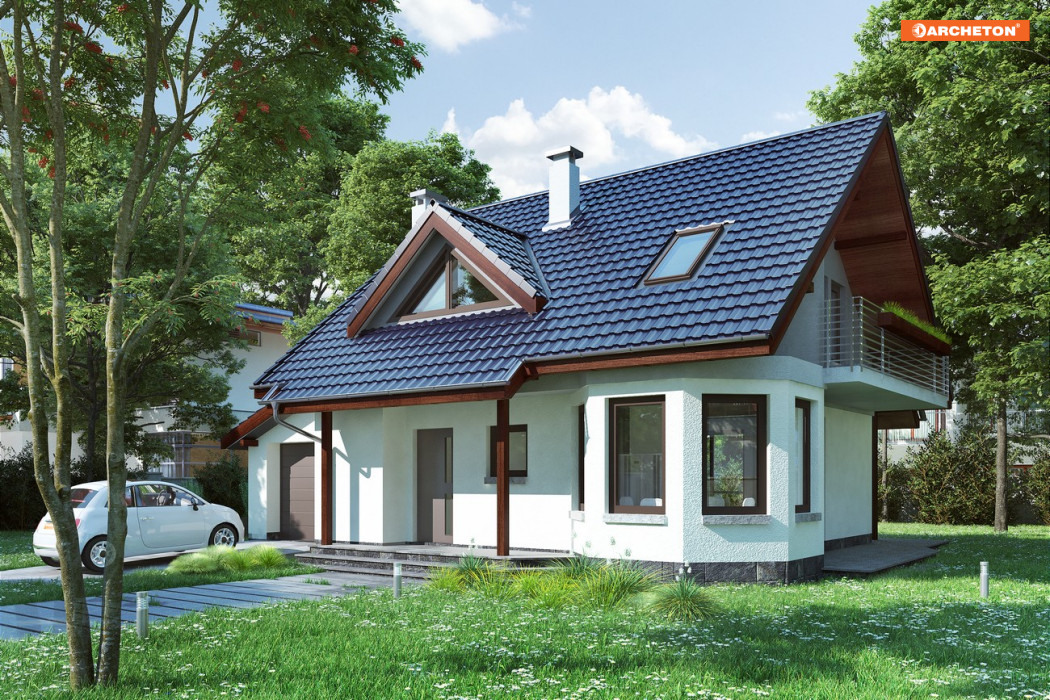 Projekt domu Majka jest najmniejszy w liczącej kilkanaście wariantów Rodzinie Majki. Wśród małych i średnich parterowych domów z użytkowym poddaszem i dobudowanym garażem rodzina ta zwraca uwagę fantazyjną sylwetką z trójkątną lukarną i narożnym ryzalitem na rzucie ośmioboku. Przełamanie geometrii kąta prostego kształtuje dalej inne detale bryły: ukośną ścianę wnęki wejściowej z zadaszeniem wspartym na drewnianych słupkach, taras przy ścianie bocznej i ocieniający go balkon. Sprawdzony schemat otwartego układu parteru, bez dodatkowego pokoju przy salonie, urozmaicono ośmiokątną jadalnią przy kuchni. Wszystkie pomieszczenia w projekcie domu Majka Mini mają najbardziej oszczędne powierzchnie w rodzinie, a schody są zabiegowe, na planie litery U. Wariant ten należy w rodzinie do rozwiązań z kalenicą dwuspadowego dachu równoległą do drogi dojazdowej. Strefa nocna na poddaszu, jak we wszystkich wersjach, pozwala na indywidualną aranżację prywatnej przestrzeni dla domowników, bo każdy z trzech pokoi ma inny kształt i sposób doświetlenia.