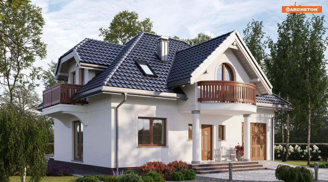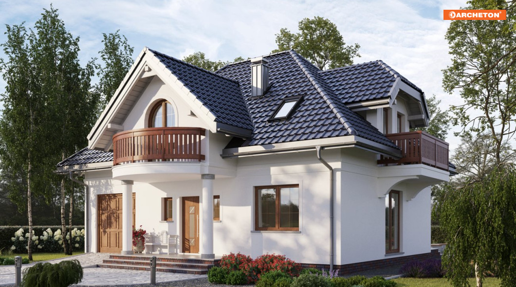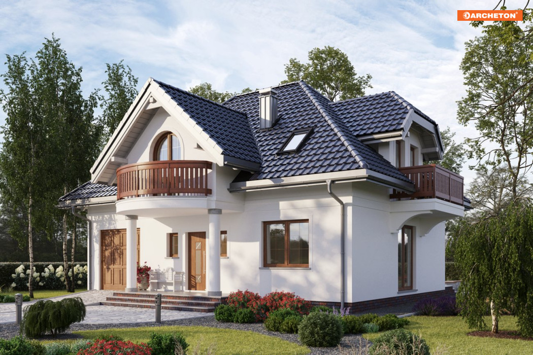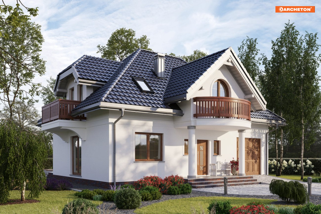 W projekcie domu Ślężan Alter zastosowano rzadko spotykaną konstrukcję stromego dachu czterospadowego z krótką kalenicą równoległą do drogi dojazdowej. Bryłę, z dwupoziomowym mieszkaniem oraz wbudowanym garażem i kotłownią dostępnymi z sieni, zbudowano na planie zwartego prostokąta o wymiarach identycznych jak w projekcie domu Ślężan. To dwa wyjątkowe rozwiązania z zakresu powierzchni użytkowej 120-130 m2, także z uwagi na dekoracyjną, nieco historyzującą stylistykę. Frontowy, symetrycznie umieszczony w elewacji podcień na kolumnach niesie wysuniętą lukarnę z owalnie zarysowaną krawędzią balkonu. Prowadzi on do sporego holu, otwartego na część dzienną mieszkania oraz schody na poddasze. Salon i kuchnia są oddzielone ścianą nośną ale konstrukcja pozwala dowolnie, indywidualnie ustalić stopień podziału przestrzeni. Plan parteru jest bardziej otwarty niż w Ślężanie i ma inną lokalizacją mniejszej łazienki, a dzięki temu – szerszy salon. Pięć sypialni na poddaszu to pokoje doświetlone oknami dachowymi i drzwiami balkonów w lukarnach akcentujących wszystkie połacie dachu. Pomieszczenia w projekcie domu Ślężan nie są tu duże ale ustawne.