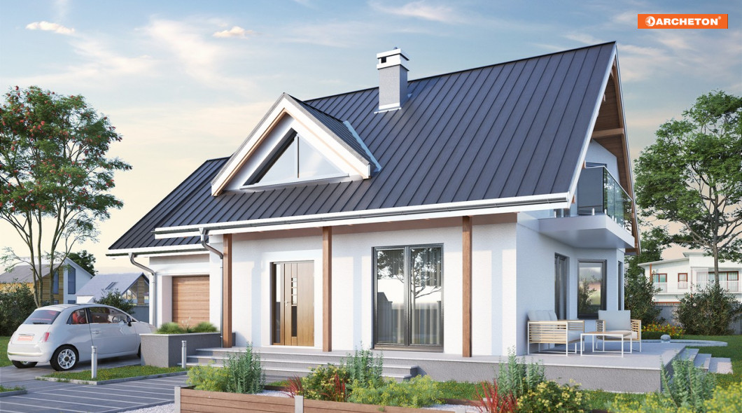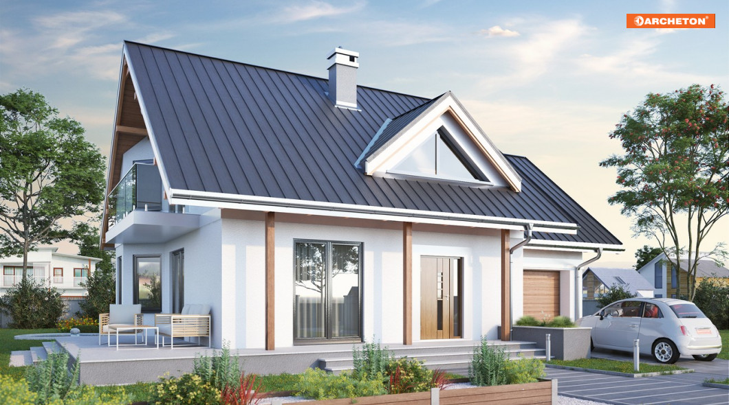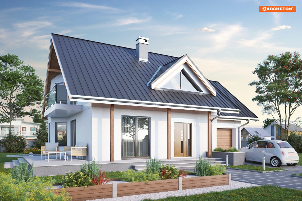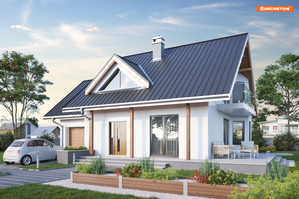 Projekt domu Majka Solis jest średnim w liczącej kilkanaście wariantów Rodzinie Majki. Wśród niewielkich parterowych domów z użytkowym poddaszem i dobudowanym garażem, przykuwają one uwagę sylwetką z trójkątną lukarną nad wejściem i fantazyjnym narożnym ryzalitem na planie ośmioboku. Majka Solis jest wersją, w której ryzalit ten, wraz z jadalnią i kuchnią, znalazł się w ogrodowej części budynku. Rozwiązanie to, przeznaczone na działkę z wjazdem od południa, zachowuje poza tym charakterystyczny rozkład parteru z jednoprzestrzennym pokojem dziennym, trójbiegowa klatką schodową i kotłownią dostępną z garażu, choć ulokowaną w części mieszkalnej budynku. Podobny jest także kształt tarasu przy ścianie bocznej i balkonu opartego o ryzalit. Projekt domu Majka Solis jest wariantem z kalenicą dwuspadowego dachu równoległą do drogi dojazdowej i frontowym podcieniem na słupkach. Ma pełną, małą łazienkę na parterze i jest najmniejszą wersją z czwartą – główną sypialnią nad garażem. Strefa nocna na poddaszu w całej Rodzinie Majki, pozwala na indywidualną aranżację prywatnej przestrzeni dla domowników, bo każdy z pokoi ma inny kształt i sposób doświetlenia.