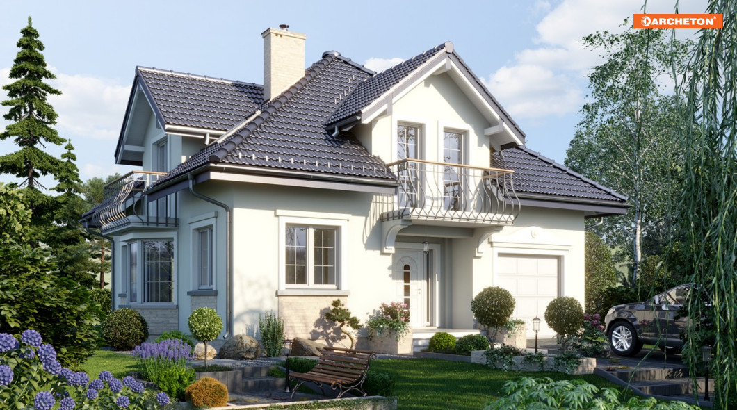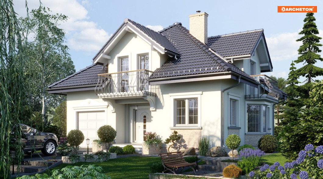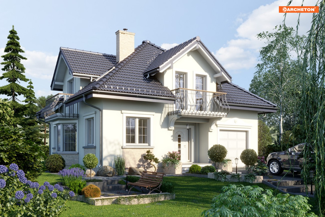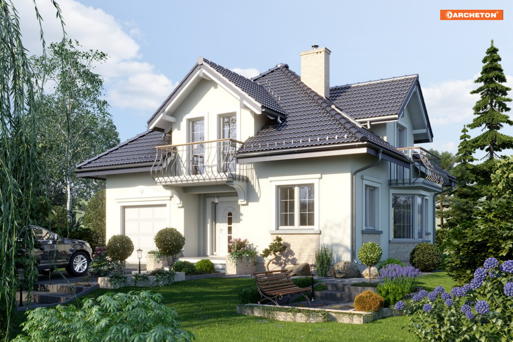 Projekt domu Prymus Mini wchodzi w skład rodziny Prymusa grupującej małe i średnie rozwiązania z użytkowym poddaszem i wbudowanym garażem. Rodzinę wyróżnia zwarty rzut i czterospadowy dach z lukarnami. Wersja Mini ma kwadratowy rzut i jest najmniejsza. Wysunięty ku frontowi wjazd o słania wejściową wnękę pod głębokim okapem, umieszczoną na osi symetrii frontu. Na parterze kuchnia ze spiżarnią i wyjątkowo duży salon z kominkiem tworzą otwartą przestrzeń. Garaż z kotłownią, łazienką i z gabinetem składają się na osobny trakt, oddzielony od pokoju dziennego strefą komunikacji. W holu jest dużo miejsca na obszerną szafę ubraniową. Wygodna klatka schodowa prowadzi na poddasze do trzech sypialni. Jest to przestrzeń z dużą łazienką, połączoną z pralnią. Wyraźna różnica między powierzchnią użytkową, a netto pomieszczeń wynika z kształtu dachu. Dlatego zaproponowano duże lukarny, podnoszące komfort mieszkania. Akcentują one jednocześnie front budynku i ryzalit z jadalnią w ścianie bocznej. Rozbudowany dach równoważy prostotę rzutu i sprawia, że projekt domu Prymus Mini jest rozwiązaniem kompromisowym miedzy energooszczędnym, a malarskim charakterem bryły.