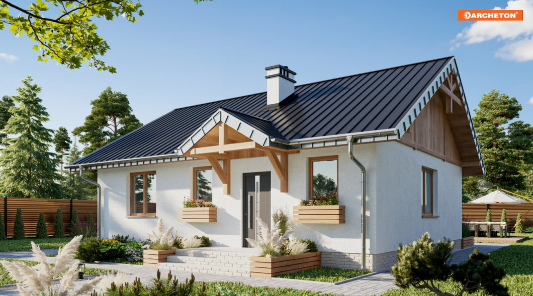 Projekt domu Mikro to mały parterowy budynek z ekonomicznym dwuspadowym dachem i kalenicą równoległą do drogi dojazdowej. Przy powierzchni zbliżonej do Anity i Modrzyka ma bardziej zwarty rzut i krótsza elewację frontową, dzięki czemu wymaga węższej działki. Oferuje też większy komfort przestrzeni w trzech głównych mieszkalnych pomieszczeniach niż np. bardziej oszczędnie zaprojektowany Maluch Bis (z czterema pokojami). Prosty układ ścian nośnych wyraźnie oddziela tylko strefę dzienną. Umożliwia to inwestorowi łatwe podjecie indywidualnej decyzji o wielkości pozostałych pomieszczeń. W gotowym projekcie domu Mikro zaproponowano tu obszerny hol z pojemną, wbudowaną szafą, dużą łazienkę i kotłownię oraz położone za nimi dwie różnej wielkości sypialnie. Prosta bryła daje dużą swobodę wyboru stylistyki i sposobu wykończenia elewacji, co pokazuje wariant Eko. Projekt domu Mikro Eko odróżnia nowocześniejszy detal architektoniczny, ponadstandardowa termoizolacyjność przegród budowlanych, zastosowanie wentylacji mechanicznej i wynikające z tego minimalne zmiany wymiarów.