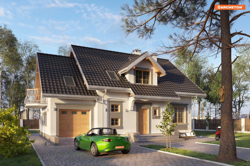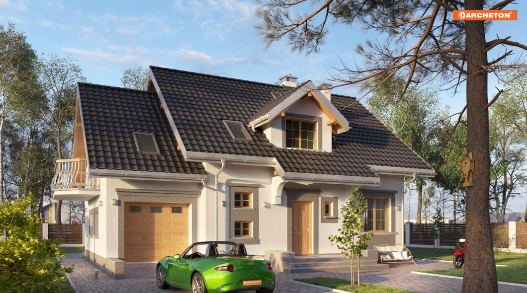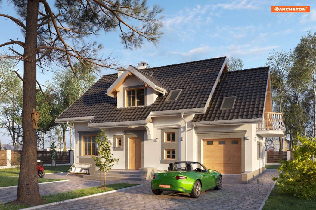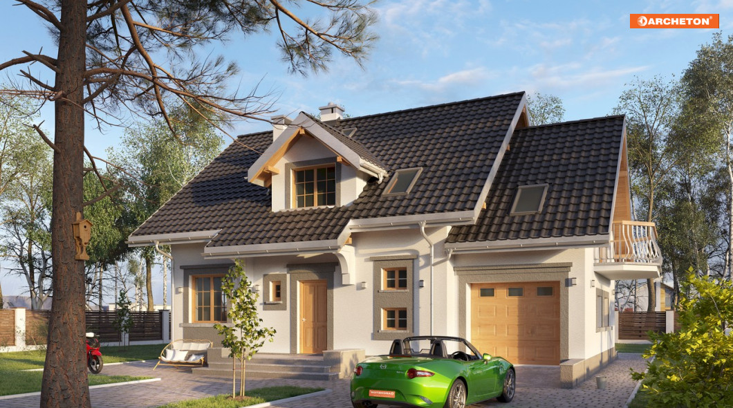Rodzina Celesty to grupa projektów małych i średnich domów parterowych z użytkowym poddaszem i z dostawionym garażem, przypominających nieco rozwiązania z rodzin: Zoi czy Chabra. Charakterystyczny ryzalit w ścianie bocznej przesunięto tu jednak w głąb posesji, a ulokowana w nim jadalnia stała się wyraźnie częścią salonu. Projekt domu Celesta Prima Lux jest jednym z większych w rodzinie, zachowując ten sam program funkcjonalny i kształt planu. Środkiem rzutu części mieszkalnej biegnie ściana nośna, tradycyjnie oddzielając front z kuchnią, sienią, łazienką i schodami ze schowkiem od salonu z dodatkowym pokojem. Poddasze ma cztery wygodne pokoje i zgrabny przedpokój z łazienką. Sypialnia główna znajduje się nieco niżej, nad częścią gospodarczą z kotłownią i oferuje miejsce na garderobę. Projekt domu Celesta Prima Lux jest jednym z trzech wariantów bez balkonu w drugiej ścianie bocznej. Tak jak w wersji Bona i Lux ryzalit jadalni wieńczy fantazyjny daszek. Całą bryłę przekryto osobnymi dwuspadowymi dachami z kalenicami równoległymi do drogi dojazdowej. Lukarny głównego dachu w obu połaciach i przedłużony częściowo okap od frontu przypominają sylwetkę Zoi.