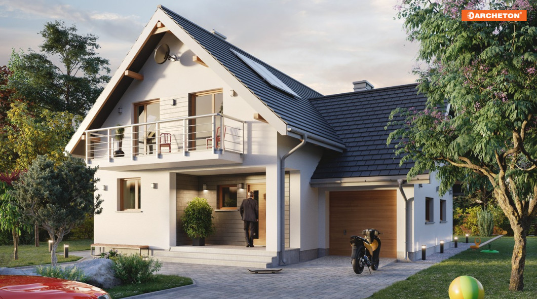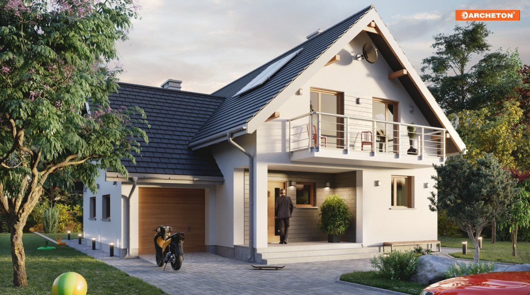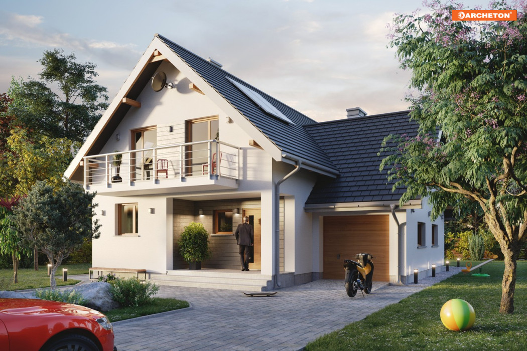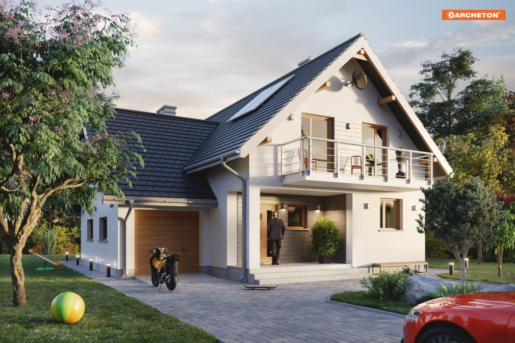 Projekt domu Tosia Mobil jest jedną z propozycji domu parterowego z użytkowym poddaszem i z garażem, o powierzchni ok.120m2, o bryle zbudowanej na planie zbliżonym do litery T. Kalenice dwuspadowych dachów nad ramionami rzutu są prostopadłe. Wyższa część mieszkalna, pod którą zaprojektowano piwnice, wysuwa się do przodu jeszcze wyraźniej niż w podobnej Kolibie Astro. Wejście frontowe osłonięte balkonem podkreśla dodatkowo wnęka z narożnym słupem. Parter mieści przestronny salon i kuchnię z łazienką. Łączy je jadalnia ulokowana w ryzalicie rozrysowanym na planie części ośmiokąta foremnego, otwarta na hol i wygodne, dwubiegowe schody. Słupy konstrukcji stropu oddzielają optycznie pokój dzienny od komunikacji i zejścia do piwnic, tworząc warunki do całkowitego odseparowania tej przestrzeni ścianą działową lub aranżacją mebli. Poddasze to cztery niewielkie ale bardzo ustawne, jak na wydłużony rzut całości, sypialnie z wyjściami na balkony oraz komfortowa łazienka. Część gospodarcza w projekcie domu Tosia Mobil dostępna jest z sieni i przewiduje tylko garaż ze strychem, a kotłownia jest jednym z trzech dużych pomieszczeń piwnicy.