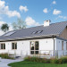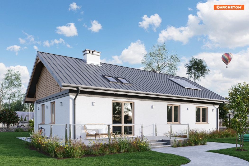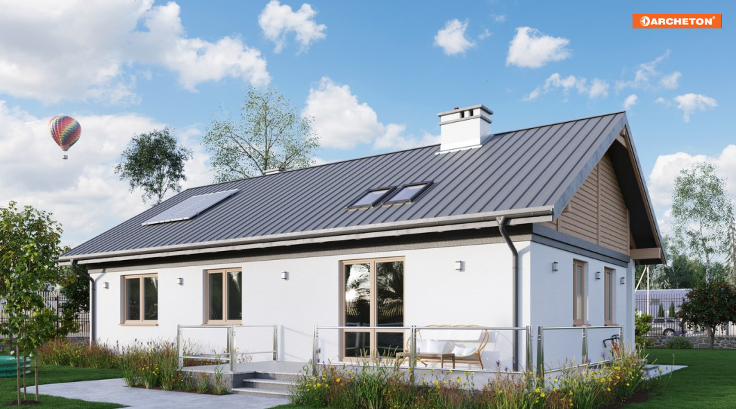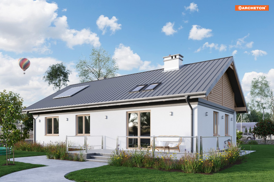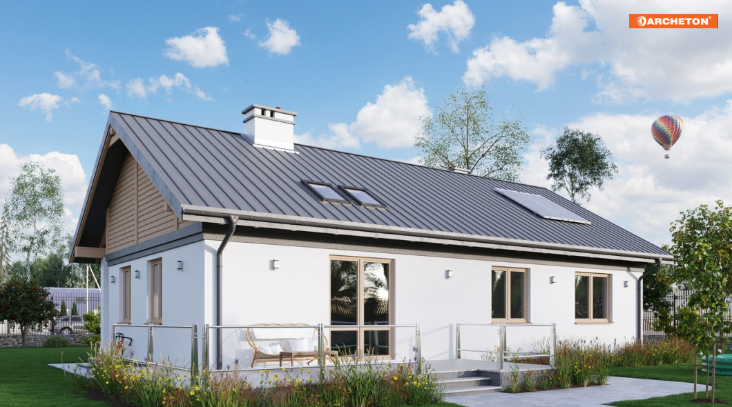Rodzina Modrzyka grupuje małe i średnie parterowe domy bez garażu o przyjaznej naturalnemu krajobrazowi, niskiej, tradycyjnej bryle. Wśród innych propozycji z dwuspadowym dachem i prostokątnym rzutem wszystkie warianty Modrzyka wyróżnia wejściowa, podłużna weranda w narożnym podcieniu oraz spora powierzchnia dla funkcji gospodarczych. Projekt domu Modrzyk Karbo jest średni w rodzinie i oferuje wygodne mieszkanie dla czterech osób. Składa się na nie otwarty na hol pokój dzienny z kuchnią uzupełnione o wc. W dłuższym o 2,5m od Modrzyka korpusie zmieściły się trzy sypialnie, duża łazienka i największa w rodzinie kotłownia z własnym wejściem. Tak jak we wszystkich wersjach z rodziny, zaproponowano oryginalne uzupełniające, górne doświetlenie podwyższonego salonu oknami połaciowymi. Prosta architektura daje dużą swobodę w wykończenia elewacji i nadania projektowi domu Modrzyk Karbo dowolnej, najlepiej zharmonizowanej z konkretnym otoczeniem stylistyki.