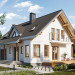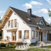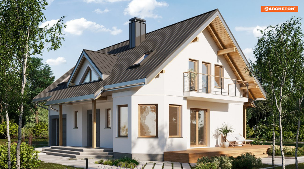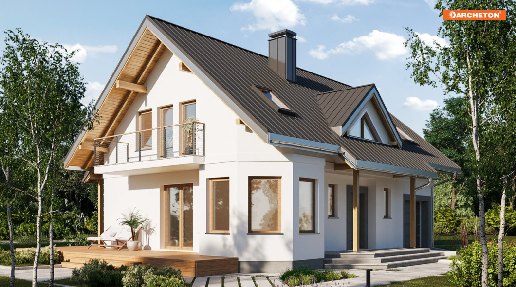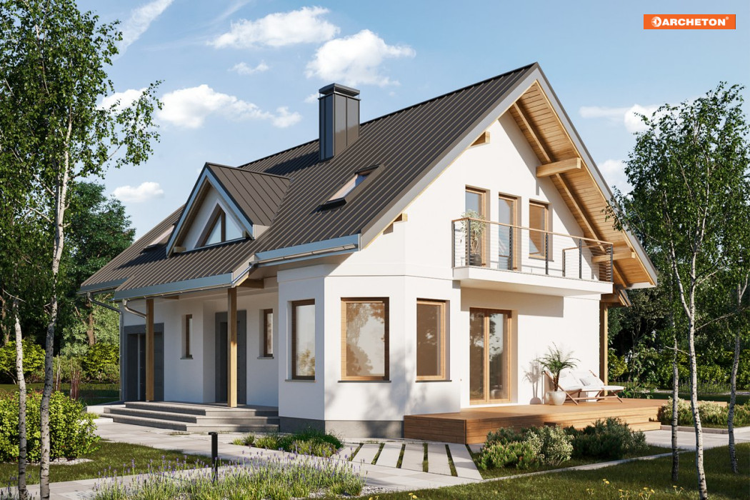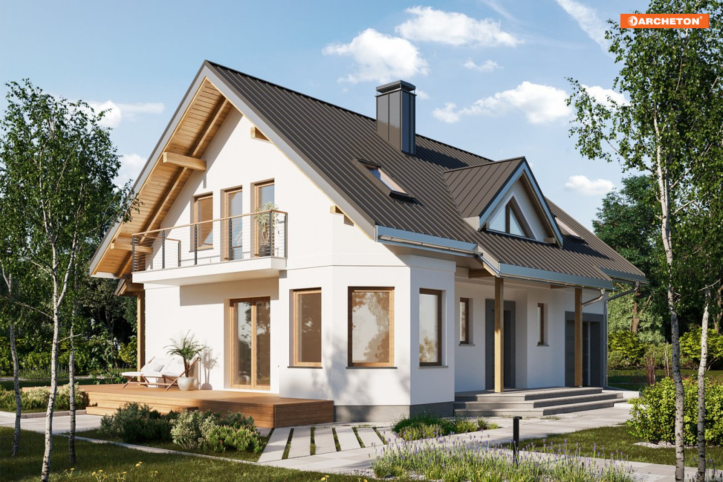 Projekt domu Majka Puzon jest jednym z większych w liczącej kilkanaście wariantów rodzinie. Wyróżnia je, wśród małych i średnich domów z dobudowanym garażem, fantazyjna sylwetka z narożnym ryzalitem zbudowanym na planie ośmioboku. Przełamanie geometrii kąta prostego kształtuje także inne detale bryły: zadaszoną wnękę wejścia, taras dostępny z salonu przy ścianie bocznej i ocieniający go balkon. Rozkład wnętrza korzysta ze sprawdzonych schematów, ale odznacza się kilkoma oryginalnymi rozwiązaniami. Otwarty pokój dzienny urozmaica ośmiokątna jadalnia przy kuchni i widok na wachlarzowe schody w holu. Alternatywne wersje rodziny proponują nie tylko różne wielkości mieszkania ale też równoległe lub prostopadłe do drogi dojazdowej ustawienia kalenicy dwuspadowego dachu. Strefa nocna na poddaszu pozwala na indywidualną aranżację prywatnej przestrzeni dla domowników, bo każdy z czterech pokoi ma inny kształt i sposób doświetlenia. Projekt domu Majka Puzon, jako jedyny w rodzinie, ma wspólny dach nad częścią mieszkalną i gospodarczą (przejście do garażu i kotłowni jest w jasnej sieni) oraz pokój przy salonie wysunięty częściowo z elewacji ogrodowej.