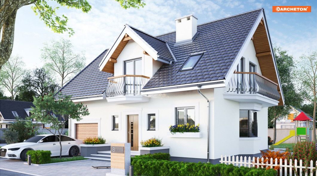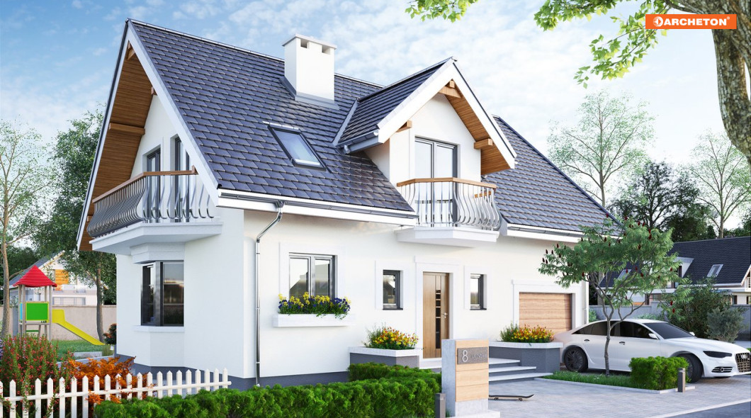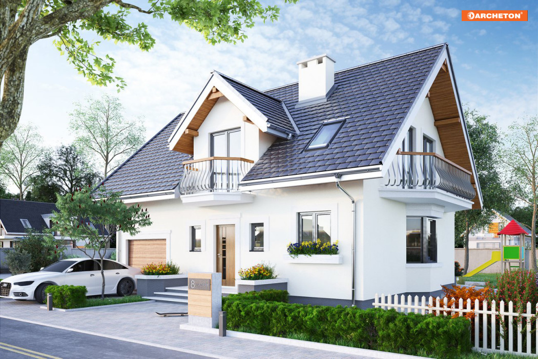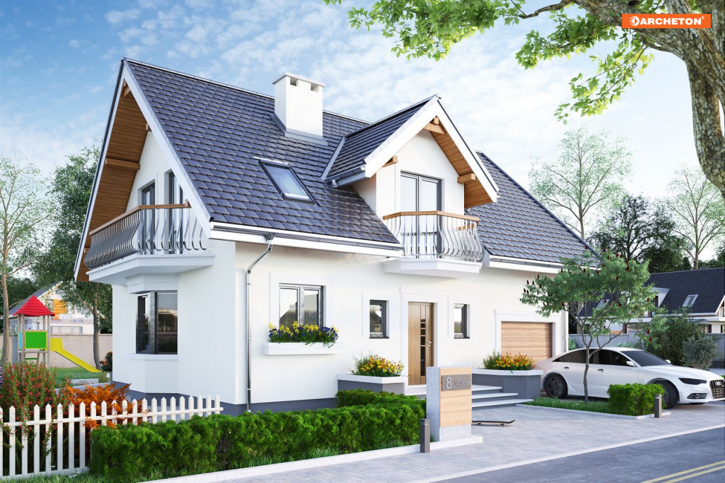 Projekt domu Zofia Mini w sposób wyważony realizuje wszystkie, najczęściej formułowane, oczekiwania inwestora chcącego wybudować niewielki dom jednorodzinny z użytkowym poddaszem. Sylwetka Zofii jest prosta i ekonomiczna, bo pod jednym dachem, zamyka zarówno część mieszkalną, jak i garaż z kotłownią. Stosunkowo energooszczędna bryła mieści strefę dzienną z dodatkowym pokojem na parterze i cztery sypialnie na poddaszu. Układ kuchni przewiduje jej wyraźne oddzielenie od salonu ścianą z kominkiem. Dwie łazienki zapewniają komfort piątce domowników. Proponowane detale architektoniczne: opaski okienne, lukarny w dachu oraz dekoracyjny charakter balkonów podkreślają tradycyjny wizerunek stylistyczny domu. Charakterystycznym elementem budynku jest ryzalit z jadalnią w ścianie bocznej i lukarna z balkonem nad wejściem głównym. Projekty domów z rodziny Zofii oferują różne powierzchnie, warianty funkcjonalne i sugestie stylistyczne na bazie podstawowego układu Zofii.