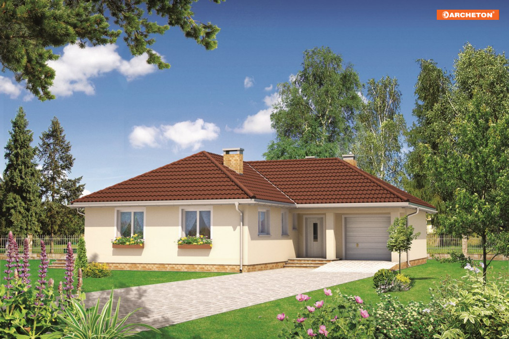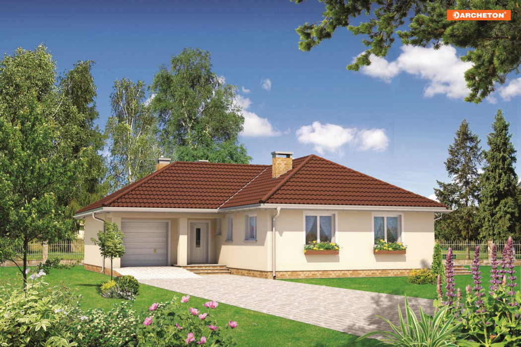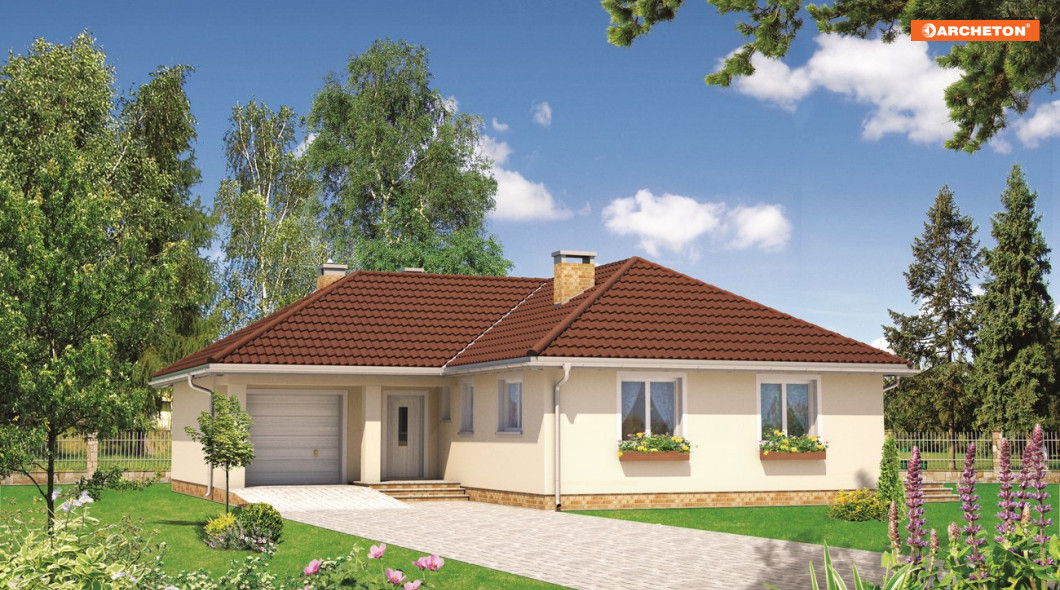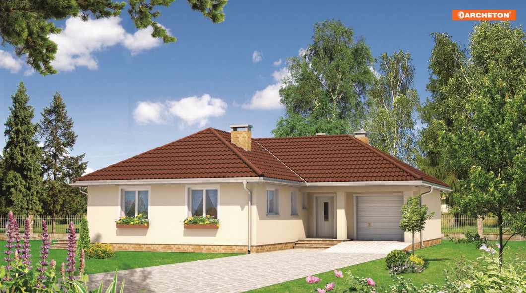 W grupie parterowych domów o powierzchni 100-110m2 p.u. z pojedynczym garażem Archetonu, projekt domu Cetyniec wyróżnia plan w kształcie litery L. Budynek przekryto przenikającymi się czterospadowymi dachami o jednakowej wysokości. Jednoprzestrzenny pokój dzienny otwiera się na front posesji narożnymi, efektownymi oknami. Część gospodarcza z garażem i z dużą kotłownią znajduje się w skrzydle cofniętym w głąb ogrodu, gdzie znajduje się wejście główne, podkreślone głębokim cieniem wnęki i okapu. Taki układ idealnie oddziela rekreacyjną część działki i otwarty z salonu taras od wjazdu i sprawia, że Cetyniec sprawdzi się na o działce skomunikowanej z drogą dojazdową od południa lub wschodu. Trzy sypialnie z drugą, większą łazienką tworzą ustronny zespół nocnej strefy prywatnej na tyłach domu. Projekt domu Cetyniec, jak większość niskich domów na rozbudowanych rzutach, łagodnie wpisuje się w przestrzeń poziomymi liniami. Duże swobodnie rozmieszczone tafle okien uporządkowano pasami drewnianej boazerii. Wpuszczają do wnętrz nie tylko mnóstwo światła ale także otoczenie domu, tworząc neutralną dla krajobrazu kompozycję.