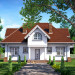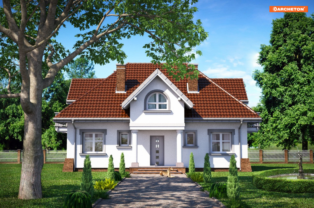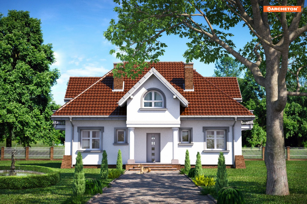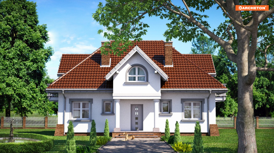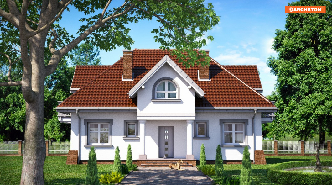Harmonijnie zbudowana, elegancka, tradycyjna w stylistyce sylwetka zwraca uwagę w projekcie domu Leda Rex wśród propozycji średniej wielkości domów z użytkowym poddaszem, bez garażu. Podobnie jak zbliżone: Leda i Rezeda ma czterospadowy dach z lukarnami w każdej połaci oraz z balkonami. Konsekwentnie symetryczny jest plan budynku podzielony na trzy trakty konstrukcyjne. Centralny, ze strefą wejściową i trójbiegową klatką schodową wysuwa się salonem w ryzalicie w głąb ogrodu. Od frontu akcentuje go podcień na słupach niosących łazienkę poddasza z jedynym półkolistym oknem. Od ogrodu ryzalit wieńczy największa lukarna głównej sypialni poddasza. Dwie węższe części parteru mieszczą: po jednej stronie kuchnię z jadalnią w otwartej kompozycji pokoju dziennego, a po drugiej - dodatkowy pokój i sporą kotłownię dostępną ze schowka pod schodami. Sień obejmują z obu stron spiżarnia i mała łazienka. Ten trójdzielny rozkład w projekcie domu Leda Rex powtarza strefa nocna na drugiej półkondygnacji z trzema pokojami dla czterech osób oraz z kombinacją dwóch łazienek i garderoby. Pomieszczenia te mają charakterystyczne wnętrza ze skosami, wygodne dzięki lukarnom.