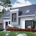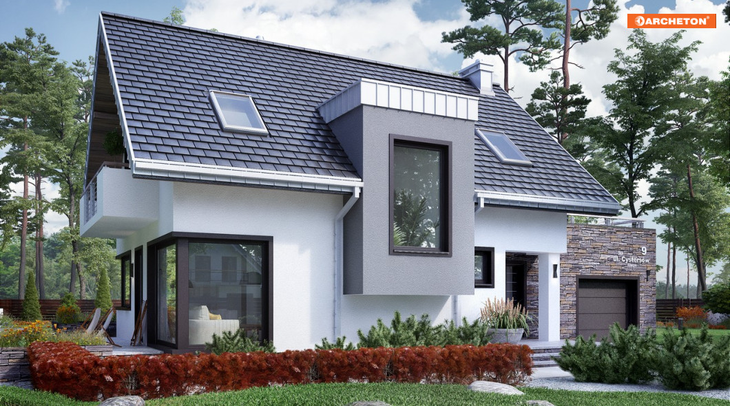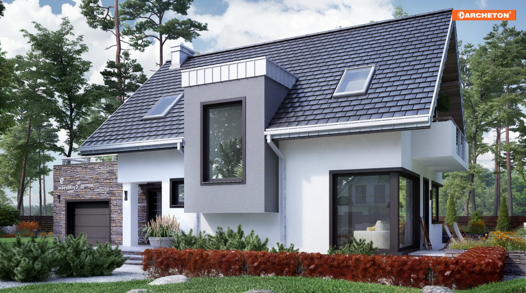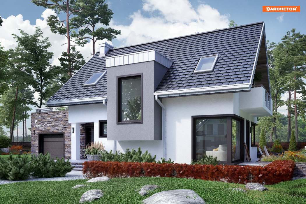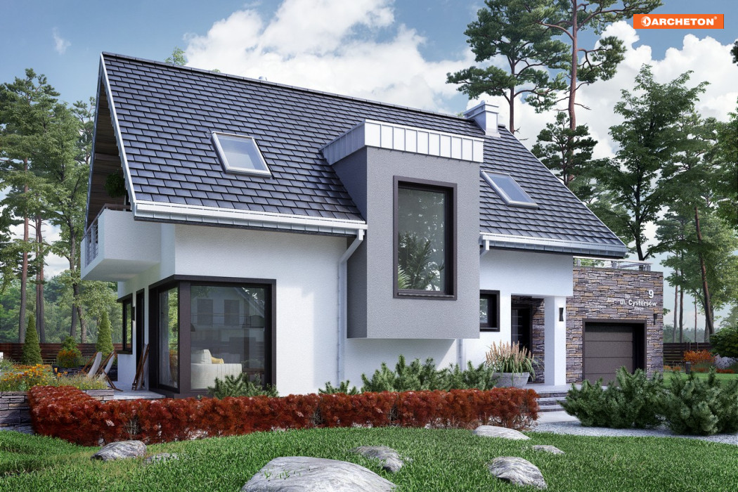 Projekt domu Margo Kubik powstał z myślą o inwestorach dysponujących płytką działką i poszukujących dla swojego domu innowacyjnych rozwiązań. Jego program funkcjonalny i bryła, łącząca garaż z budynkiem mieszkalnym, są tradycyjne. Parter, z zawieszoną w salonie klatką schodową i narożnymi przeszkleniami, jest jednak bardziej przestrzenny i inspiruje do niebanalnych aranżacji wnętrza. Otwarty pokój dzienny został podzielony wizualnie na kuchnię, jadalnię i aneks wypoczynkowy centralnym usytuowaniem kominka. Projekty domów z użytkowym poddaszem, o podobnym układzie, rzadko przewidują tak szeroki trakt części gospodarczej. W Margo, dostępny z mieszkania przez sień, mieści głęboką szafę, kotłownię i schowek przy garażu. Pomieszczenia te stanowią podstawę tarasu, przylegającego do jednej z trzech sypialni, które oferuje użytkowe poddasze. Oprócz wydłużonych proporcji rzutu i efektownych narożnych okien, o nowoczesnej stylistyce Margo Kubik decydują charakterystyczne kostki wykuszów. W elewacji wejściowej znajduje się tu spocznik klatki schodowej, a ogrodowy wykusz powiększa jedną sypialni, osłaniając przy tym wyjście z kuchni na taras.