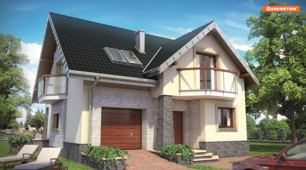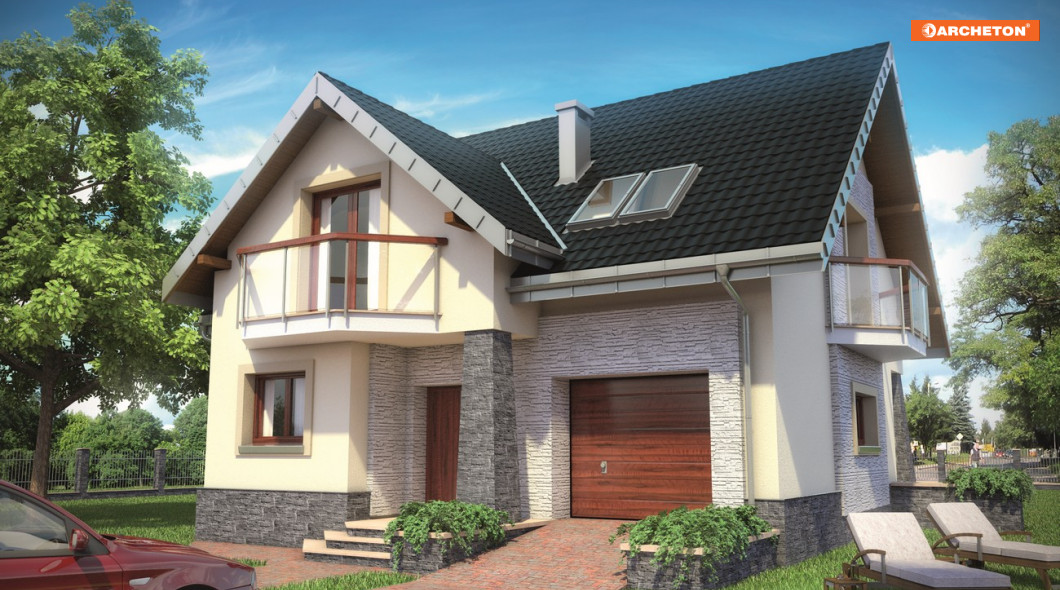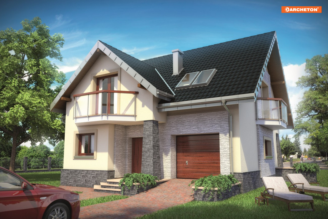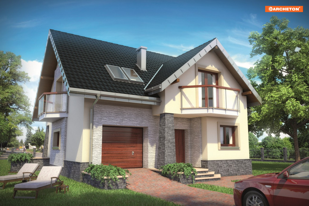 Wśród niewielkich domów parterowych z użytkowym poddaszem i garażem projekt domu Magnus ma jedną z najbardziej malowniczych brył. Obrys, zbliżony do kwadratu, wzbogacono od frontu i ogrodu podłużnymi wnękami, pozostawiając narożne słupy w formie skarpy. W ścianie bocznej dodano ryzalit z jadalnią, zwieńczony balkonem, a od frontu, na całej szerokości części mieszkalnej, oparto dużą lukarnę w dachu akcentującą wejście. W ten sposób założenie o dość skromnym programie funkcjonalnym zyskało charakter willi, przypominając zdecydowanie większe, reprezentacyjne projekty domów: Hermes czy Hortensja. Projekt domu Magnus przeznaczony jest dla czterech osób, które na parterze mają do dyspozycji jednoprzestrzenny układ holu ze schodami, kuchni, jadalni i salonu, a na poddaszu strefę prywatną. Trzy sypialnie z balkonami i dużą łazienkę otaczają centralnie ulokowaną klatkę schodową i niewielki przedpokój. Dwie garderoby wykorzystują miejsce pod skosami dachu. Garaż z kotłownią dostępne są z sieni. Rozbudowany charakter sylwetki zaproponowano podkreślić różnymi materiałami wykończenia elewacji.
