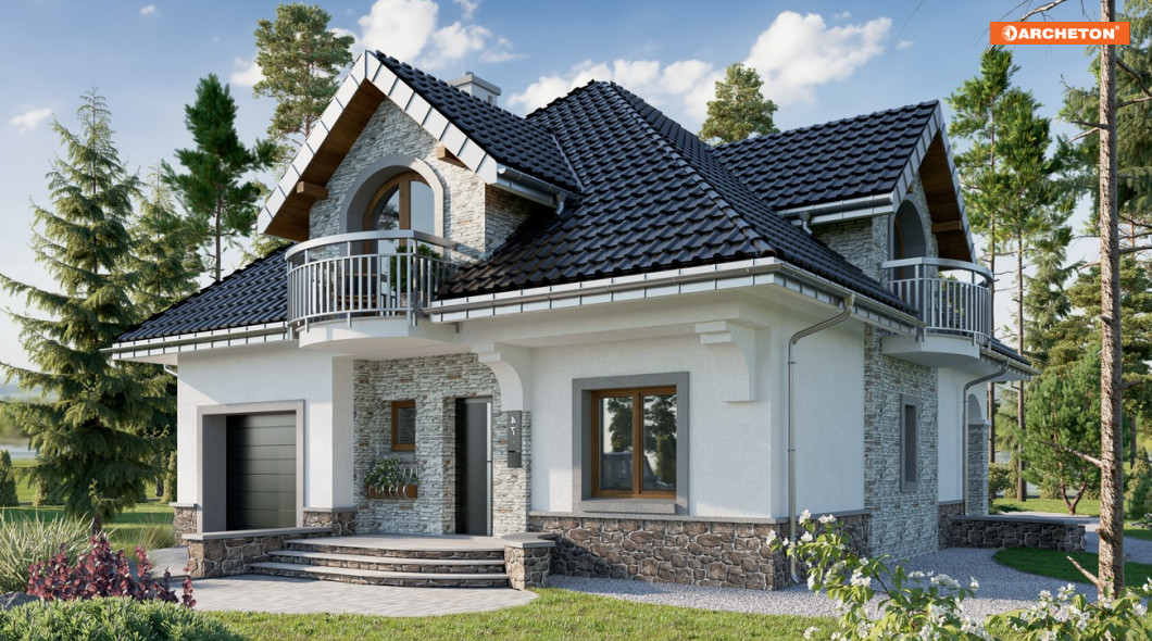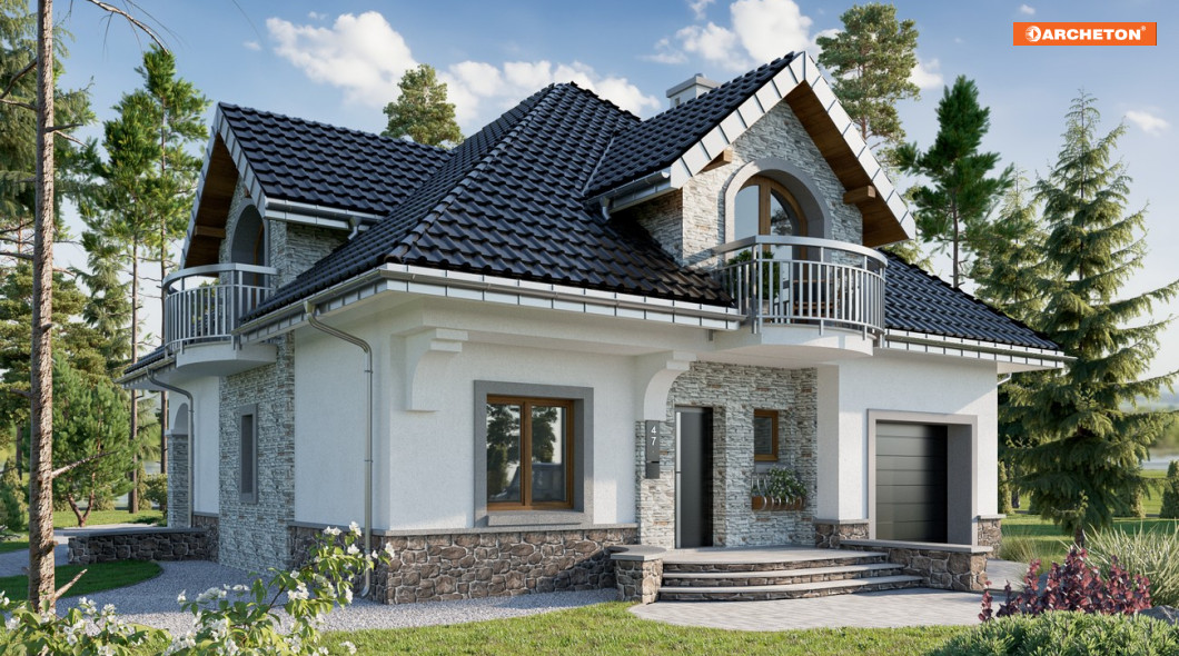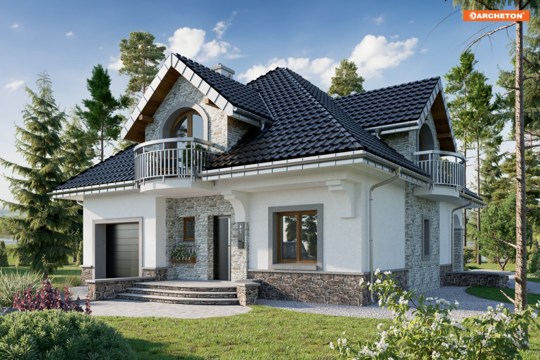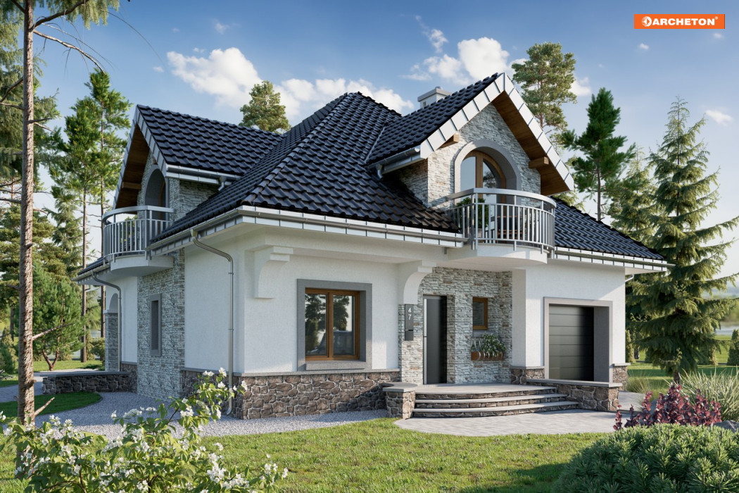 Gloria należy do domów średniej wielkości w tej grupie, dysponujących wbudowanym garażem. Jest to dom o reprezentacyjnym charakterze miejskiej willi, oferujące ponadprzeciętny standard przestrzeni mieszkalnej. Najciekawszy w tym projekcie jest zaskakujący mariaż tradycyjnej sylwetki i bogatego detalu architektonicznego z nowocześnie prostą koncepcją organizacji parteru. Główną rolę w kadrowaniu jednoprzestrzennego wnętrza pokoju dziennego projektant powierzył schodom. Spiralny, dekoracyjny wachlarz zabiegowych stopni odsunięto nieco od osi wejście frontowe – taras ogrodowy. Wypełniając centralną przestrzeń projektu domu Gloria konstrukcja oddziela ruchliwy hol od jadalni, intymny aneks kominkowy od tętniącej życiem kuchni. Bez pomocy ścian określa funkcje i atmosferę poszczególnych części strefy dziennej. Takie usytuowanie i otwarty charakter klatki schodowej integruje obie kondygnacje domu: skraca dystans miedzy parterem i poddaszem, dając wrażenie większej przestrzeni na obu poziomach mieszkania.