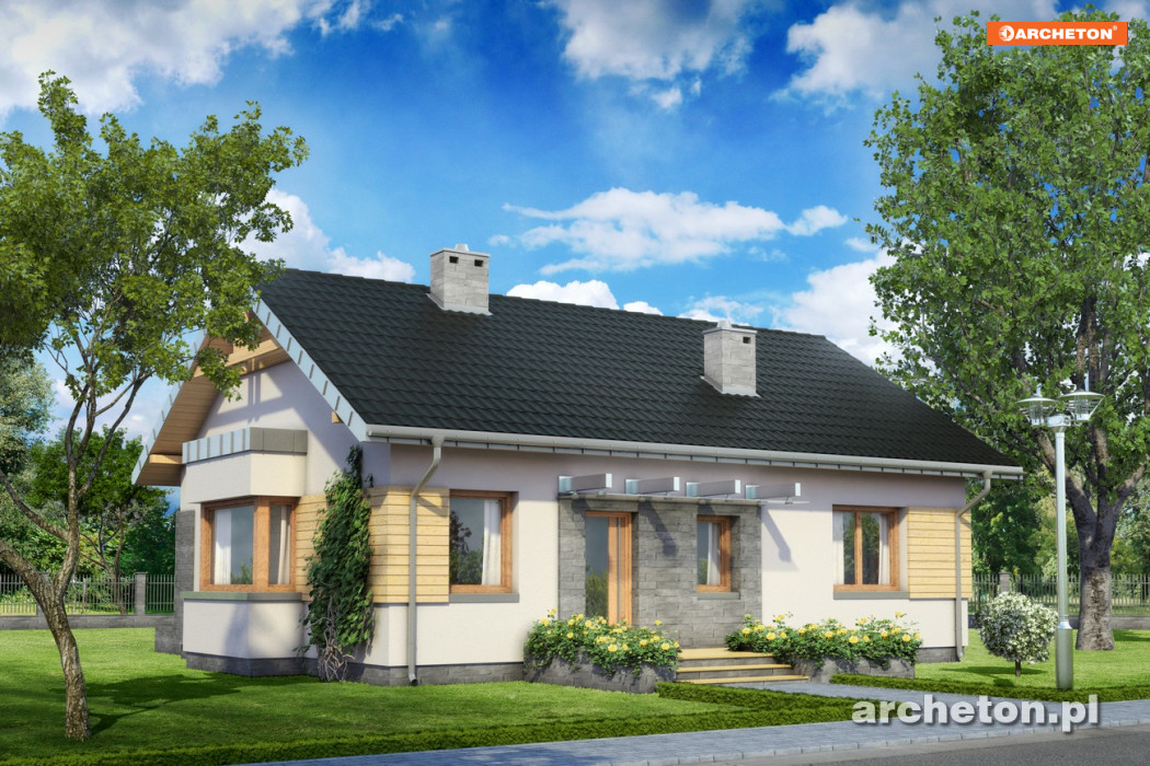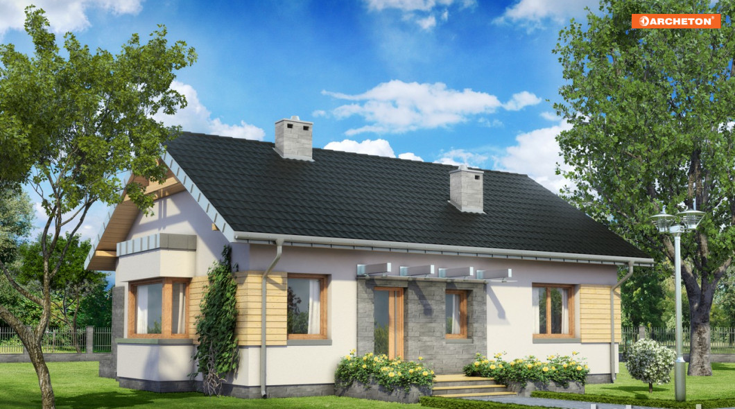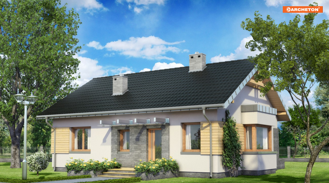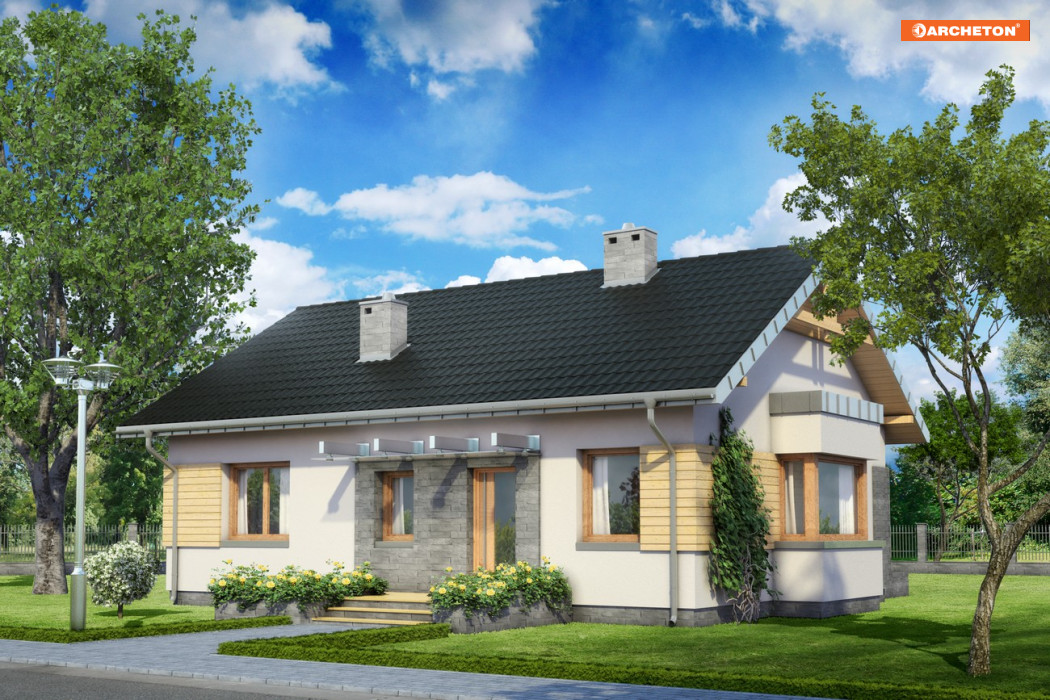 Projekt domu Alida jest jedną z kilku propozycji Archetonu o powierzchni użytkowej ok. 80m2, bez garażu. Zbudowana na planie zgrabnego prostokąta, z dwuspadowym dachem i kalenicą równoległą do drogi dojazdowej należy do rozwiązań o bardzo zwartej sylwetce. Przeciwnie do podobnej Agaty i Nuty z dwoma sypialniami, wydzielono w niej więcej pokoi. Trzy sypialnie Alidy są całkiem spore kosztem nieco bardziej oszczędnej przestrzeni pokoju dziennego oraz dostępnej z sieni kotłowni. Znakiem rozpoznawczym wszystkich wymienionych projektów jest ryzalit jadalni w ścianie szczytowej. W Alidzie ma formę płasko przekrytej kostki i wyróżnia go całkowite przeszklony pas okien, bez podziałów murowanymi filarkami. Konstrukcja projektu domu Alida umożliwia użytkowe wykorzystanie poddasza po adaptacji. Rezygnacja z jednej z sypialni i doprojektowanie w powiększonym salonie schodów udostępni na drugiej kondygnacji ok. 30m2 powierzchni, po której można się poruszać w pozycji wyprostowanej.