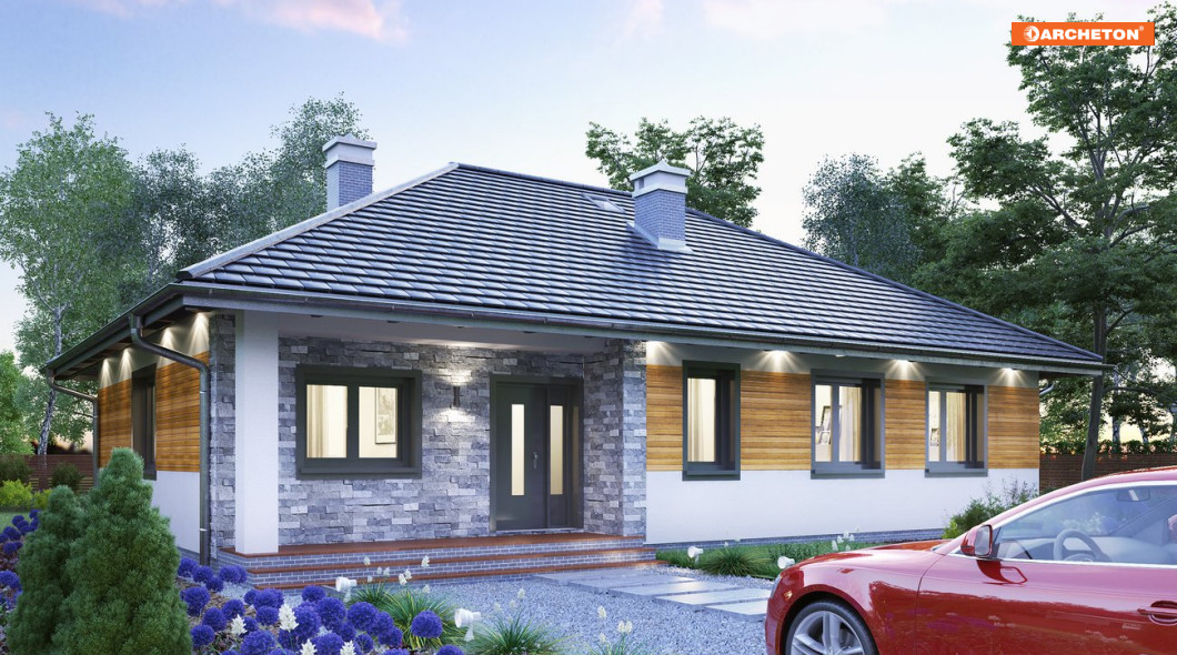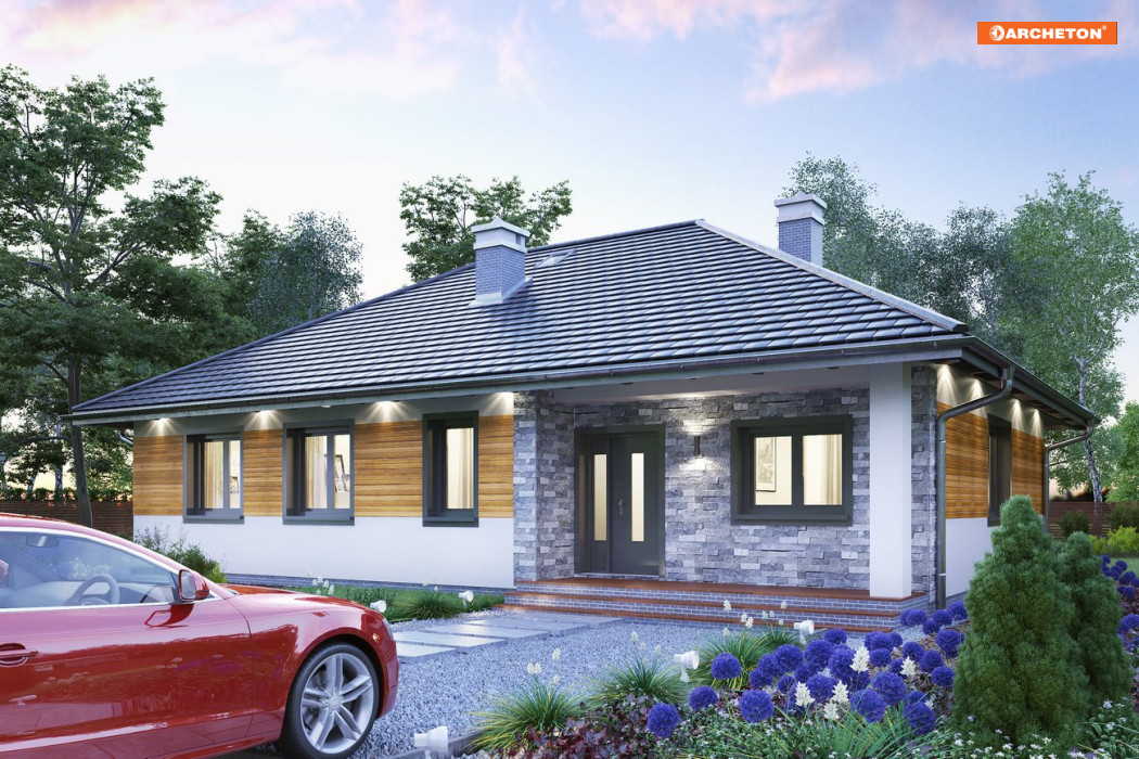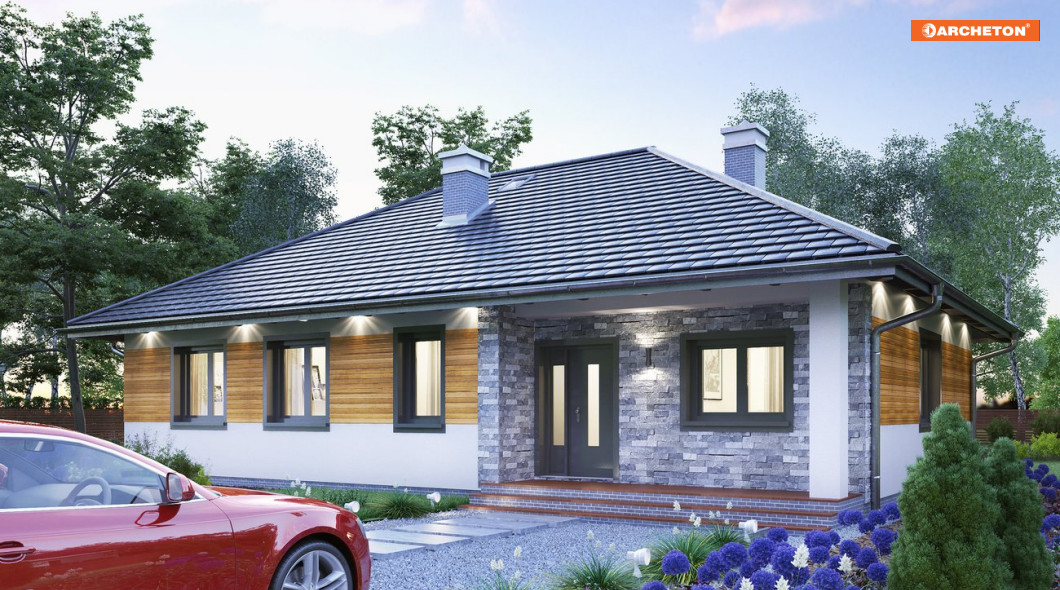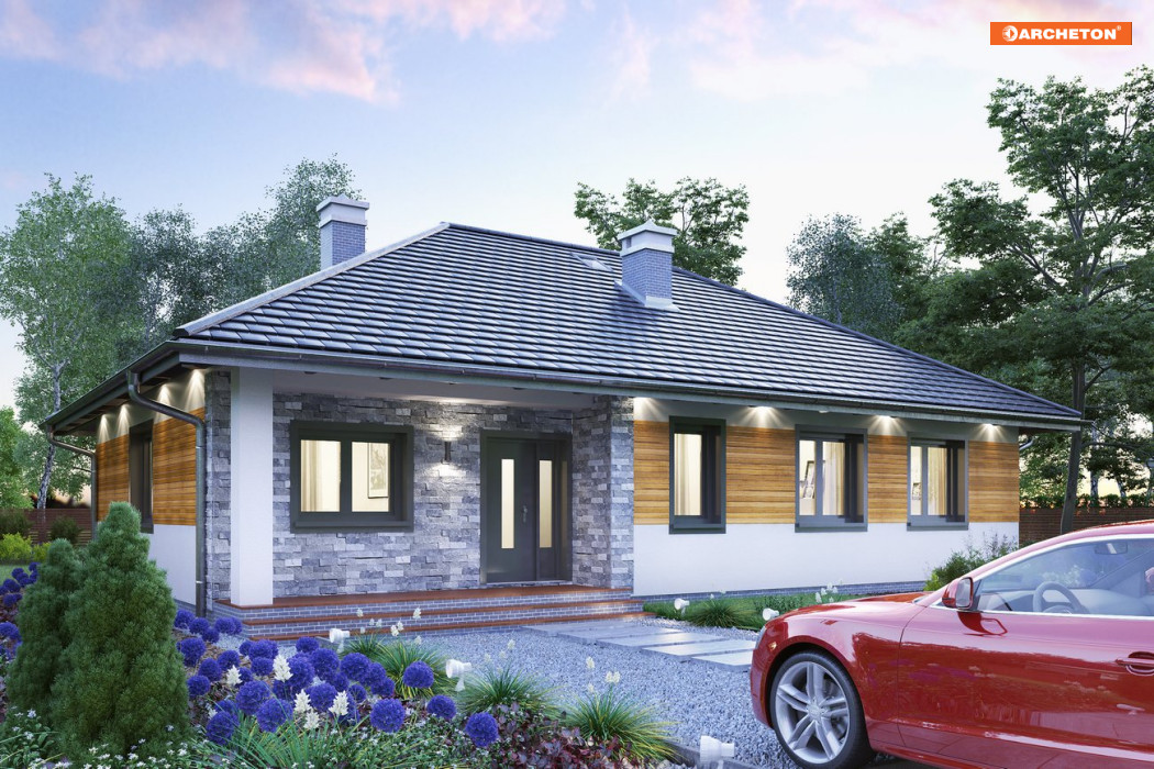 Projekt domu parterowego Lena Eko, tak jak wersja Lena jest o ok. 15m2 większy od Leny Bobo i wymaga o ok. 1,5 m węższej działki. Wszystkie warianty Rodziny Leny rozwiązano bez garażu, na rzucie prostokąta, z narożną, płytką wnęką tarasu wejściowego. Mają najprostsza bryłę spośród podobnych koncepcji o czterospadowym dachu z kalenicą równolegą do drogi dojazdowej, w swoich kategoriach wielkości. Rzut podzielono czytelnie prostym układem konstrukcyjnym, co w domu parterowym ułatwia odseparowanie otwartej części dziennej od przedpokoju strefy nocnej (nawet dodatkowymi drzwiami). Lena Eko oferuje o jedną więcej sypialnię i większy salon niż Lena Bobo, ale układ mieszkania pozostaje podobny, z dwoma łazienkami. Kotłownię ulokowano przy wejściu. Poddasze w tej wersji można adaptować na użytkowe po dodaniu w ramach adaptacji oszczędnych schodów (np. w salonie). Projekt domu Lena Eko jest identyczny w formie zewnętrznej i programie użytkowym jak Lena ale proponuje rezygnację z wentylacji grawitacyjnej i konstrukcję przegród budowlanych, która poprawia wskaźnik Ep o połowę w stosunku do minimalnych wymagań obowiązujących w 2018r.