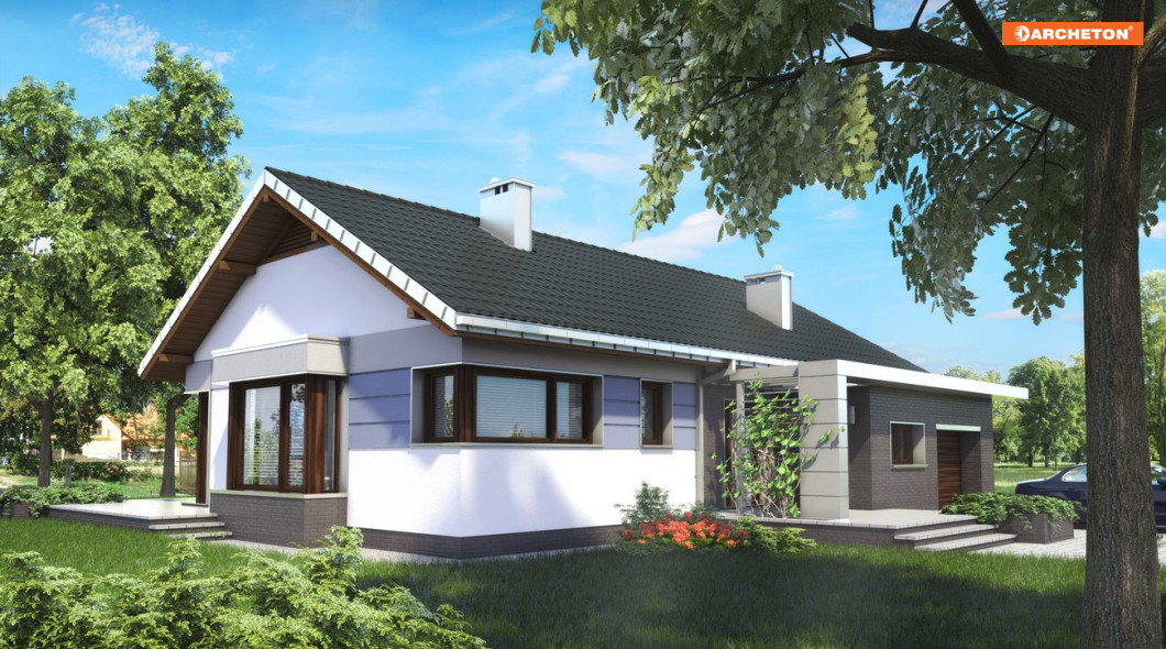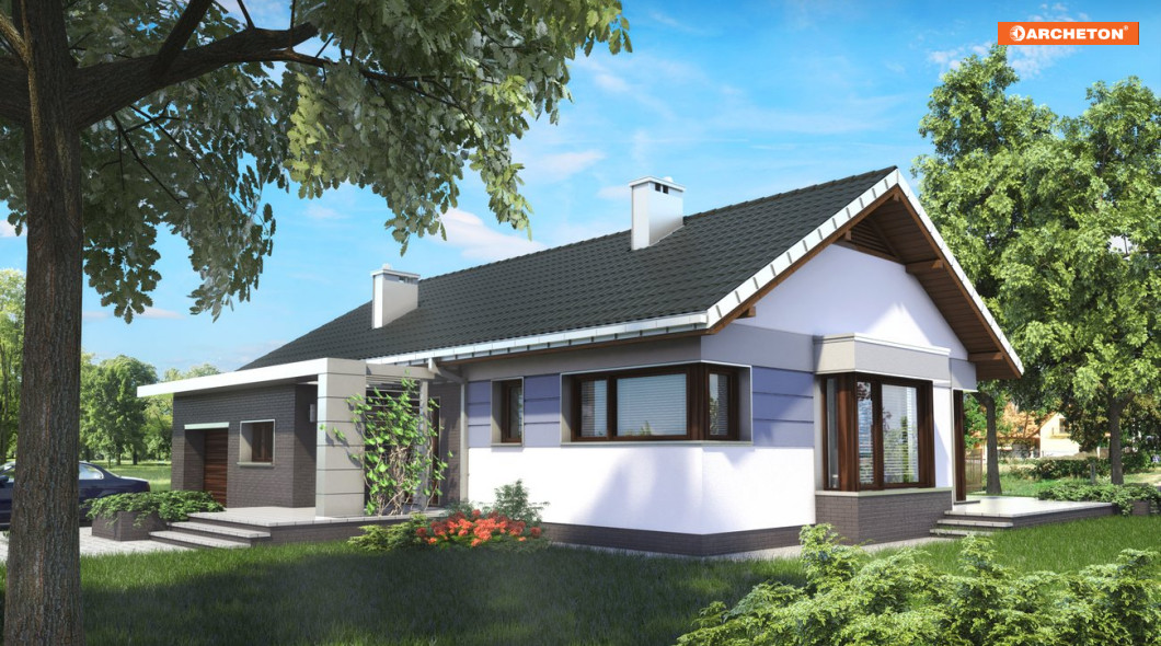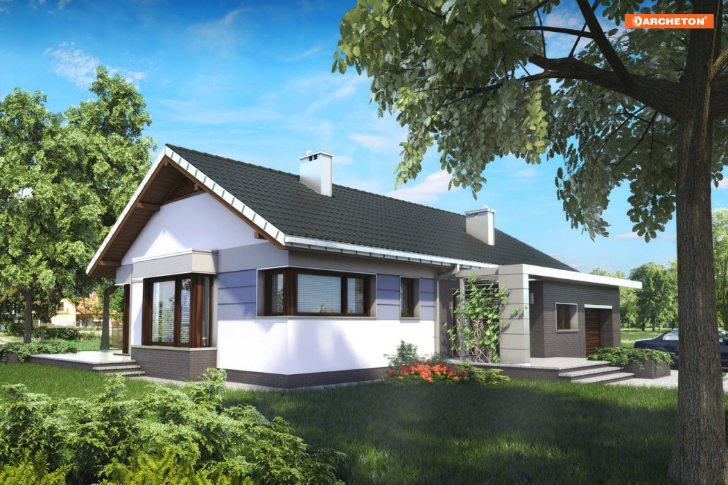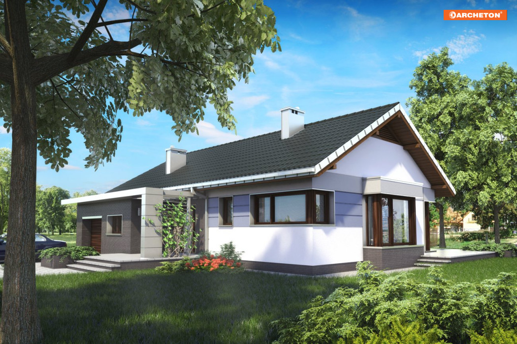 Zręczne połączenie mieszkania i pomieszczeń gospodarczych w niewielkim domu parterowym nie jest łatwe. Projekt domu Lambert proponuje rozwiązanie, w którym część garażowa wsunięta jest w główną bryłę i dostępna z holu, ale jednocześnie oddzielona wizualnie przez zróżnicowanie sposobu zadaszenia. Dzięki temu front tradycyjnej sylwetki domu akcentuje ciekawie praktyczna wnęka z geometrycznym, modernistycznym detalem architektonicznym. Czteroosobowa rodzina znajdzie w Lambercie otwarty salon z jadalnią w jasnym ryzalicie, kuchnię ze spiżarnią, łazienkę i 3 wygodne sypialnie. Południowe światło docierające do nich zostało złagodzone pergolą wspartą na masywnym słupie tarasu. Przy garażu ulokowano mini pralnię oraz kotłownię z mnóstwem miejsca na dowolny rodzaj paliwa i podręczny składzik. Całkowity brak okien w jednej ze ścian bocznych sprawia, że projekt domu Lambert wymaga węższej działki. W określonych warunkami miejscowymi przypadkach może również stanąć na granicy działki, a z projektem w odbiciu lustrzanym (Lambert L) stworzyć układ bliźniaczy.