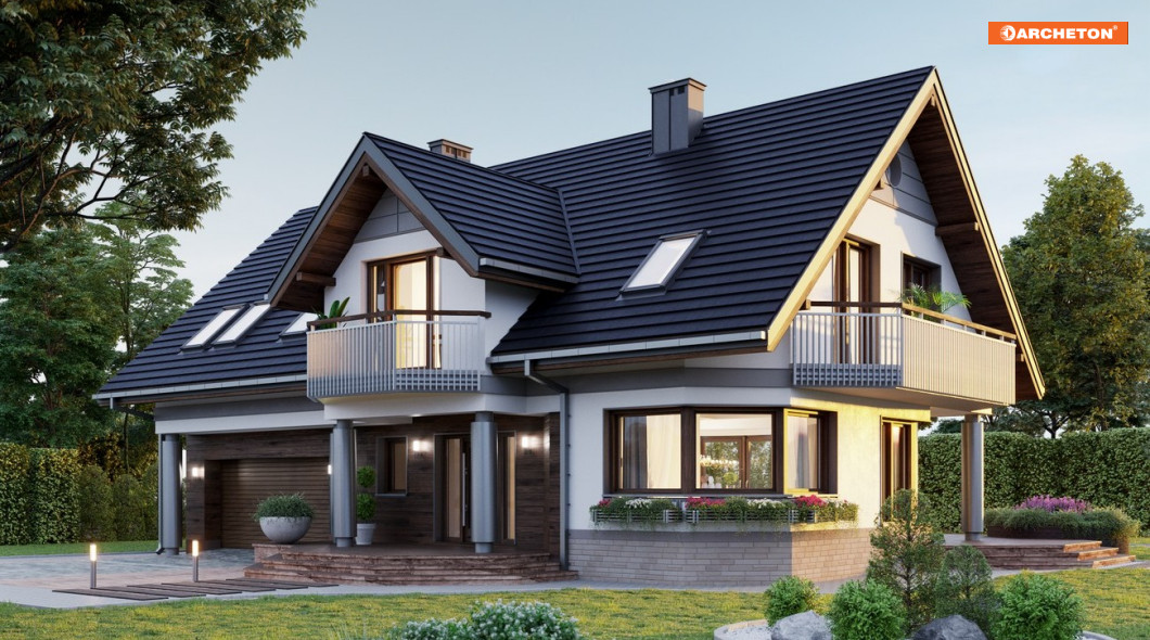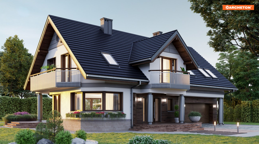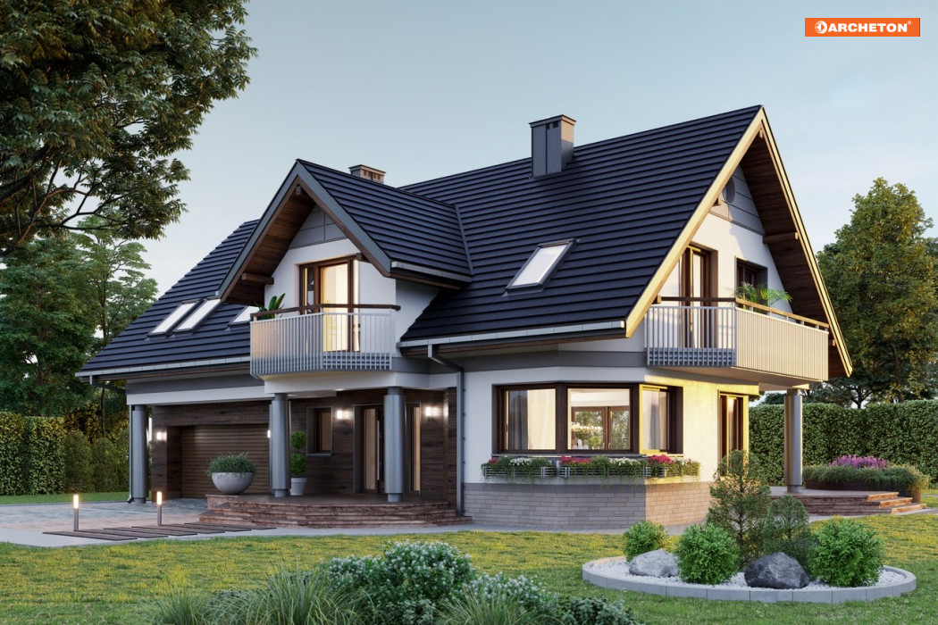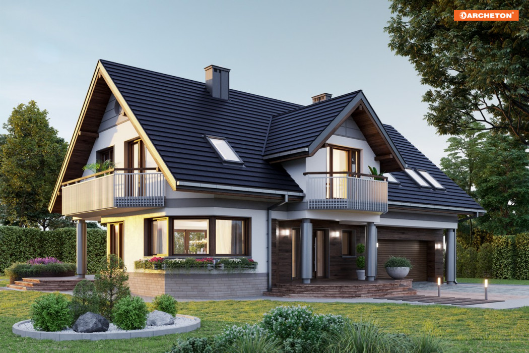 Projekty domów parterowych z użytkowym poddaszem, w których tak, jak w Heliotropie postawiliśmy na rozmach formy i niestandardową wielkość, zgrupowane zostały w kolekcji mini rezydencji Archetonu. Na rozbudowanym rzucie Heliotropa umieszczono strefę mieszkalną i dostępną z holu część gospodarczą. Dwustanowiskowy garaż sąsiaduje tu z dużą kotłownią i umożliwia przejście na tyły posesji. Jest to projekt domu, dla osób lubiących światło i przestrzeń w mieszkaniu. Parter pozostał w całości otwarty - dzieli go jedynie centralnie usytuowany kominek. Na poddaszu są cztery pokoje, łazienka oraz na osobnym poziomie nad garażem, komfortowy zespół głównej sypialni z łazienką, garderobą i pralnią.