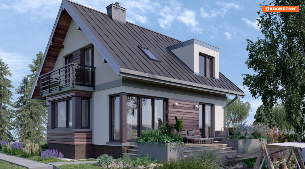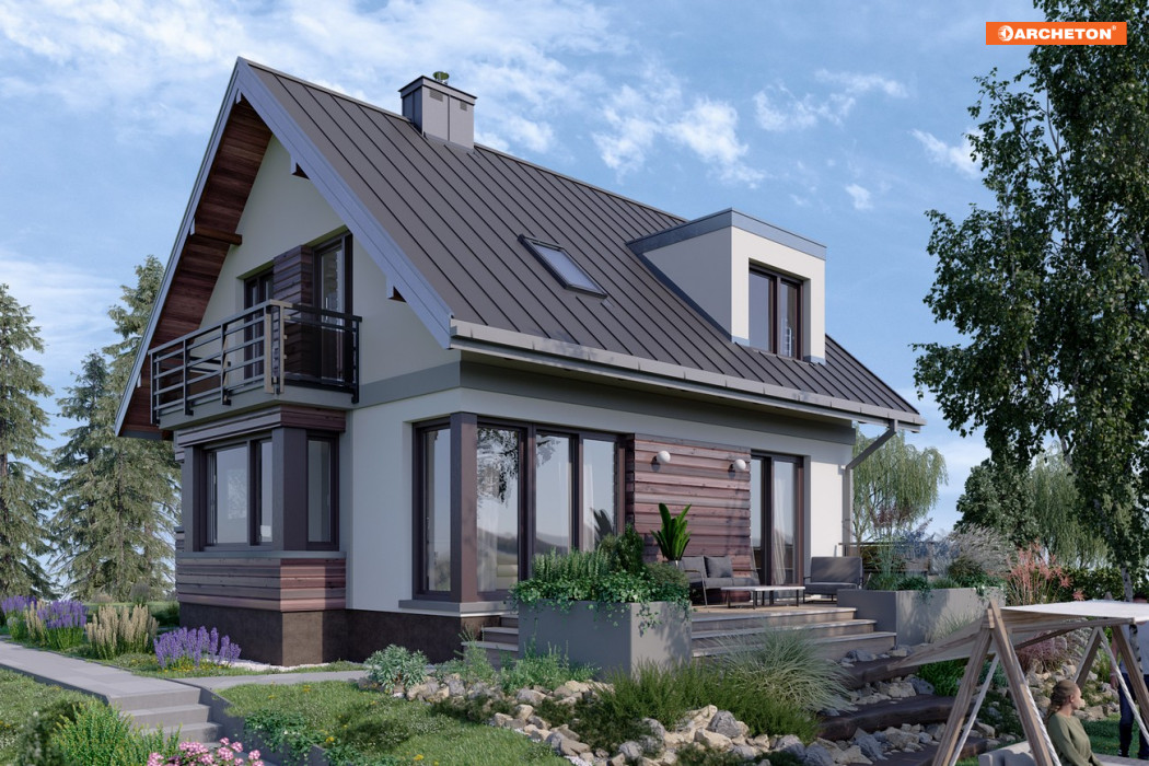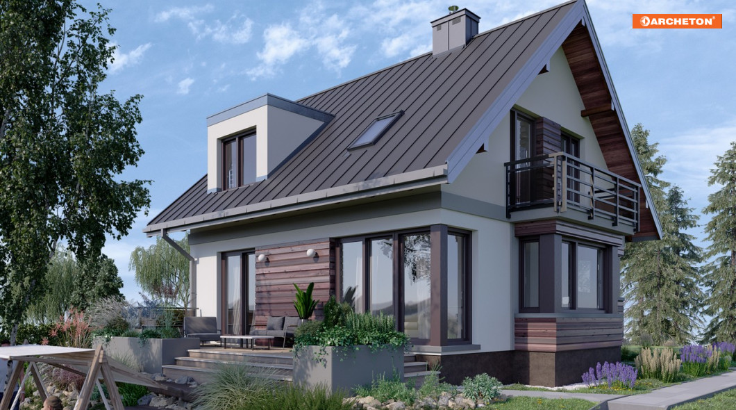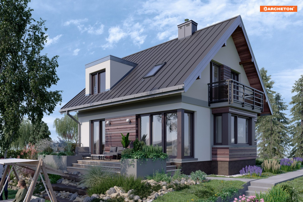 Mały dom z użytkowym poddaszem, na działce z lekkim pochyleniem ku wjazdowi, ma w Archetonie kilka odsłon (np. tradycyjne w sylwetkach rodziny Kraba i Fiony). Projekt domu Mirona Solo, bez garażu, wyróżnia styl, który sprawia, że także w grupie wszystkich propozycji z dodatkowym pokojem na parterze, o powierzchni 100-120m2 i z kalenicą równoległą do drogi dojazdowej koncepcja ta ma najbardziej awangardową sylwetkę.