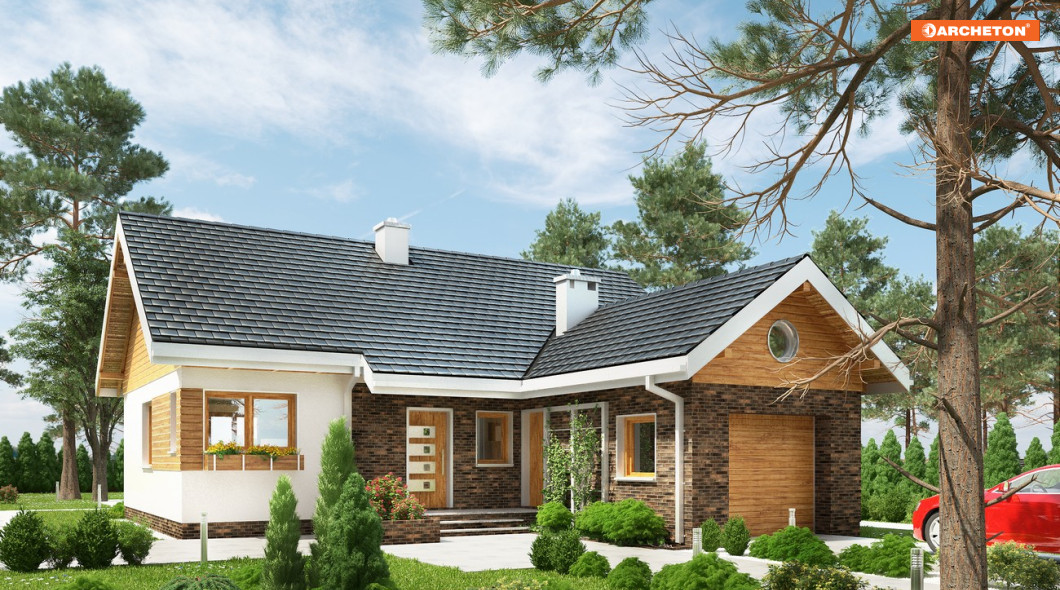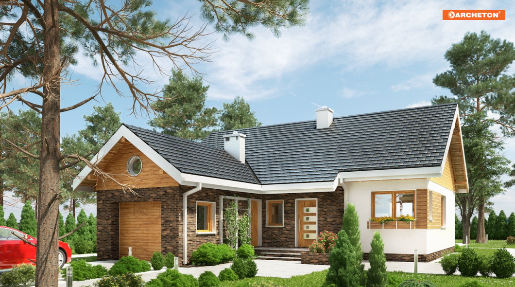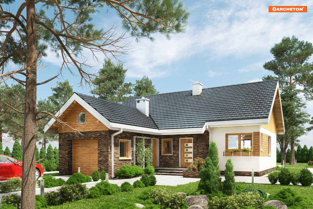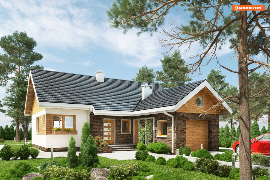 Projekt domu parterowego Tymianek to doskonałe rozwiązanie na działkę o ograniczonych gabarytach. Bryły mieszkania i garażu połączono na rzucie litery L tak, że brama garażowa stanowić może, w niektórych warunkach zabudowy, część ogrodzenia działki. Dwuspadowy dach domu skierowany jest kalenicą równolegle do drogi dojazdowej, przeciwnie niż dostawiony od frontu garaż. Powstało praktyczne, urokliwe patio osłonięte okapem głównego budynku, opuszczonym nad wejściami do obu części.