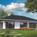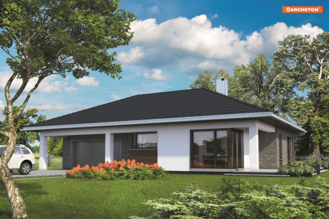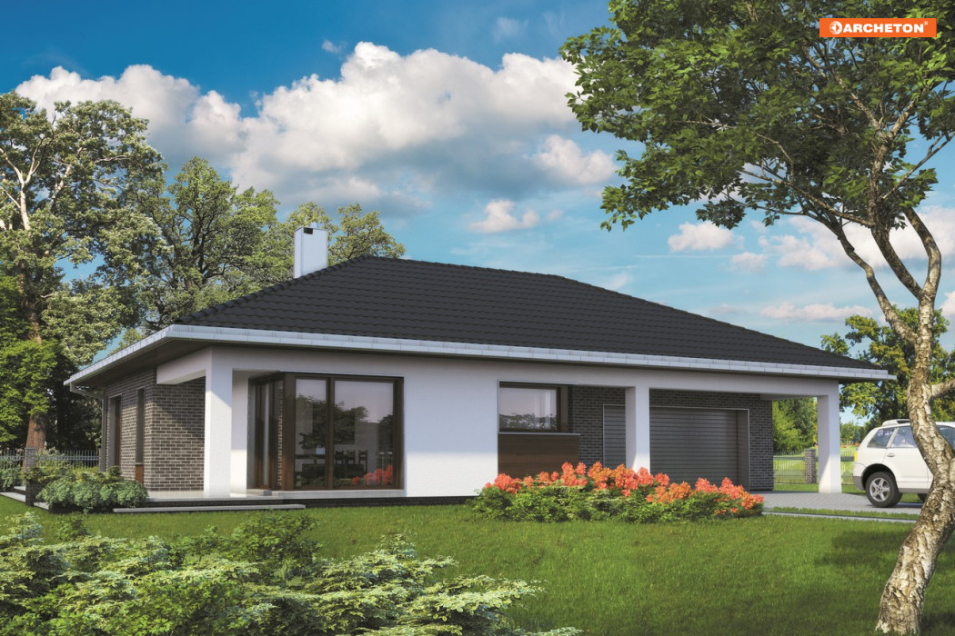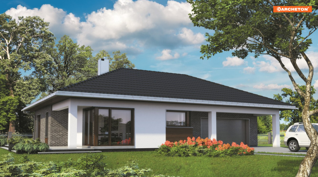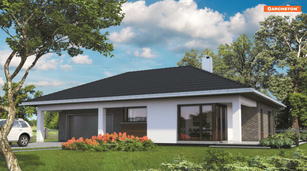 Projekt parterowego domu Tamara to jedna z co najmniej kilku propozycji średniej wielkości z dwustanowiskowym garażem w ofercie Archetonu. W zakresie powierzchni ok. 150m2 odróżnia się już jednak wyraźniej od podobnego rozwiązania – Aurelii, także rozlokowanej na planie litery T, ze środkowym skrzydłem skierowanym w głąb posesji. Jest w nim miejsce na cztery wygodne sypialnie, w tym główną - z garderobą i łazienką. Frontowe skrzydła obu domów mieszczą: otwartą przestrzeń salonu z kominkiem i kuchni ze spiżarnią z jednej strony oraz garaż z dużą kotłownią po drugiej stronie od wejścia. Bryła Tamary jest jednak prostsza za sprawą koncepcji dachu. Zamiast mnożyć mniejsze połacie podążając za przebiegiem ścian zewnętrznych, przekrycie nasuwa się na uskoki i wspiera na słupach. Tak powstałe podcienie osłaniają wjazd do garażu i wejście, a boczny - taras przy jadalni i duże, modernistyczne przeszklenia. Projekt domu Tamara naturalnie wtapia się w ogród starannie przemyślanym układem tarasów, stopni terenowych i donic, których rysunek wpisuje się w podziały elewacji.