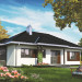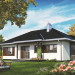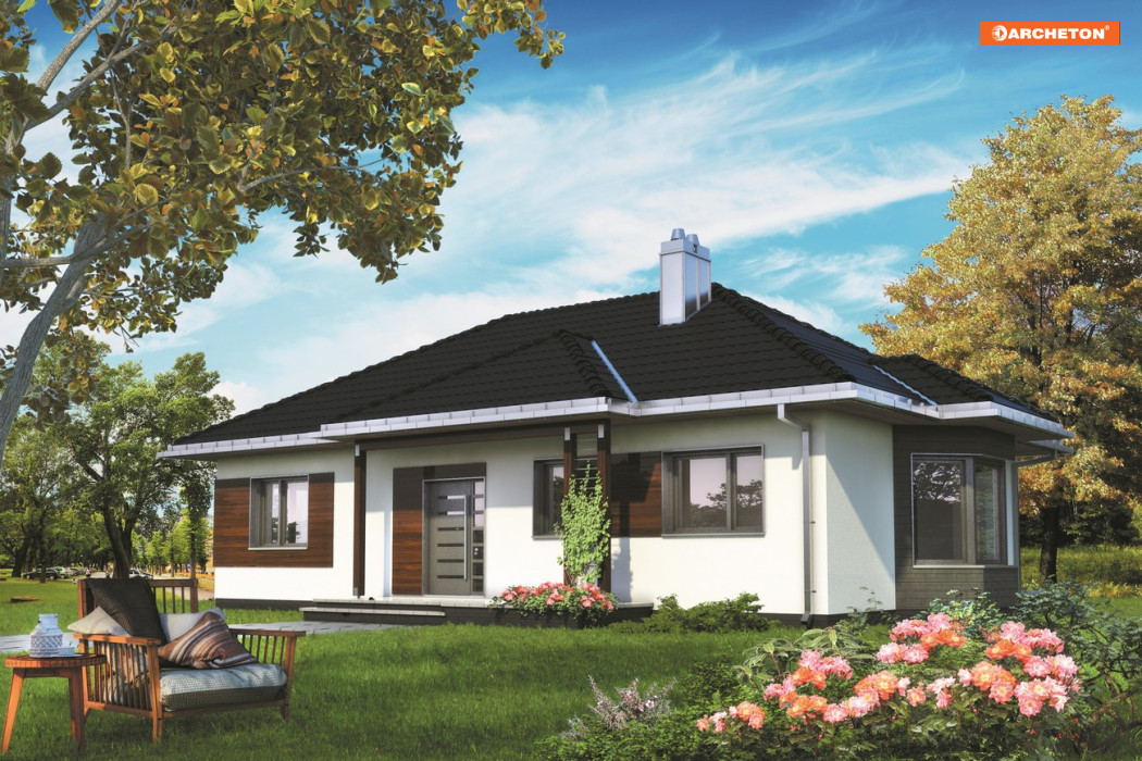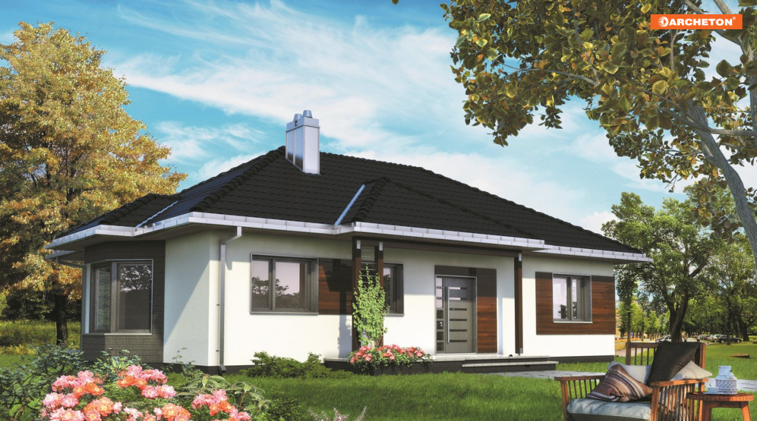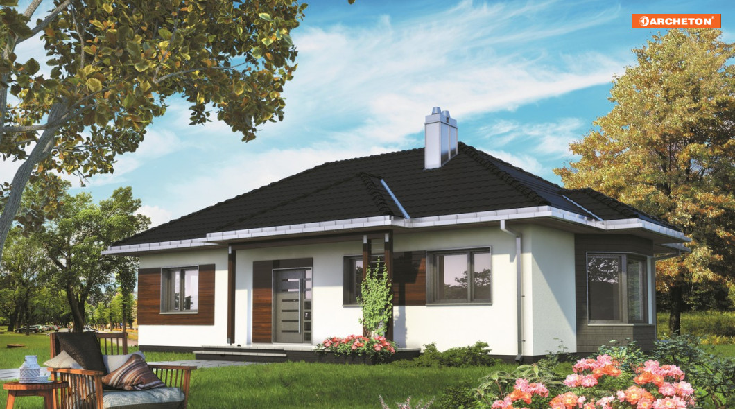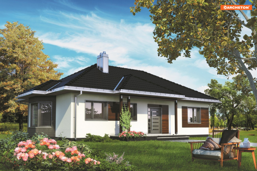 Bardziej zwarty rzut odróżnia projekt domu Milena od Kiry, wśród parterowych domów bez garażu, o powierzchni ok. 105m2. Znajdziemy tu wygodne wnętrza z wyjątkowo dużym, otwartym pokojem dziennym. Układ kuchni, spiżarni i łazienki gościnnej umożliwia połączenie większości przewodów komina w jeden blok przy kominku w salonie, blisko kalenicy. Gwarantuje to optymalizację kosztów oraz możliwie najlepszy ciąg przy stosunkowo niskim dachu. Usytuowanie jednego z pokoi strefy nocnej pozwala zaaranżować w nim zarówno gabinet, dostępny bezpośrednio z holu, jak i sypialnię. Projekt domu Milena ma czterospadowe, niezbyt strome przekrycie, a jego konstrukcja nie przewiduje wykorzystania poddasza na cele użytkowe. Połacie szybko znikają za okapem pozostawiając obserwatorowi jedynie prostokątne elewacje. Urozmaicono je proponując wejściowy i ogrodowy podcień na słupkach oraz ryzality: z jadalnią w części dziennej i z aneksem wypoczynkowym w głównej sypialni. Elementy te,rozmieszczone niesymetrycznie, rozbudowują zarys okapu i nadają zwartej sylwetce Mileny bardziej swobodny wyraz.