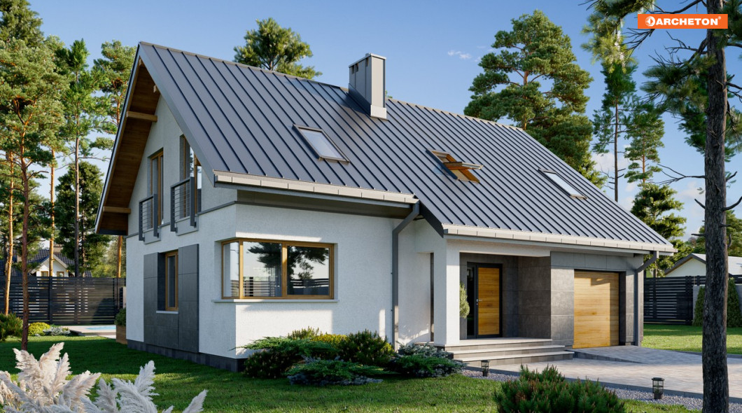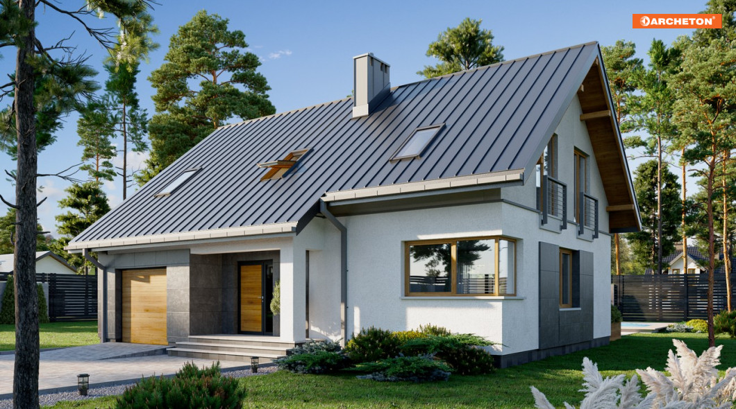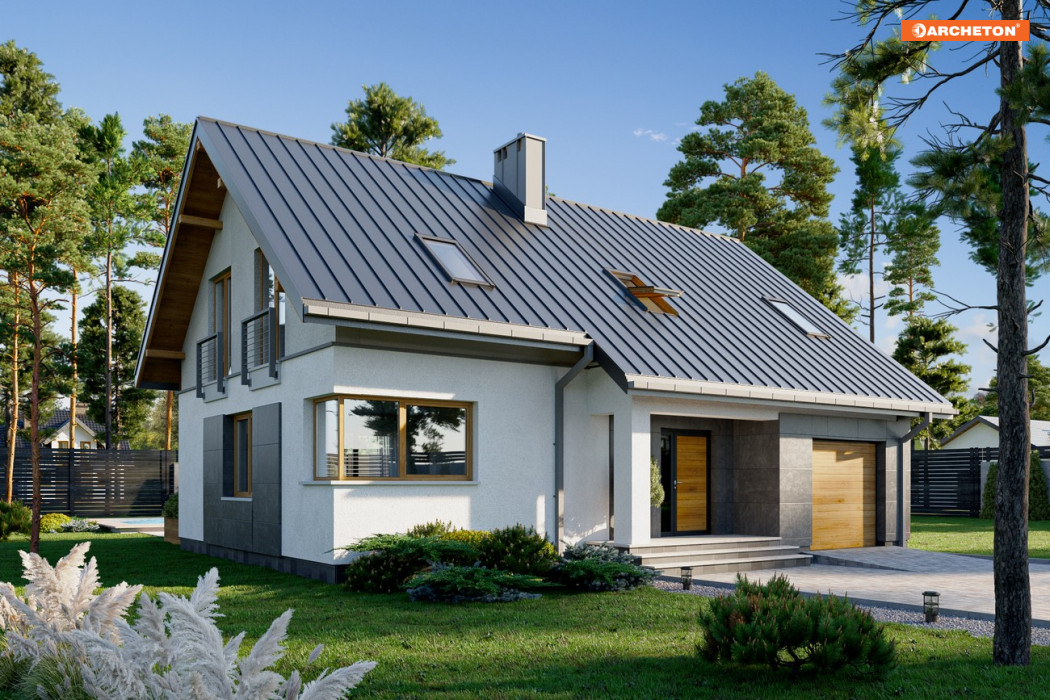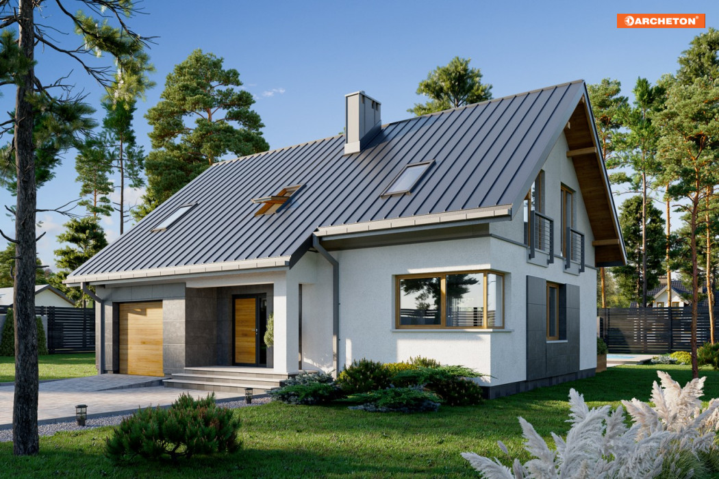 Średni w rodzinie Skarbka – projekt domu Skarbek As ma, tak jak pozostałe wersje, wszelkie cechy taniego, ładnego i funkcjonalnego domu. Zwarty prostopadłościan zamyka mieszkanie i wysunięty ku frontowi garaż - wszystko pod dwuspadowym dachem. Na parterze powstało przestrzenne rozwiązanie z otwartym pokojem dziennym i część gospodarcza z dużą kotłownią. Powierzchnia kuchni pozwala na wydzielenie wygodnej, przechodniej spiżarni. Pod schodami przewidziano pomieszczenie gospodarcze, w niewielkiej łazience - prysznic. Podobnie starannie rozplanowano użytkowe poddasze: są tu cztery sypialnie, przestronna łazienka i pralnia dostępne ze zgrabnego przedpokoju. Projekt Skarbek As jest prostszą wersją podobnego powierzchnią, ale odmiennego dzięki historyzującemu detalowi, Skarbka Mini. Zamiast balkonów są wysokie okna z barierką doświetlające poddasze, a w kuchni - narożne przeszklenie. Ganek z lukarną zastąpiono przedłużonym częściowo okapem z zacienioną wnęką wejścia, a od ogrodu zaproponowano zadaszenie na drewno do kominka.