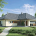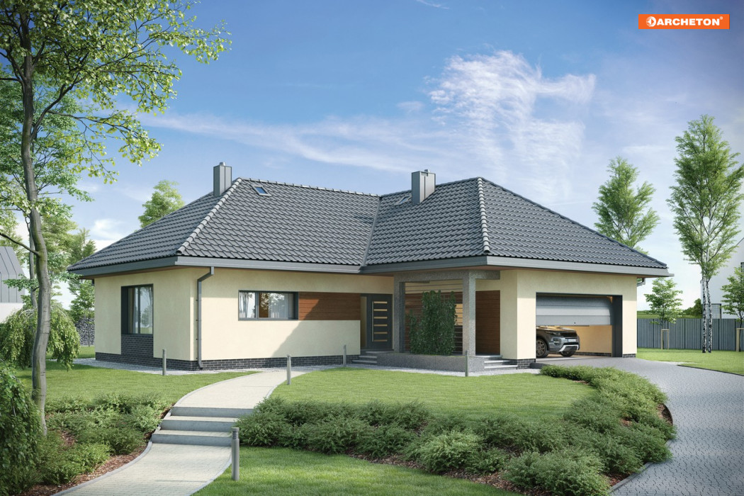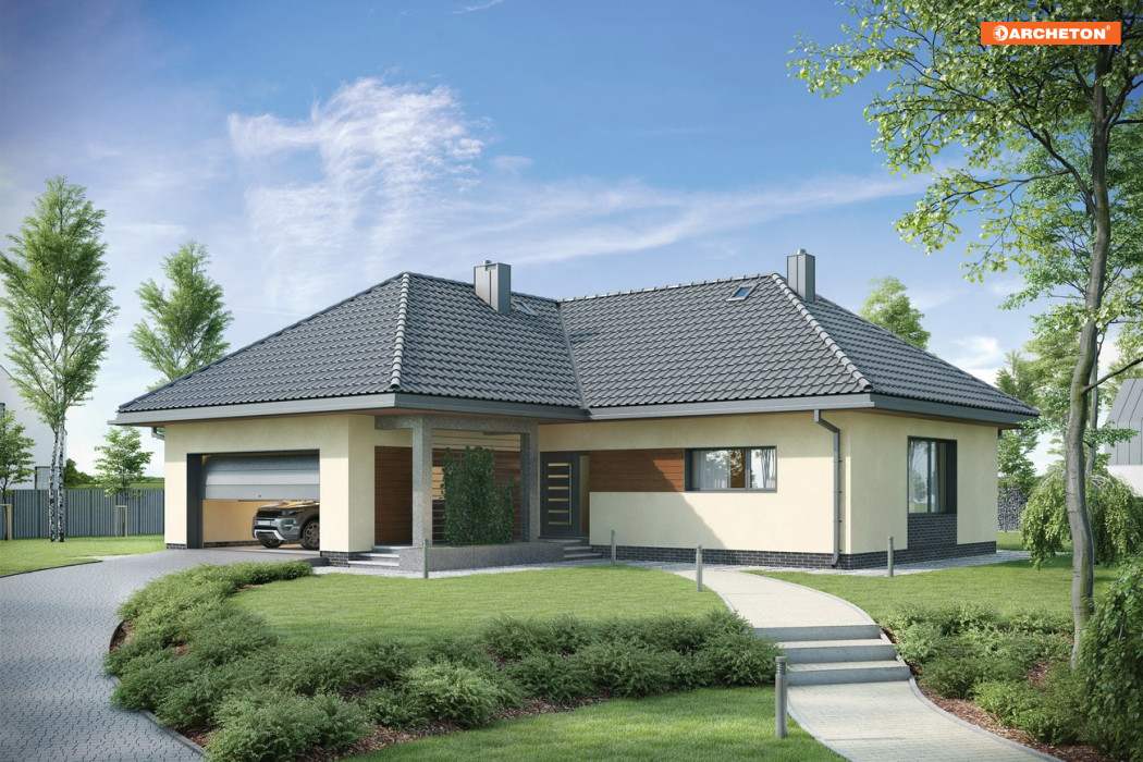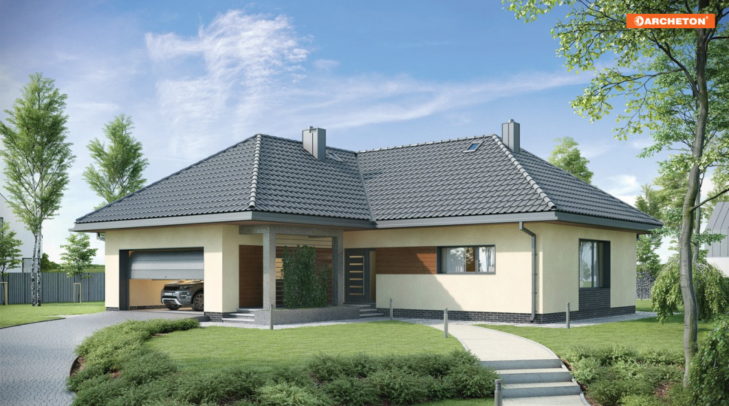 Jeśli dom parterowy ma mieć powierzchnię użytkową większą niż 100m2 i dwustanowiskowy garaż, to tylko wykorzystanie rozbudowanego rzutu umożliwia uzyskanie tradycyjnej bryły. Projekt domu Tymon jest jedyną propozycją o powierzchni ok. 110m2 spełniająca te założenia. Zbudowano go na planie w kształcie litery T, a czterospadowe, przenikające się dachy mają, dzięki temu umiarkowaną wysokość. Skrzydło garażowe wysuwa się ku frontowi działki i podcieniem na słupach prowadzi do sieni. Tu następuje rozprowadzenie: do kuchni (przez spiżarnię), do części gospodarczej (przez kotłownię) i na wprost, do otwartego pokoju dziennego, a dalej do ogrodu. Część prywatna z trzema pokojami i z dużą łazienką znajduje się w skrzydle za garażem, dostępna z połączonego z salonem holu. Główna sypialnię, położoną na tyłach mieszkania, wyróżnia wyjście na taras i największa powierzchnia. Projekt domu Tymon to propozycja o prostej architekturze; dominują poziome linie i duże okna bez dodatkowych podziałów. Każde odbijające się w nich otoczenie, zbuduje harmonijną kompozycję z tak neutralną sylwetką.