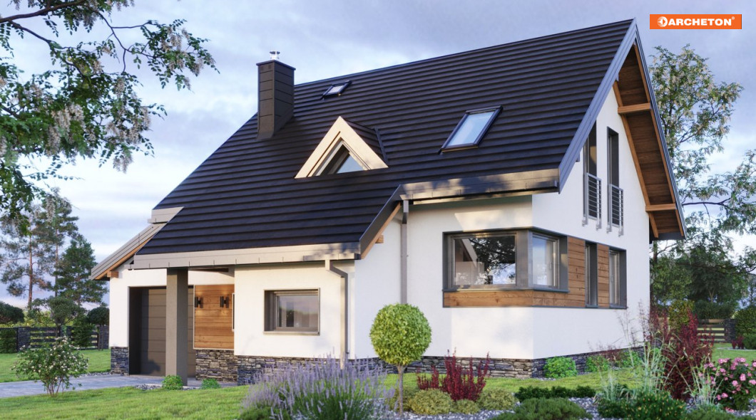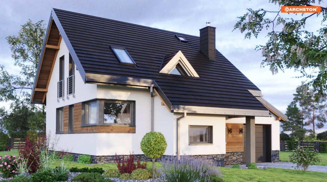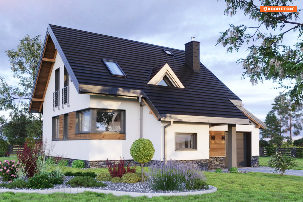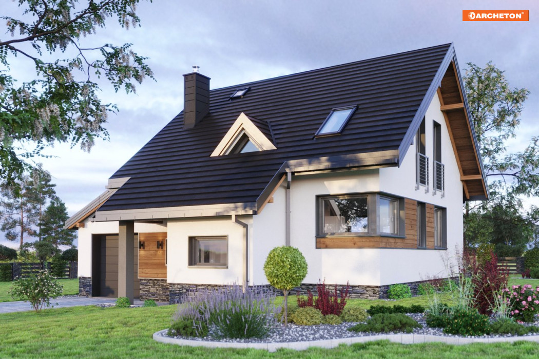 Rodzina Amelii to małe, tanie w budowie domy parterowe z użytkowym poddaszem. Podobnie jak Krab czy Fiona nadają się na działkę z lekkim pochyleniem w kierunku wjazdu, ale mają bardziej otwartą strefę dzienną oraz konsekwentnie zdyscyplinowaną sylwetkę (bez ryzalitu w ścianie bocznej i bez balkonów). Wszystkie wymienione propozycje, w tym najmniejszą – projekt domu Amelia Nano, cechuje bryła na planie zwartego prostokąta, z kalenicą równoległą do drogi dojazdowej. Wysunięty przedsionek przekrywa, wraz z podcieniem na słupie, przedłużony okap. Dodatkowy akcent od frontu stanowi mała trójkątna lukarna doświetlająca klatkę schodową. Do części mieszkalnej dostawiony jest garaż z pulpitowym dachem, który, razem z wejściem i kotłownią, ulokowano na poziomie niższym o 90cm w stosunku do głównego parteru. Projekt domu Amelia Nano nie ma spiżarni przy kuchni, a wszystkie wymiary zredukowano do funkcjonalnego minimum. Jego powierzchnia jest mniejsza o 30m2 od powierzchni projektu - matki - Amelii. W ten sposób rodziny projektów dają możliwość wyboru i przesuwania środków w ramach inwestycji: z rozmiarów na jakość wykonania, wykończenia oraz wyposażenia domu.