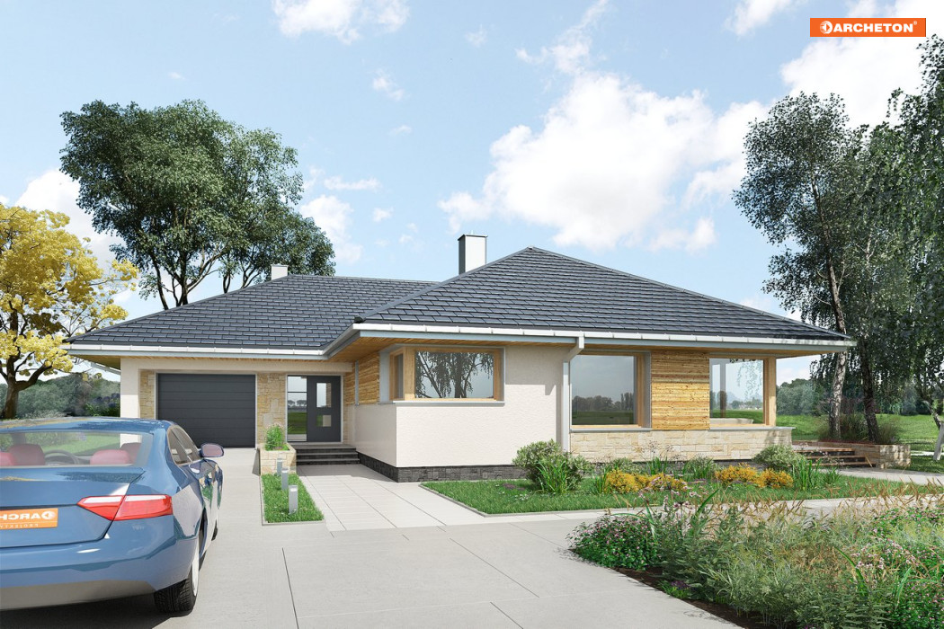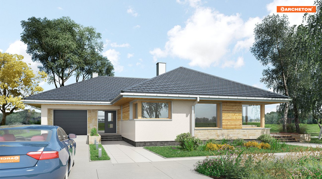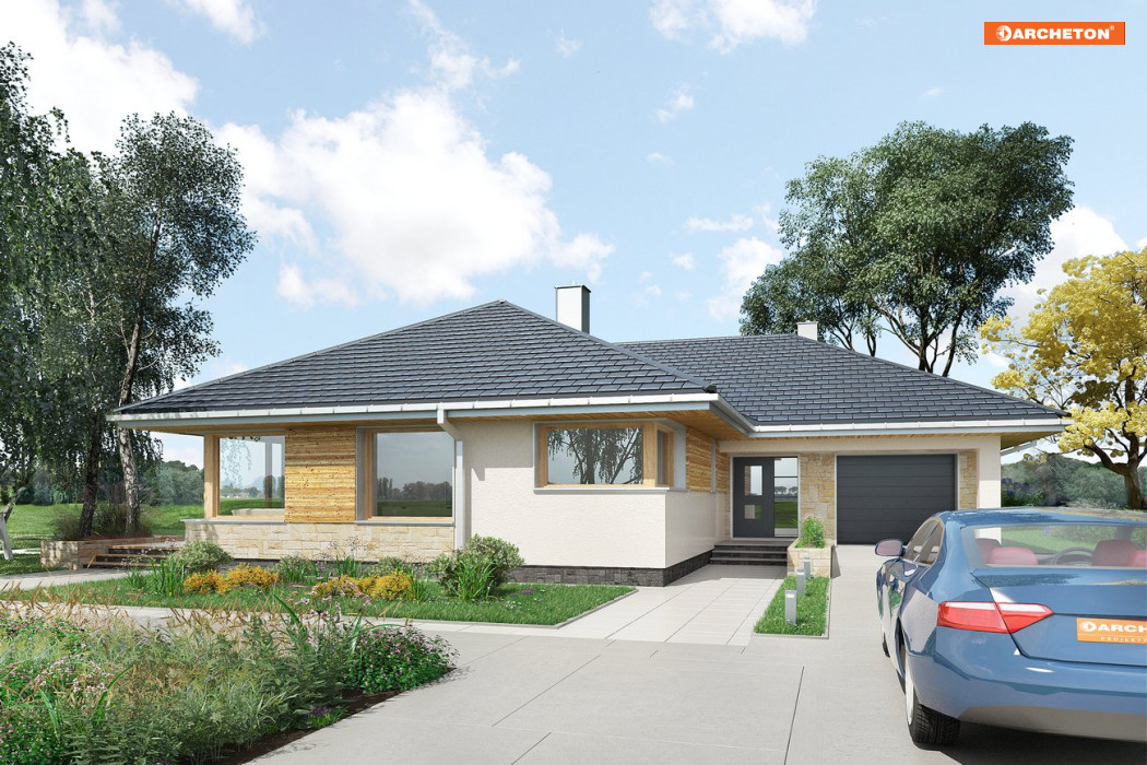 W grupie parterowych domów o powierzchni 100-110m2 p.u. z pojedynczym garażem Archetonu, projekt domu Cetyniec wyróżnia plan w kształcie litery L. Budynek przekryto przenikającymi się czterospadowymi dachami o jednakowej wysokości. Jednoprzestrzenny pokój dzienny otwiera się na front posesji narożnymi, efektownymi oknami. Część gospodarcza z garażem i z dużą kotłownią znajduje się w skrzydle cofniętym w głąb ogrodu, gdzie znajduje się wejście główne, podkreślone głębokim cieniem wnęki i okapu. Taki układ idealnie oddziela rekreacyjną część działki i otwarty z salonu taras od wjazdu i sprawia, że Cetyniec sprawdzi się na o działce skomunikowanej z drogą dojazdową od południa lub wschodu. Trzy sypialnie z drugą, większą łazienką tworzą ustronny zespół nocnej strefy prywatnej na tyłach domu. Projekt domu Cetyniec, jak większość niskich domów na rozbudowanych rzutach, łagodnie wpisuje się w przestrzeń poziomymi liniami. Duże swobodnie rozmieszczone tafle okien uporządkowano pasami drewnianej boazerii. Wpuszczają do wnętrz nie tylko mnóstwo światła ale także otoczenie domu, tworząc neutralną dla krajobrazu kompozycję.