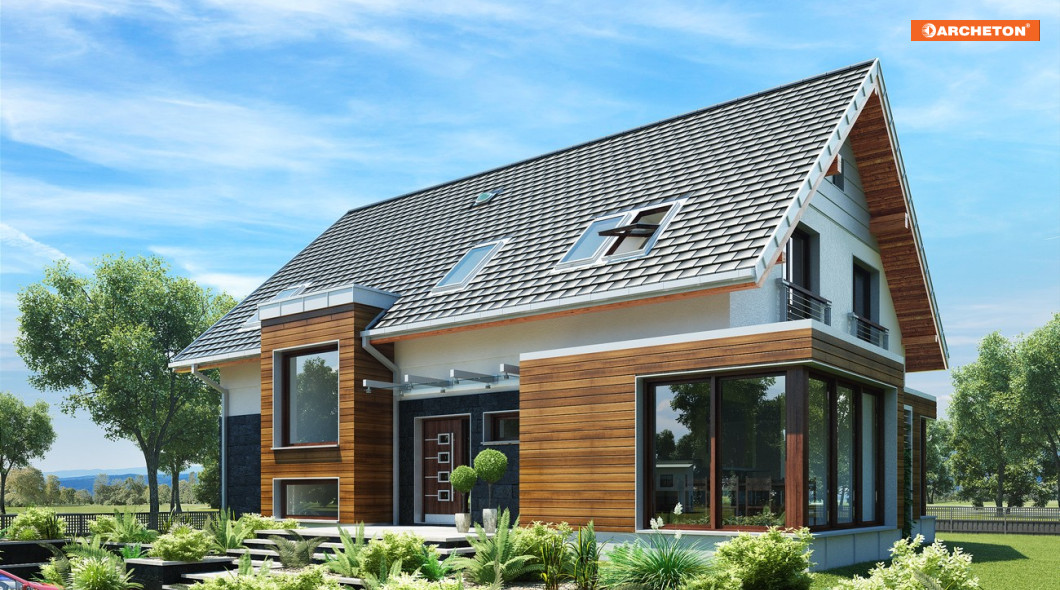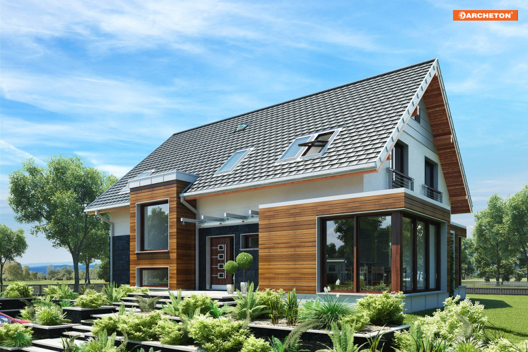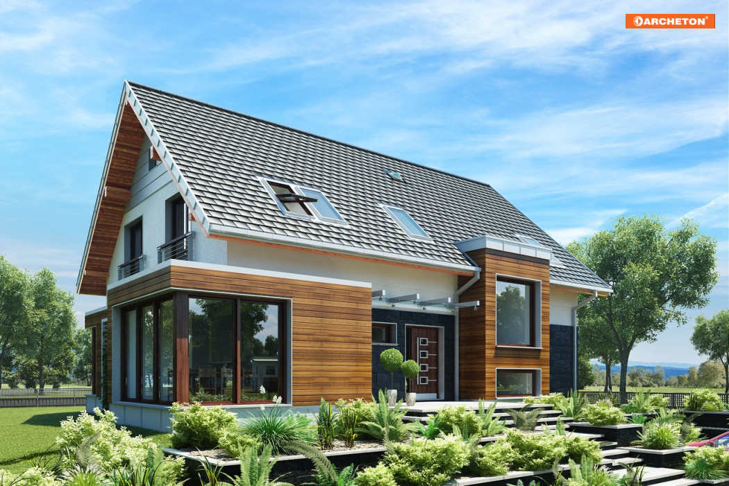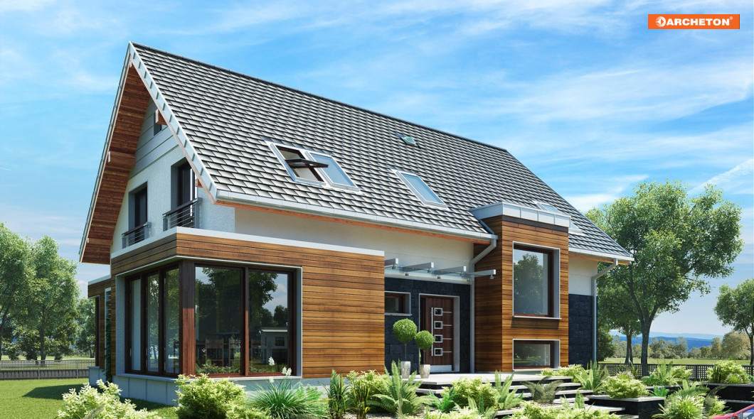 Projekt domu Helios Max jest największy w rodzinie propozycji o dużej powierzchni użytkowej. Zachowuje przy tym wszystkie charakterystyczne cechy rodziny: pierwszoplanową rolę kuchni w organizacji wnętrza parteru oraz wysunięte z elewacji ryzality. Podstawę efektownej sylwetki stanowi najprostszy dom parterowy z użytkowym poddaszem zaprojektowany na prostokątnym rzucie i przekryty dwuspadowym dachem. Oprócz zawiadywanej przez kuchnię strefy życia rodzinnego, parter dysponuje, tak jak równie obszerny wariant Stok, główną sypialnią z własną garderobą, łazienką oraz osobnym wyjściem na taras w podcieniu, dostępny także z salonu. Dodatkowy trakt wiodący bezpośrednio od wejścia frontowego do ogrodu wyraźnie oddziela ją od części wspólnej. Tak jak wersja Stok, projekt domu Helios Max przewiduje pełne podpiwniczenie ale jako jedyny nie ma garażu. Wyjątkowo wygodna część prywatna składa się z pięciu sypialni, pokoju kąpielowego i pralni. Ten wariant charakteryzuje najbardziej rozbudowany kształt bryły. Przeszklona jadalnia jest największa, a elewację ogrodową przecina w pionie dwukondygnacyjny ryzalit przechodzący w płasko przekrytą lukarnę.
