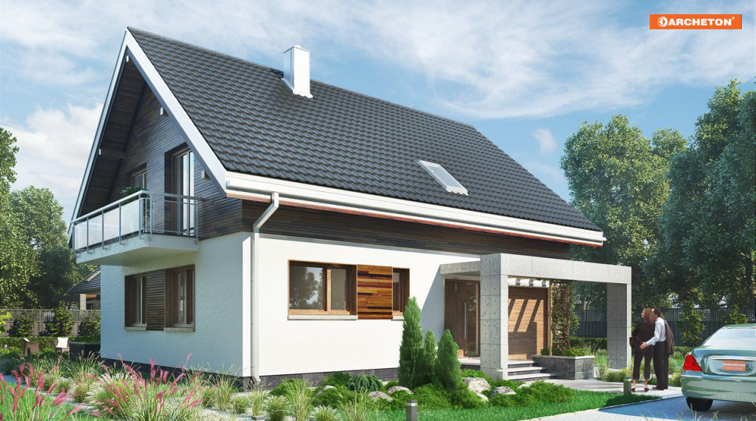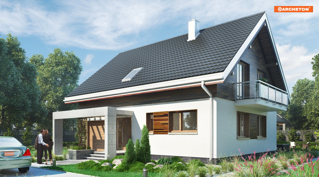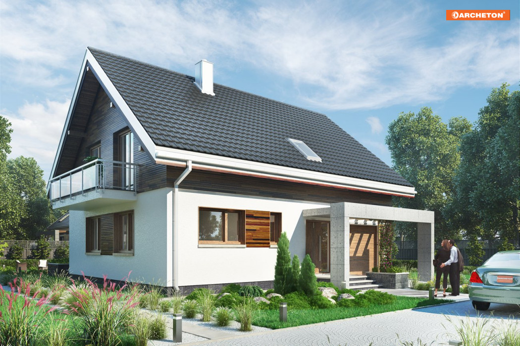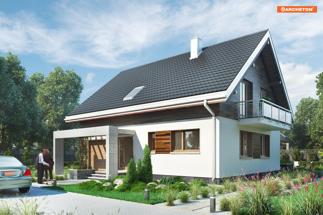 Jedną z bardziej ekonomicznych inwestycji w zakresie budowy domów jednorodzinnych z użytkowym poddaszem, o powierzchni 110-130m2 zrealizować można w oparciu o projekt domu Oberek. Rodzina koncepcji Oberka (a także Tola, Zefir, Omega czy Zojka Neo) proponuje mieszkanie z garażem i z kotłownią pod jednym, tanim dwuspadowym dachem bez lukarn, na planie zdyscyplinowanego prostokąta o zgrabnych proporcjach. Wszystko to decyduje także o niskich kosztach eksploatacji (ogrzewania) domu i o ładnym, nowoczesnym efekcie plastycznym, który osiągnąć można nawet przy skromnych środkach na wykończenie elewacji. Parter w Oberku to otwarta strefa salonu i kuchni oraz niewielka łazienka i wygodny hol ze schodami na poddasze. Garaż z dużą kotłownią dostępny jest z sieni, podobnie jak spiżarnia przy kuchni. Taki program funkcjonalny oferują również Tola czy Omega ale w innym układzie przestrzennym poszczególnych pomieszczeń. Poddasze w projekcie domu Oberek, z ustawnymi sypialniami dla 5 osób oraz z dużą łazienką, doświetlono głównie tradycyjnymi oknami w ścianach szczytowych. Minimalistyczną stylistykę przełamują balkony i rama z pergolą nad wejściem frontowym.