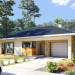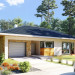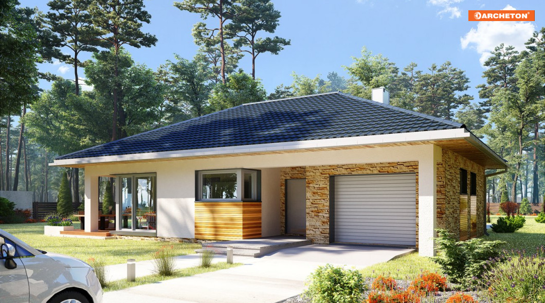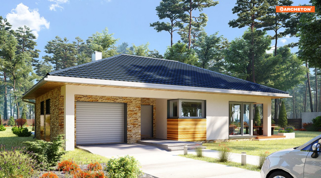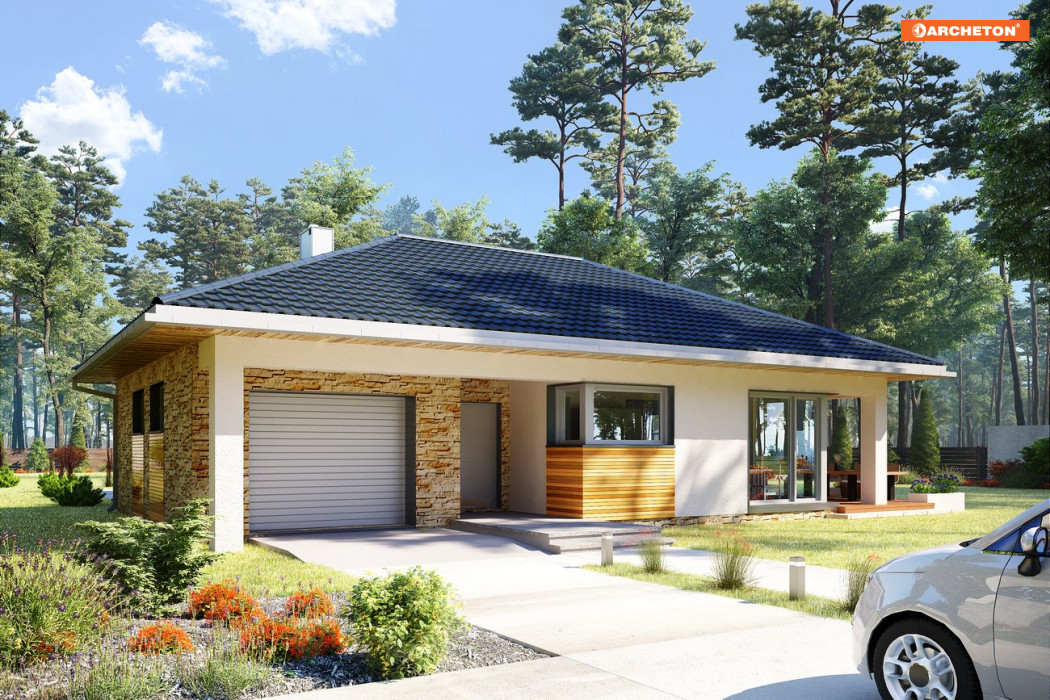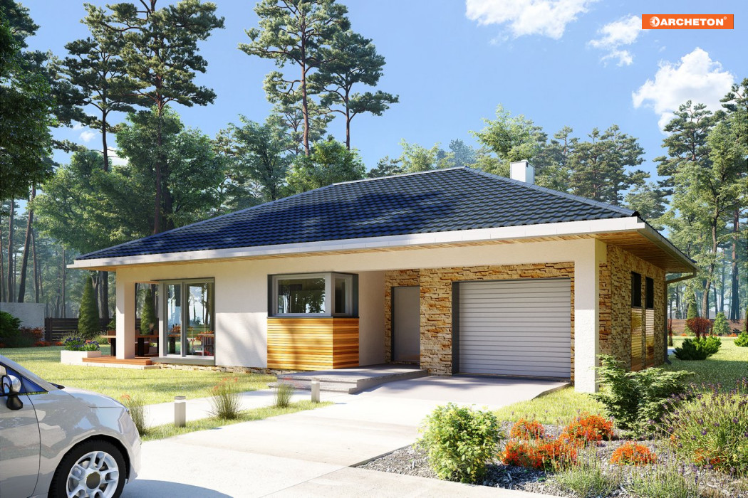 Projekt parterowego domu Tamara Polo to jedna z kilku propozycji średniej wielkości z garażem w ofercie Archetonu. W zakresie powierzchni użytkowej ok.140m2 odróżnia się od innych, zbudowanych na planie litery T i przekrytych czterospadowymi przenikającymi się dachami. Front posesji zajmuje skrzydło z kalenicą równoległą do drogi dojazdowej, a nie prostopadłą jak w zbliżonej Kamelii czy Tymoteuszu. Inaczej niż w nieco większej Tamarze, przewidziano w nim miejsce na pojedynczy garaż, a otwarta na salon kuchnia jest mniejsza i nie ma spiżarni. Cztery sypialnie z dwoma łazienkami i zespół gospodarczy z kotłownią za garażem rozwiązano niemal identycznie w skrzydle ogrodowym. Z częścią dzienną łączy go w salonie przejście za kominkiem, który w Tamarze przylega do kuchni. W obu wariantach projektu dach nasuwa się na uskoki w przebiegu ścian zewnętrznych i wspiera na słupach, a powstałe w ten sposób narożne podcienie osłaniają wjazd do garażu, wejście główne oraz taras przy jadalni i efektowne, przeszklenia. Projekt domu Tamara Polo naturalnie wtapia się w otoczenie niewysoką sylwetką i starannie przemyślanym układem tarasów, stopni terenowych i donic.