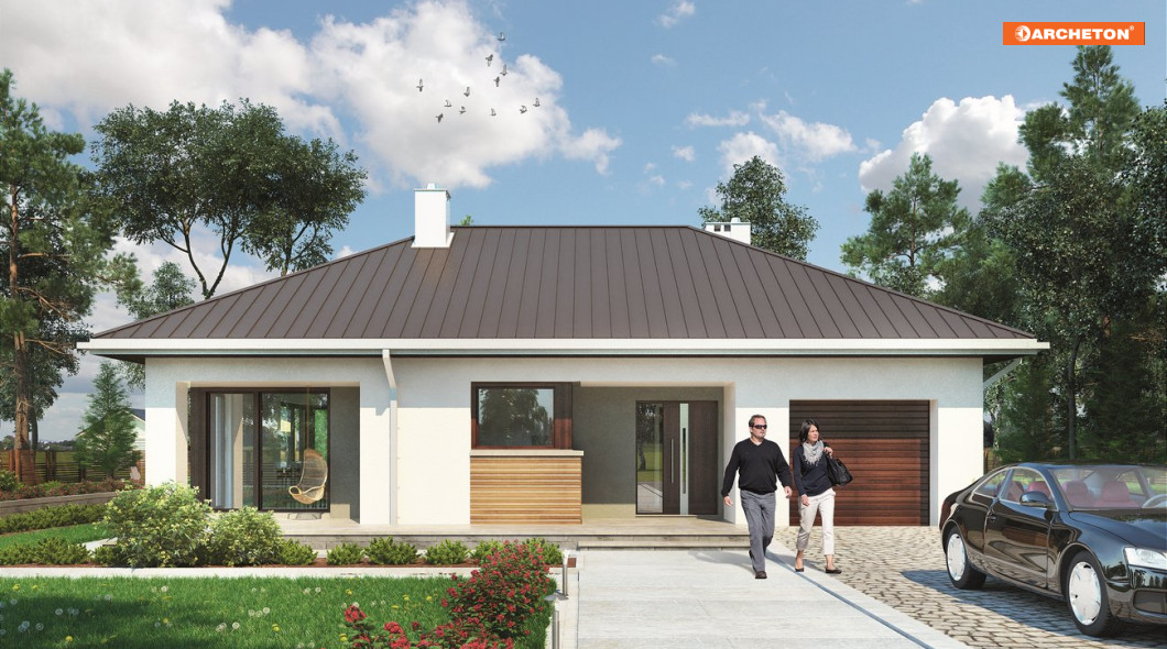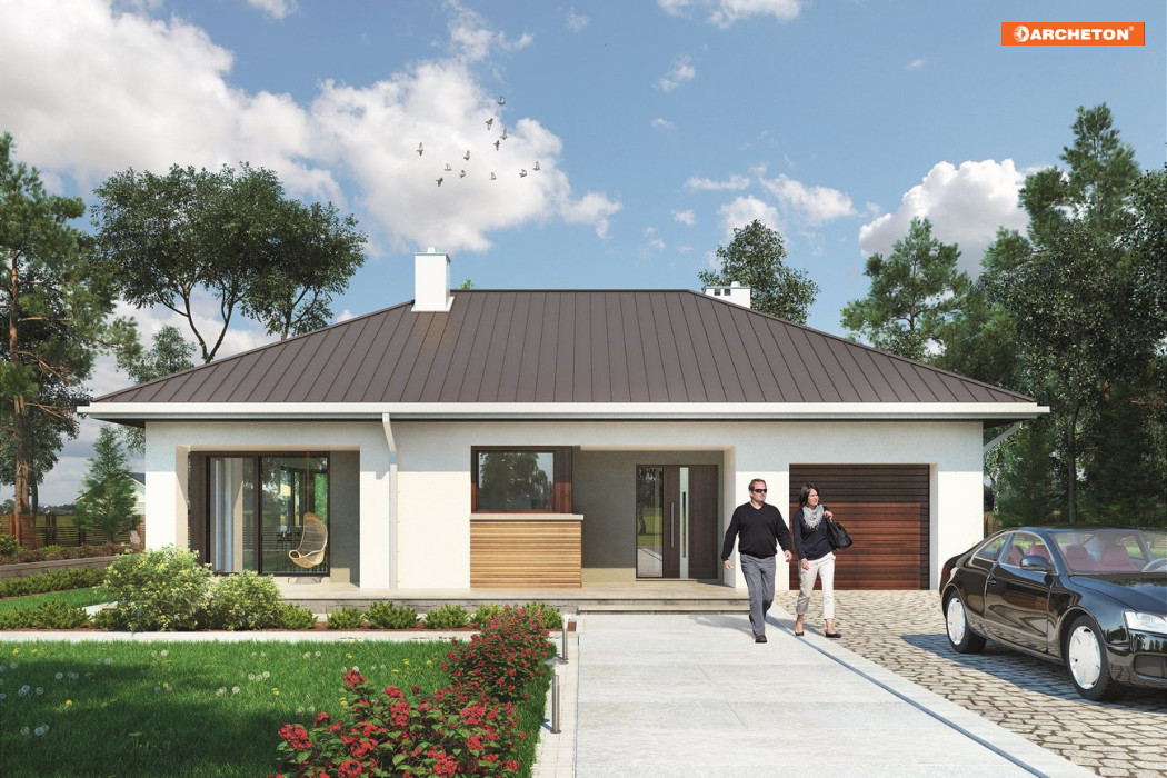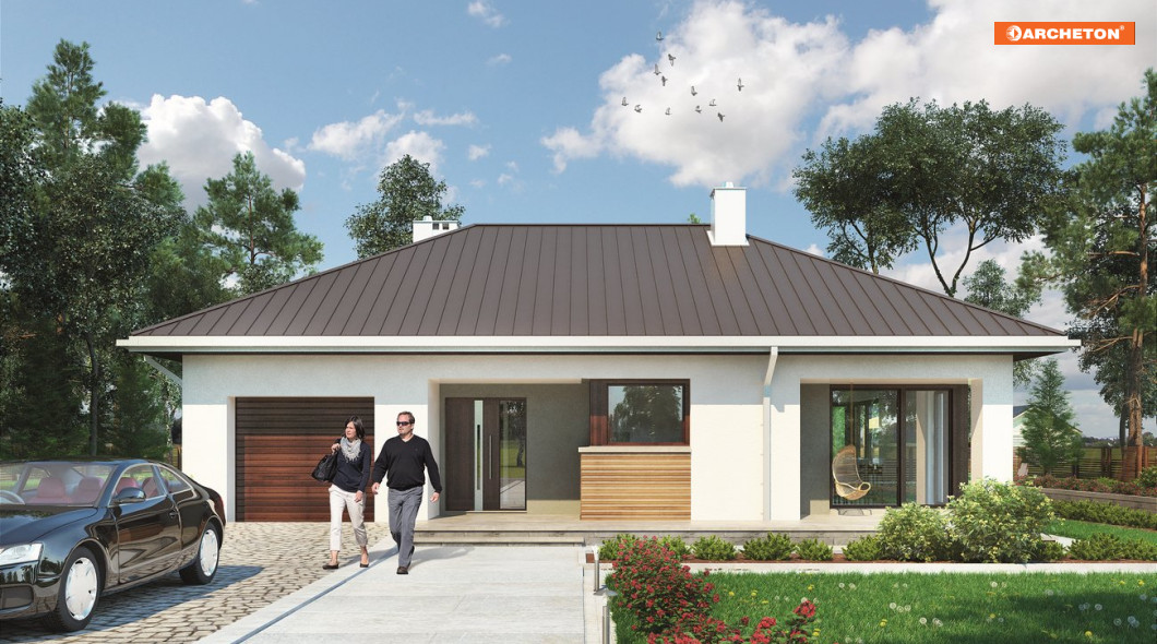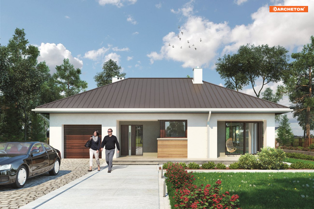Wśród domów parterowych o powierzchni użytkowej ok. 120m2, z jednostanowiskowym garażem, uwagę zwraca rodzina Tatiany. Pokazuje ona różne warianty domu atrialnego, z dużym, osłoniętym dziedzińcem ogrodowym. Projekt domu Tatiana Rex, inaczej niż nieco mniejsza Tatiana zbudowana na rzucie w kształcie litery T, wykorzystuje kształt litery L. W obu projektach, we frontowym skrzydle mieści się część dzienna złożona z wygodnej sieni i łazienki oraz z salonu z otwartą kuchnią w ryzalicie. Prostopadłe ramię budynku skierowano w każdym z rozwiązań w głąb parceli z przeznaczeniem na strefę nocną z czterema pokojami i z dużą łazienką. Różnice w połączeniu skrzydeł w Tatianie i Tatianie Rex wykorzystano dla zaproponowania innego układu części gospodarczej z łazienkami oraz wejścia do kuchni i spiżarni. Projekt domu Tatiana Rex proponuje też alternatywny wygląd domu w przypadku przekrycia z przenikających się dachów czterospadowych, a nie dwuspadowych, jak w Tatianie. Narożne okna i duże tafle szkła w obu wersjach potęgują efekt integracji rozłożystej, niskiej sylwety z otoczeniem