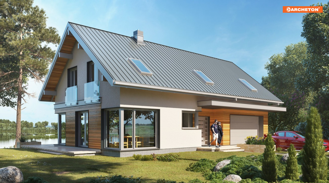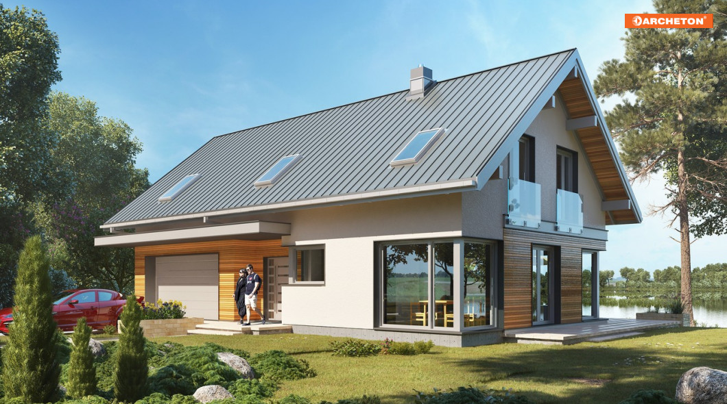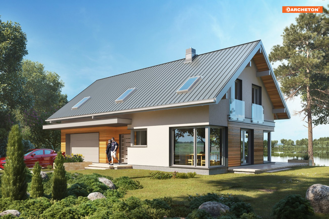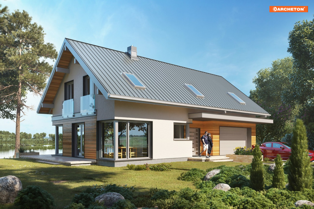 Projekt domu Zefir G2 ma najprostszą, energooszczędną bryłę na planie prostokąta wśród ekonomicznych propozycji domów z użytkowym poddaszem, o powierzchni ok. 125m2 i z dwustanowiskowym garażem. Rozwiązanie Zefira, w przeciwieństwie do Zofii G2, proponuje nad częścią mieszkalną i gospodarczą jeden tani, dwuspadowy dach, dlatego jego sylwetka wydaje się większa. Tym bardziej uzasadnione są duże narożne okna w salonie, które zastępują ciężkie kęsy murów lekkimi odbiciami otoczenia i wpuszczają mnóstwo światła. W pokoju dziennym kominek zaznacza podział otwartego parteru na kuchnię, jadalnię i salon. Garaż z dużą kotłownią dostępny jest z sieni. Cztery sypialnie z dużą łazienką zajmują jednopoziomowe (inaczej niż w Zofii G2) poddasze. Jego jasne pomieszczenia, z tradycyjnymi oknami w ścianach szczytowych, są ustawne i łatwe do funkcjonalnej aranżacji. Projekt domu Zefir G2 wyróżnia się najbardziej oszczędną konstrukcją, brakiem balkonów, lukarn w dachu i konsekwentnie zdyscyplinowanym rzutem. Tafle szkła efektownie kontrastują przepychem rozmiarów z surowością i umiarem formy tradycyjnej sylwetki domu.