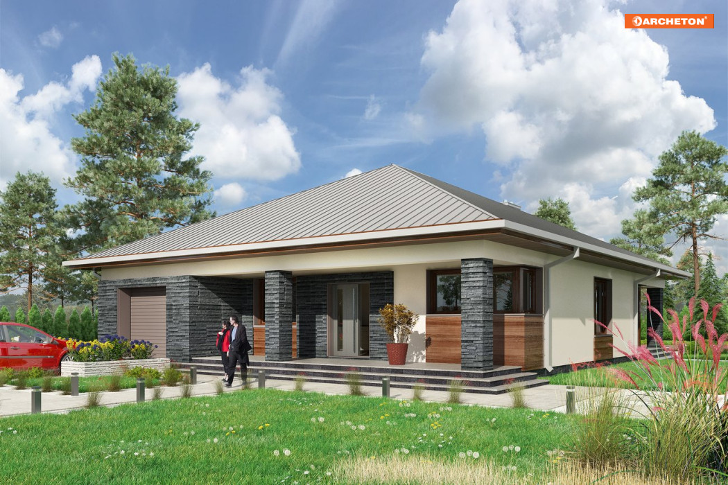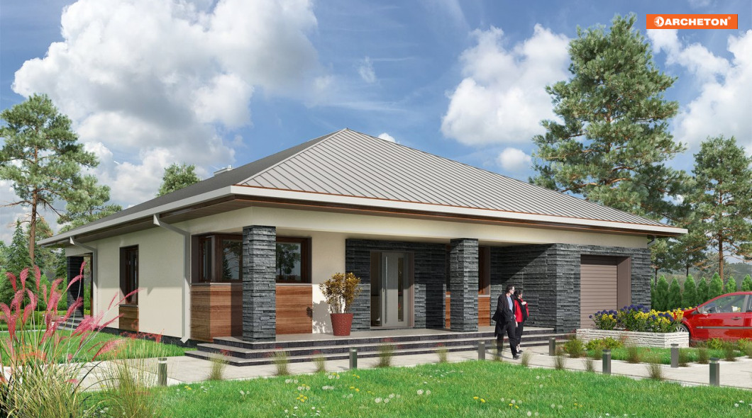 Jeden dach o prostokątnym zarysie nad całym planem budynku, razem z wnękami tarasów, kojarzy się zwykle z tradycyjnym, niewielkim domem. W przypadku większej parterowej bryły, z garażem, podobne rozwiązanie to w architekturze jednorodzinnej na naszym rynku rzadkość. Projekt domu Ajaks, będąc taką właśnie propozycją z dużym, czterospadowym dachem, jest nieco obszerniejszy od podobnego Bratka. Tak jak on odróżnia się od zbliżonej Kseni jednostanowiskowym garażem i bardziej wydłużonymi proporcjami rzutu. Rozrysowano na nim otwarty pokój dzienny z kuchnią oraz część prywatną dla 4-5 osób, z dwoma łazienkami. Ajaks zwraca uwagę alternatywną organizacją strefy wejściowej: gabinet ulokowano przy sieni, a przejście z mieszkania do garażu - w kotłowni dostępnej z holu. We wszystkich wymienionych koncepcjach poddasze jest nieużytkowe, ale dość wysokie. W projekcie parterowego domu Ajaks nachylenie połaci jest najmniejsze, a dach służy głównie ochronie mieszkania przed opadami i temperaturą. Nowatorską stylistykę Ajaksa podkreślają narożne okna i użycie różnych materiałów wykończeniowych dla wydobycia i zaakcentowania podziałów w długich elewacjach.