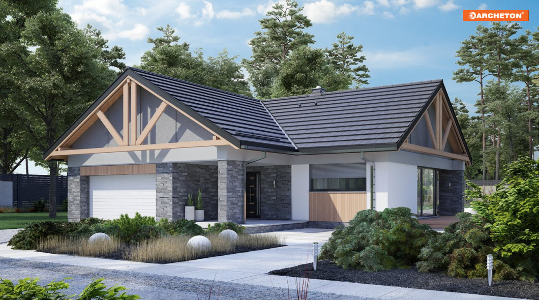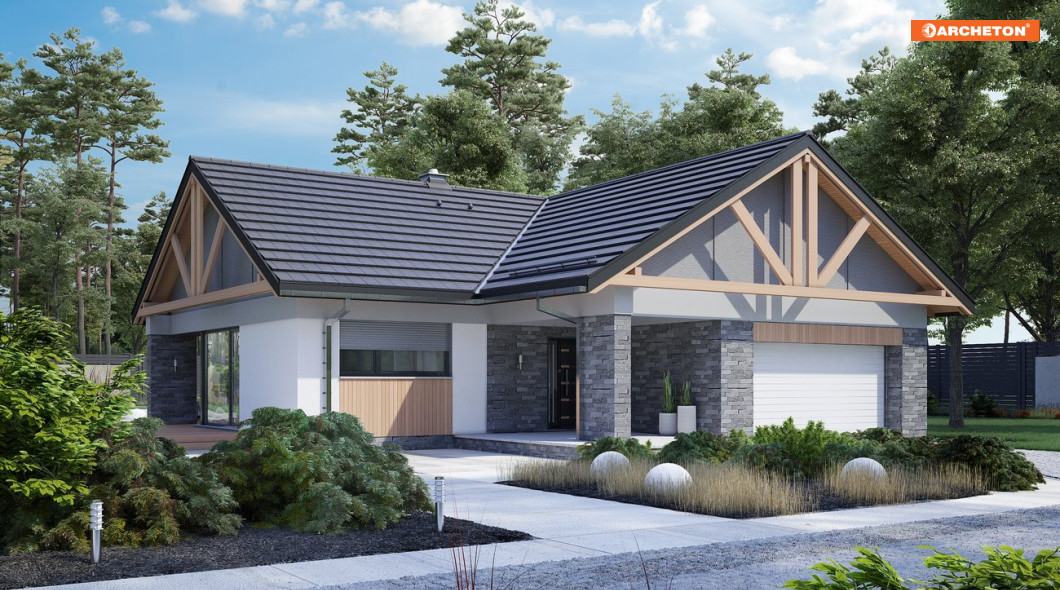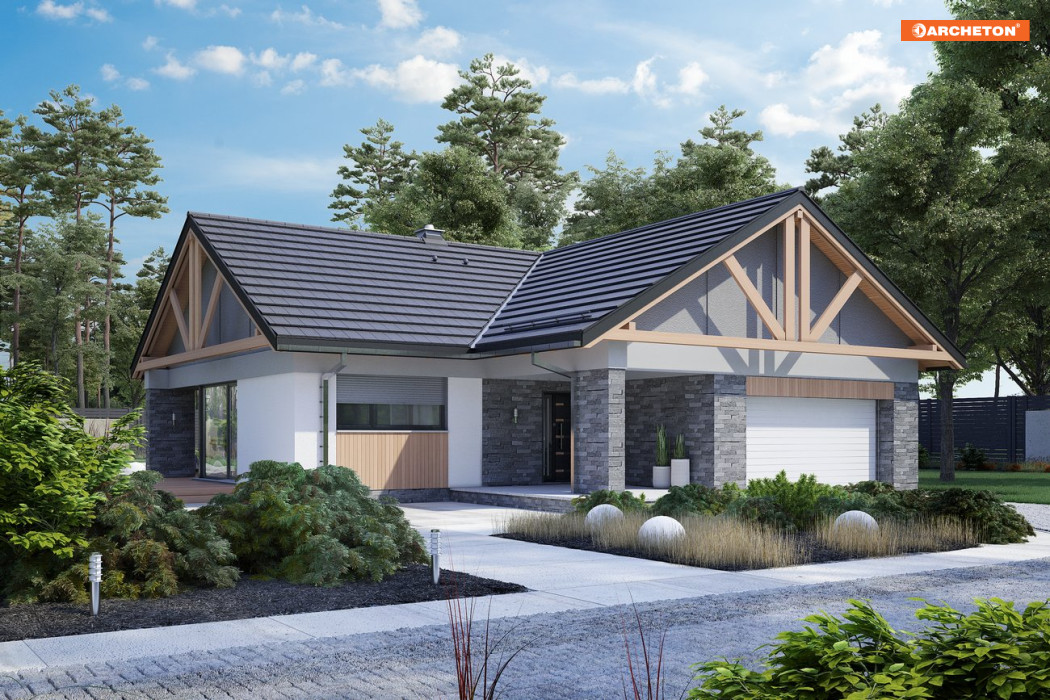 Rodzinę Artemidy tworzą parterowe domy z dwustanowiskowym garażem, o niskiej sylwetce z dwuspadowymi, łagodnymi dachami tej samej wysokości. Podobny jest plan w kształcie litery T, program użytkowy i detal architektoniczny: wykończenie szczytów widocznymi wiązarami i ścianki parawanowe osłaniające duże przeszklenia od ogrodu. Rzut jest w projekcie domu Artemida Rex krótszy i węższy niż w większych siostrzanych wersjach ale różnice te przekładają się jedynie na ilość sypialni i pomieszczeń pomocniczych. Strefa frontowa pozostaje niemal identyczna w całej rodzinie. Dzięki rezygnacji z osobnej pralni, otwarty na hol pokój dzienny z dużą kuchnią wyposażoną w spiżarnię i wyspę ma w projekcie domu Artemida Rex tę samą wielkość, co w wariancie Polo. Ta rodzinna strefa wspólna mieści się w skrzydle równoległym do drogi dojazdowej. Prostopadłe ramię planu ze strefą nocną zajmują trzy sypialnie dla czterech osób i gabinet. Wsunięte w głąb ogrodu i oddzielone od holu strefą łazienek zapewniają ciszę i komfort. Ku frontowi, jak w wariancie Artemida i Artemida Polo, wysuwa się podwójny garaż z kotłownią, akcentując ścianą szczytową wejście główne w cienistej wnęce.