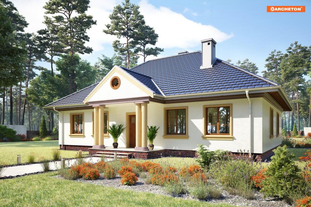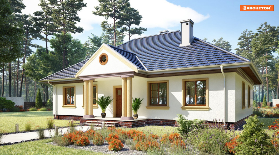 Dom Aleksandria Bona zaprojektowano w tradycyjnym stylu dworkowym, którego cechami charakterystycznymi są trójkątne frontony nad drzwiami wejściowymi i tarasowymi, ozdobne kolumny, ceglana podmurówka czy okna ze szprosami, które okalają szerokie opaski, kontrastujące kolorystycznie z jasną elewacją. Dzięki temu projekt ten dobrze wpisze się w oczekiwania miłośników klasycznej elegancji, poszukujących jednocześnie rozwiązań funkcjonalnych i praktycznych.