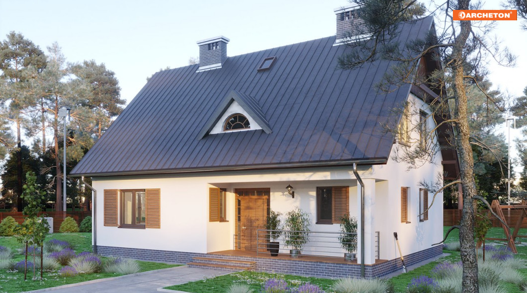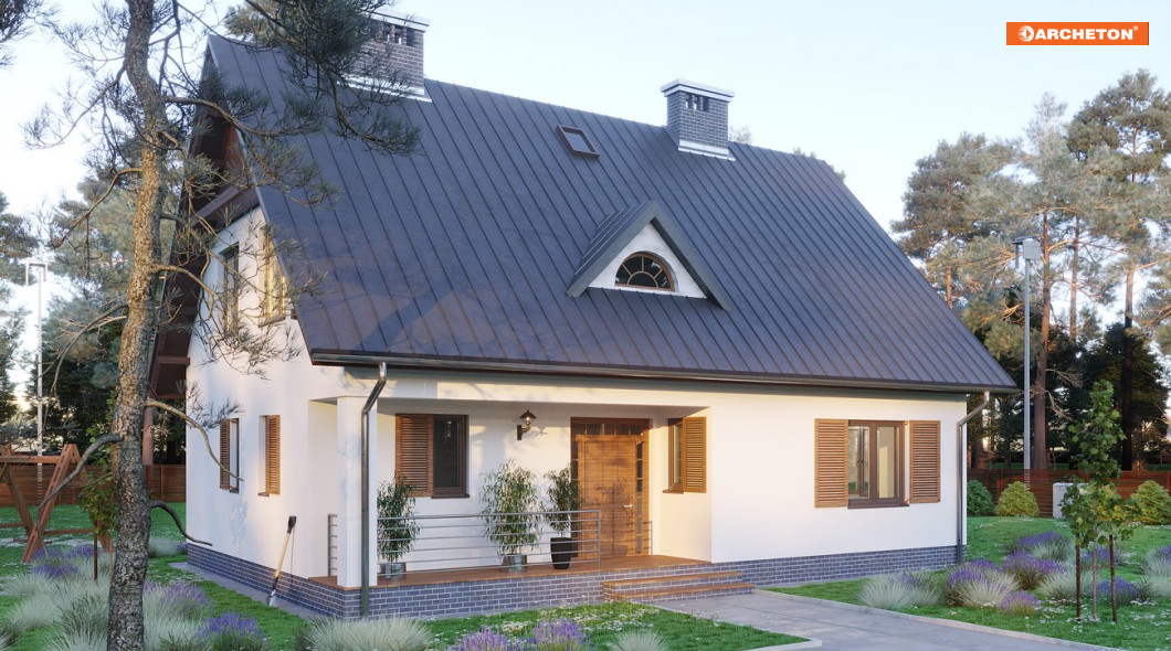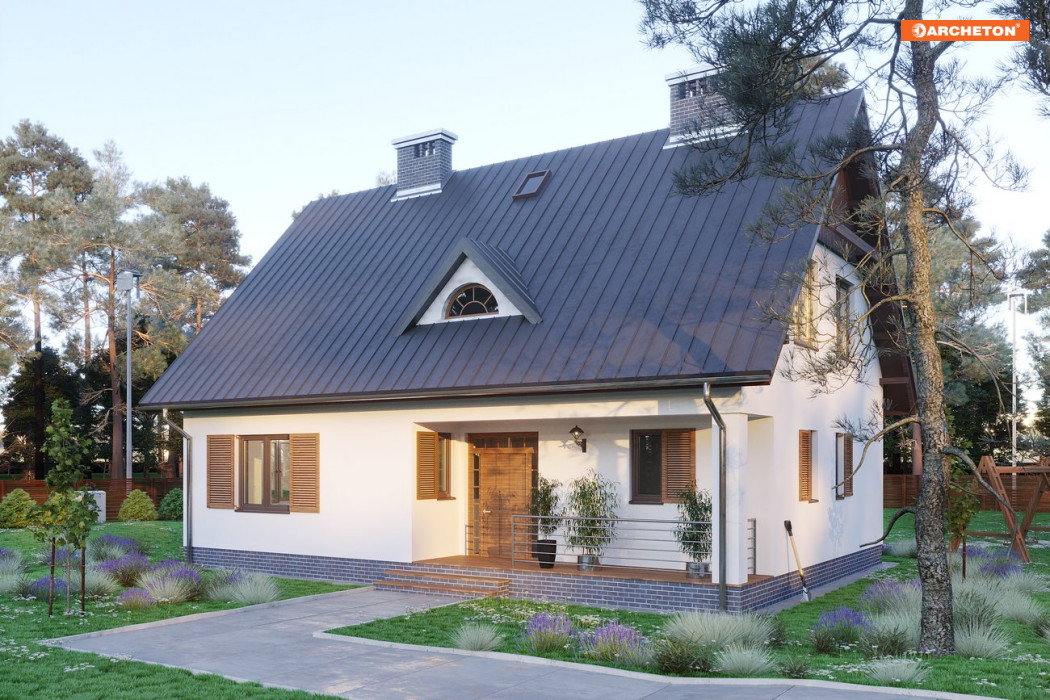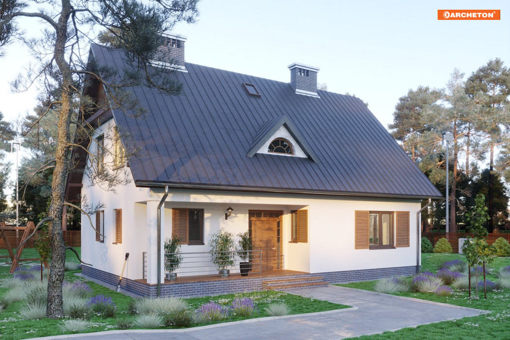 Wejście z podcienia przez wiatrołap do holu, z którego możemy się dostać do kuchni z jadalnią połączoną z pokojem dziennym mieszczącym kominek, niewielkiego gabinetu, łazienki i pomieszczenia technicznego. Szafa na ubrania znajduje miejsce pod schodami. Na poddaszu mieszczą się 3 sypialnie, łazienka i garderoba. Prosty, przytulny dom o zwartej bryle urozmaiconej podcieniem od strony wejścia. Dwuspadowy dach o kącie nachylenia połaci 45° wzbogacony jest dwoma lukarnami - jedną doświetlającą klatką schodową, drugą nad wejściem.