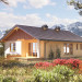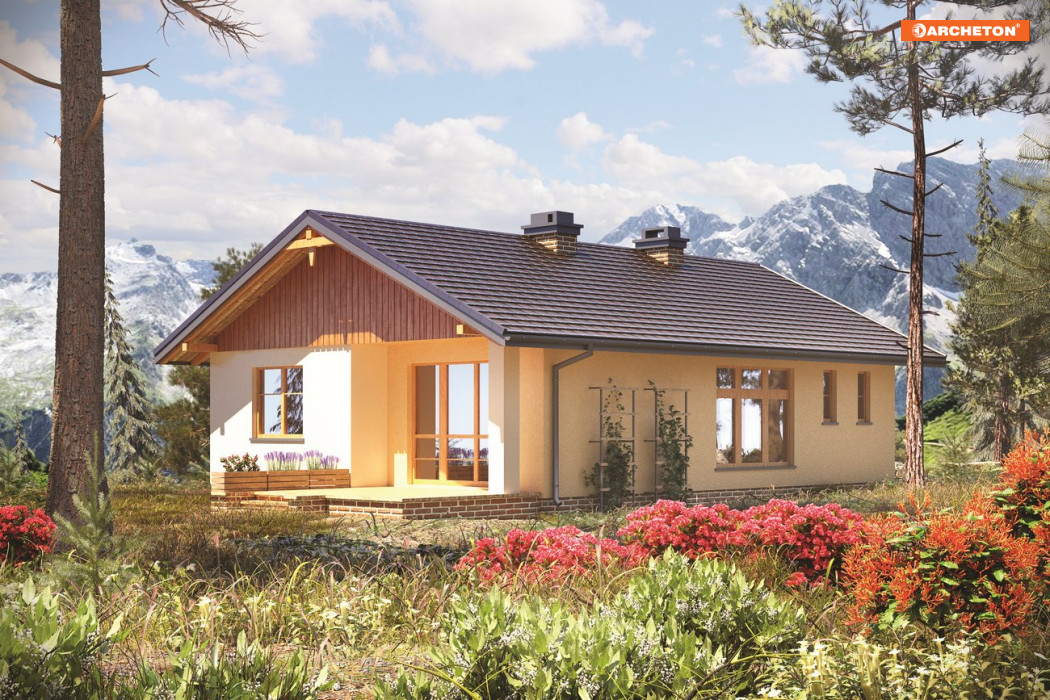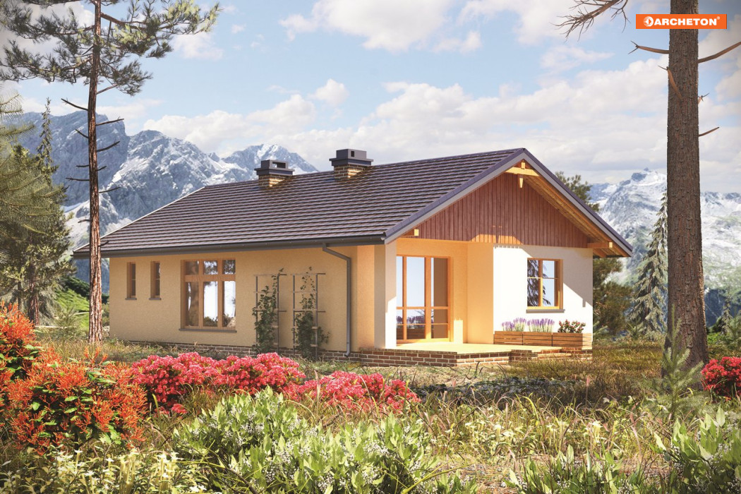 dzienny z jadalnią, kuchnia, spiżarka, schowek, 2 pokoje i łazienka. Obok Nuty i Agaty, projekt domu Miodunka reprezentuje małe parterowe domy bez garażu zbudowane na planie wydłużonego prostokąta. Mają zbliżony program użytkowy, dwuspadowy, niezbyt stromy dach i powierzchnię ok. 80m2. Miodunkę wyróżnia wejście w krótszej ścianie i oszczędny detal architektoniczny. Niewysoki budynek dobrze wpisze się w wąską, głęboką działkę, zwrócony szczytem do drogi dojazdowej. W dwóch traktach konstrukcyjnych przewidziano: po jednej stronie otwarty pokój .dzienny, a po drugiej komunikację z sypialniami i łazienkę z kotłem gazowym. W holu obie strefy rozdziela praktycznie szafa. Obie części mieszkania są przesunięte względem siebie na głębokość, która od frontu wyznacza wejściową wnękę, a od ogrodu zapewnia cień nad tarasem przy salonie. Są to jedyne urozmaicenia w energooszczędnej sylwetce projektu domu Miodunka. Prostej architekturze łatwo nadać dowolny styl zgodnie z charakterem otoczenia i przeznaczeniem projektu: na podmiejski dom całoroczny lub letniskowy, w naturalnym krajobrazie.