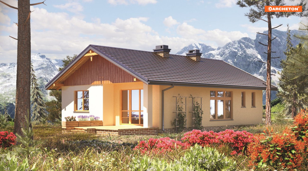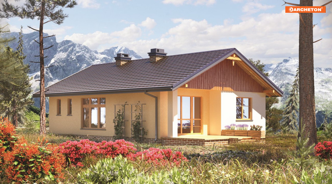 Mały dom dla 3-4 osób. Na parterze znajdują się: sień, podłużny hol, pokój