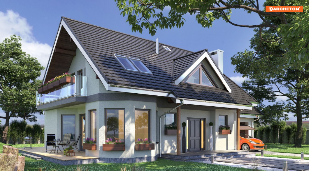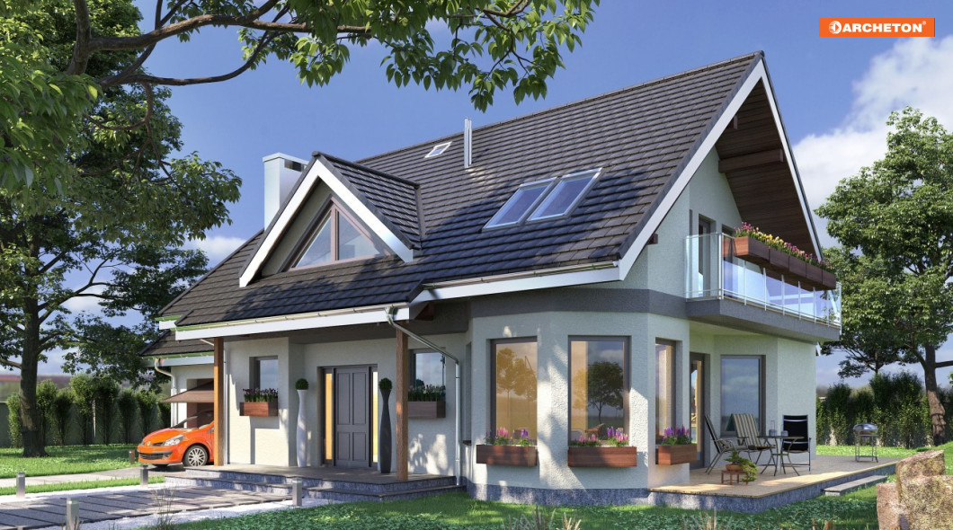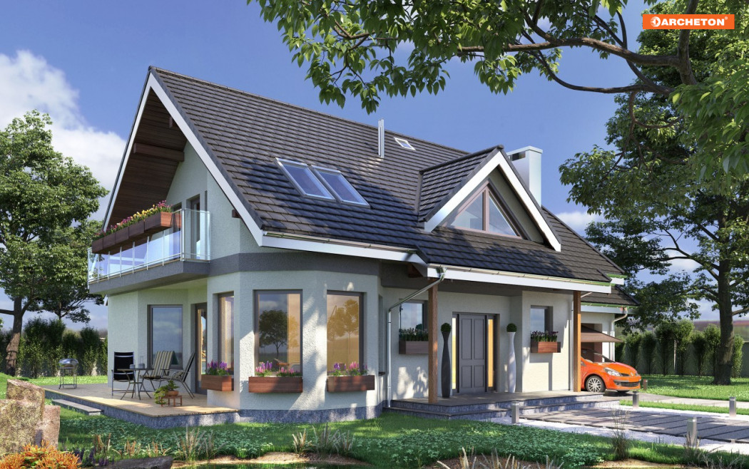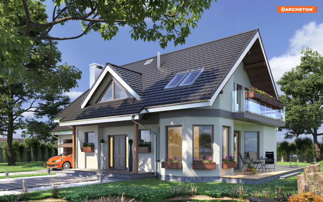 Projekt domu Maja Grota jest jednym z najmniejszych w liczącej kilkanaście wariantów Rodzinie Mai, zbliżonej do Rodziny Majki. Obie wyróżnia, wśród małych i średnich domów z dobudowanym garażem, fantazyjna sylwetka z narożnym, oktagonalnym ryzalitem. Przełamanie geometrii kąta prostego kształtuje przylegające do niego detale bryły: zadaszoną wnękę wejścia, taras dostępny z salonu przy ścianie bocznej i ocieniający go balkon. Rozkład wnętrza w projekcie domu Maja Grota przypomina wszystkie koncepcje Mai i Majki. Pokój dzienny urozmaica ośmiokątna jadalnia przy kuchni ale salon jest bardziej przysłonięty od holu, a zabiegowe schody rozrysowano na układzie dwóch biegów. Pozostałe wersje proponują większe powierzchnie mieszkania i garażu, różne umiejscowienie kotłowni i dodatkowy pokój na parterze. Strefa nocna na poddaszu pozwala na indywidualną aranżację prywatnej przestrzeni dla domowników, bo każdy z trzech pokoi Mai ma inny kształt i sposób doświetlenia. Projekt domu Maja Grota, jak większość w rodzinie, ma osobne dachy nad częścią mieszkalną i garażową ale jako jedyny z mniejszych wariantów proponuje pełne podpiwniczenie z kotłownią.