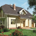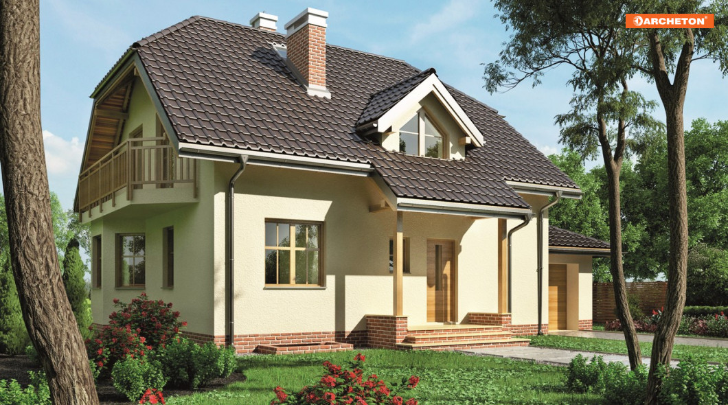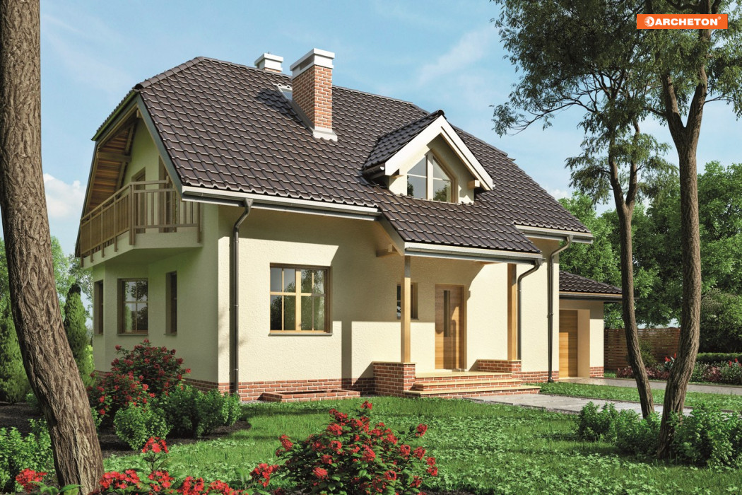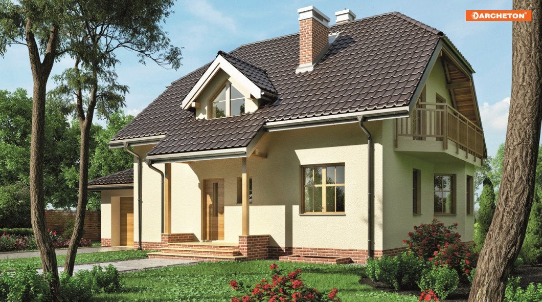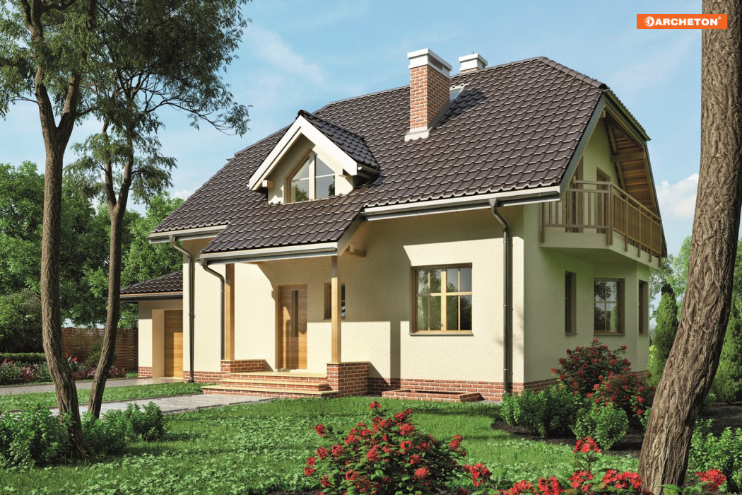 Wejście do budynku przez sień do holu, skąd na wprost można wejść do pokoju dziennego otwartego przestrzennie na kuchnię. Z holu dostępne są również łazienka i dodatkowy pokój, a także schody prowadzące do piwnicy i na poddasze. W piwnicy znalazła miejsce kotłownia i pomieszczenie gospodarcze. Na poddaszu zlokalizowano: 3 sypialnie i łazienkę. Garaż dostępny jest jedynie z zewnątrz. Budynek uzyskał ciekawą formę dzięki zastosowaniu dachu dwuspadowego (40°) oraz dostawieniu bryły garażu z dachem trzyspadowym (25°). Budynek rozbudowano wykuszem pokoju dziennego, balkonem i lukarnami dachu głównego.